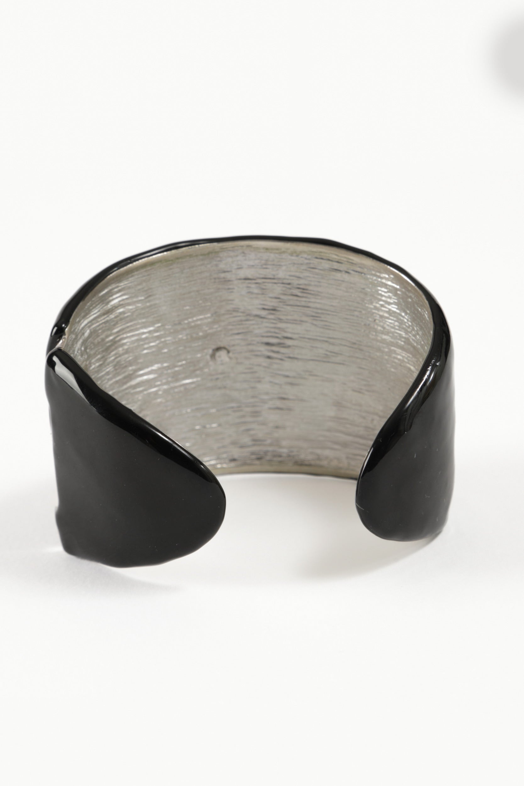 1990s Kenneth Jay Lane bracelet in shiny black enameled metal with a central Art Deco-style decoration in rhinestones, baguette crystals, and a coral cabochon. Made in the USA.