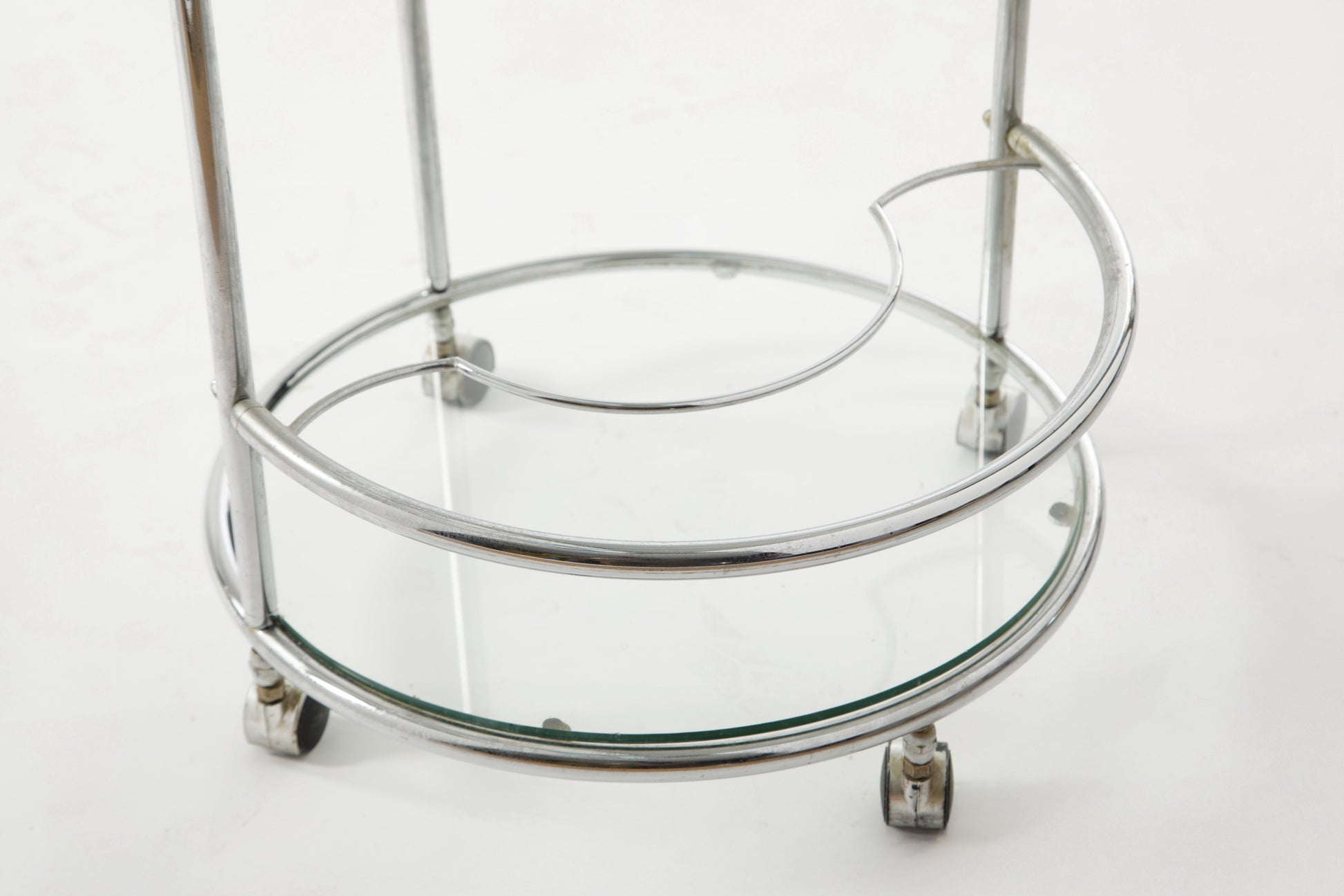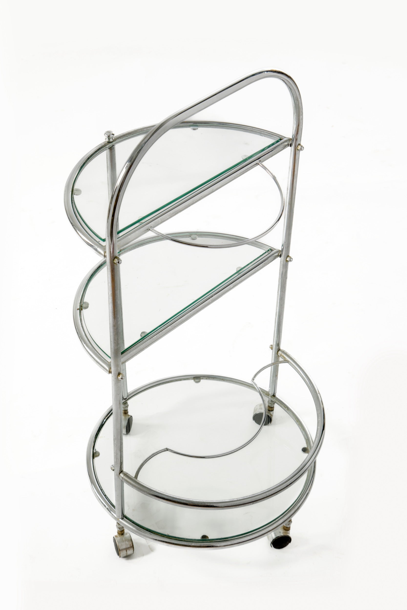 Round trolley from the 1970s, tubular steel frame, three glass shelves with bottle holder. Made in Italy.