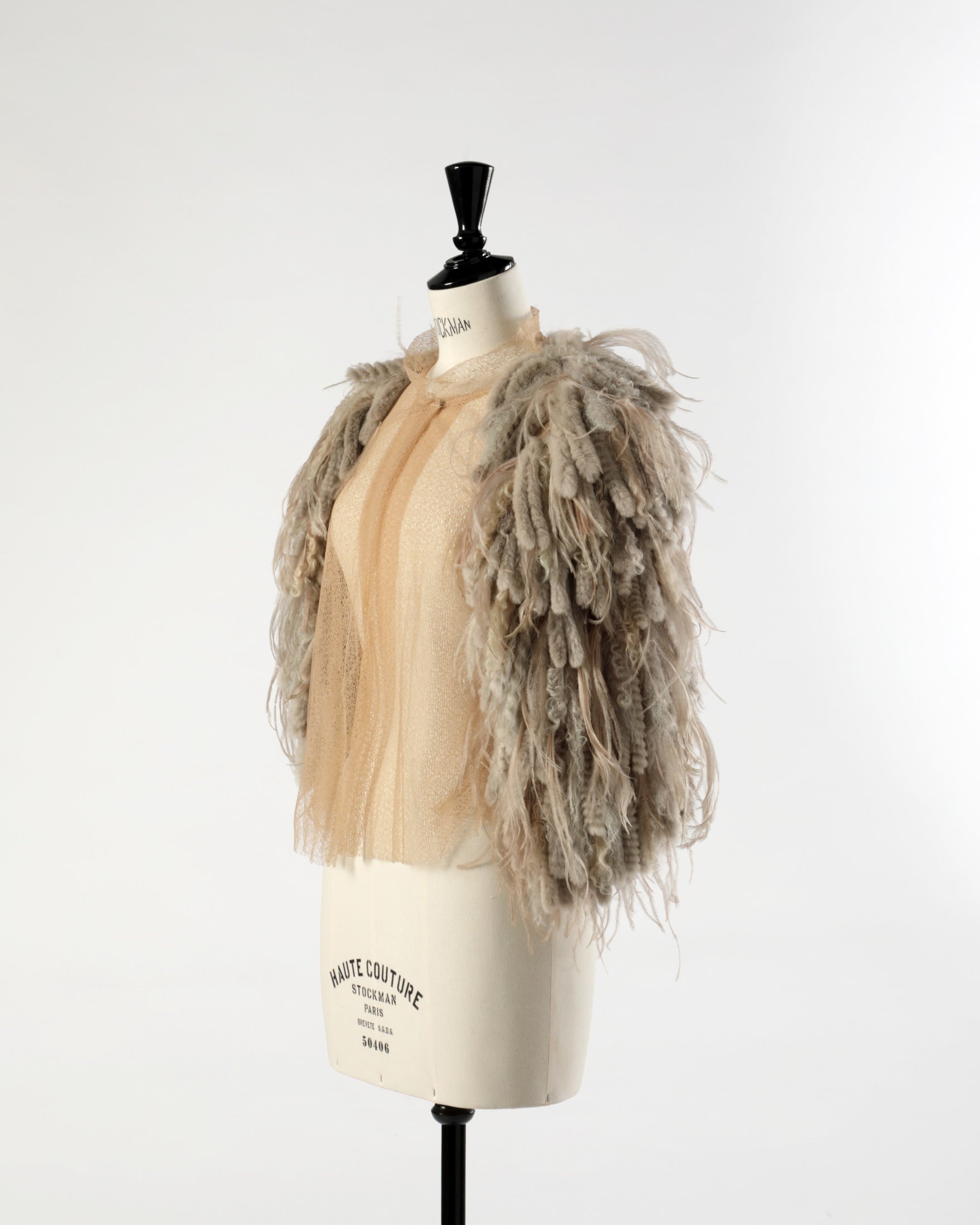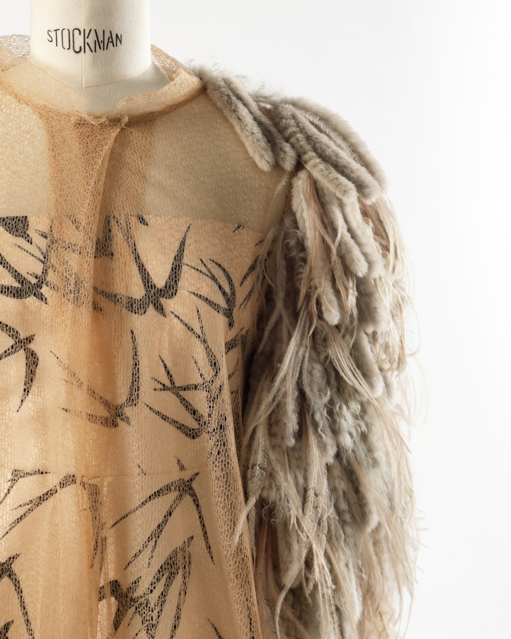 Fendi 90s shawl in nude tulle, fur fringes and ostrich feathers.