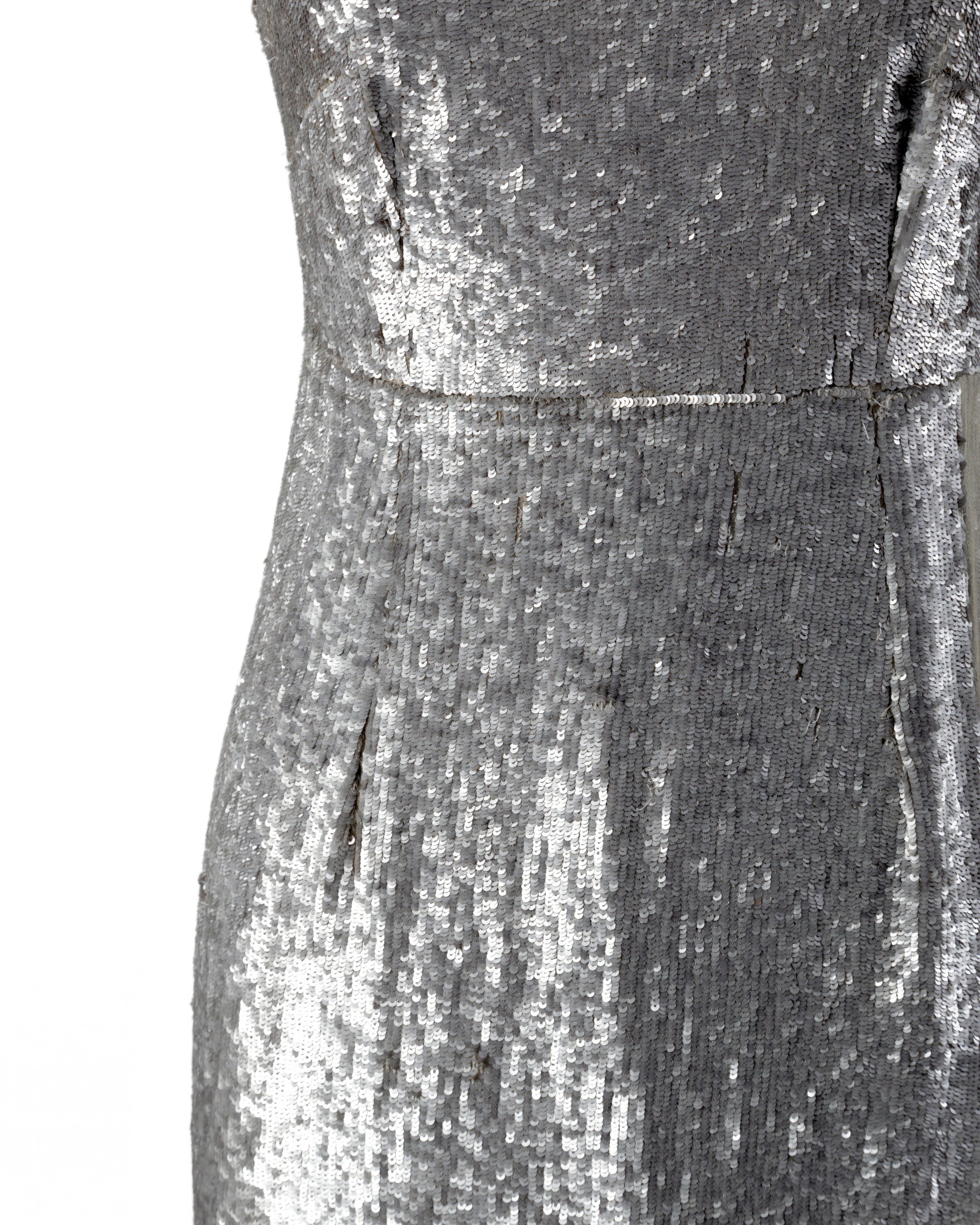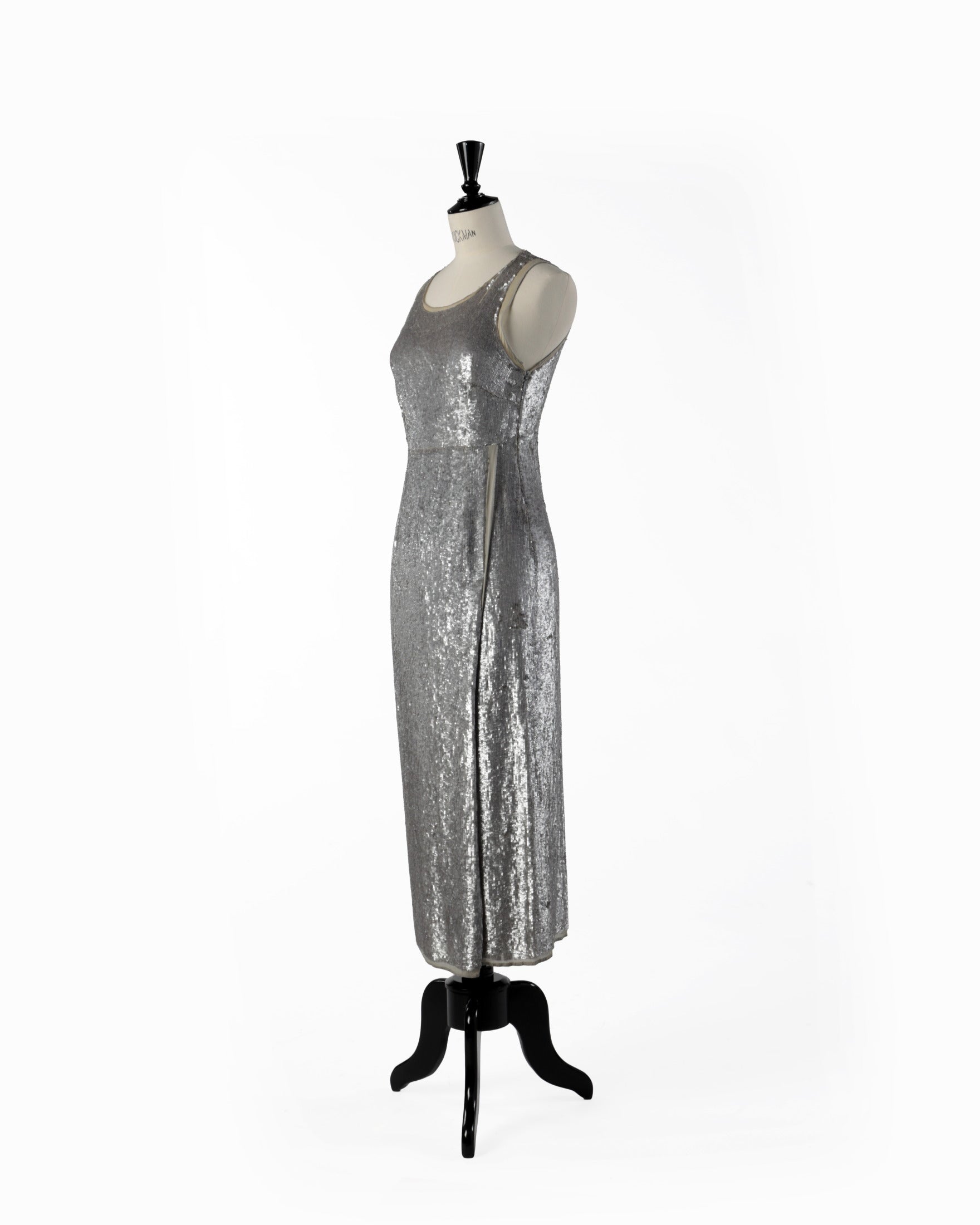 Abito Fendi anni 90 in paillettes argento, bordi in chiffon in tinta, scollo a canottiera, taglio in vita, gonna a portafoglio con spacco.