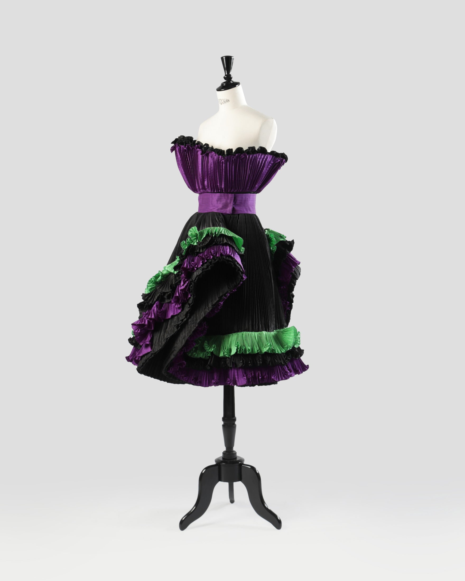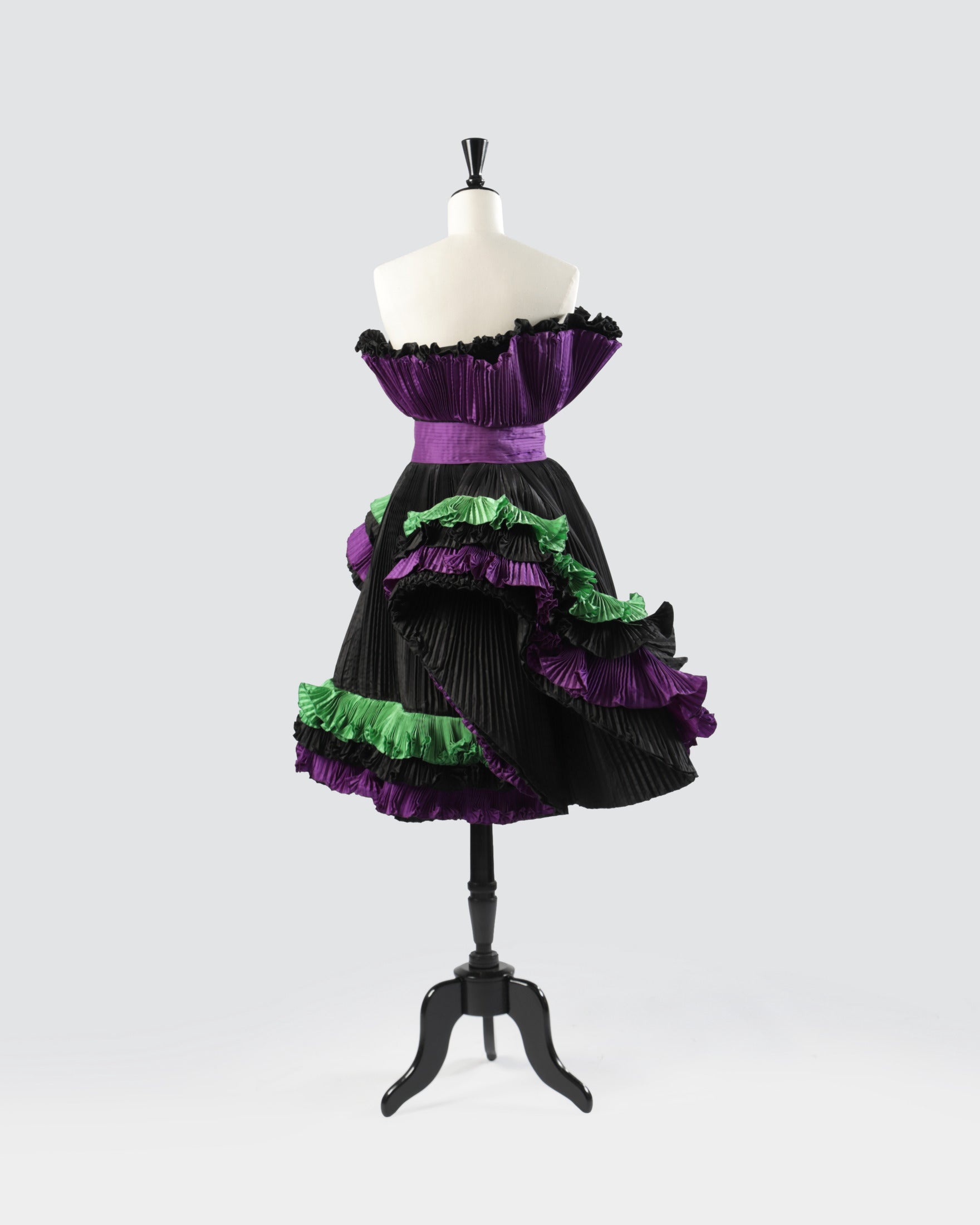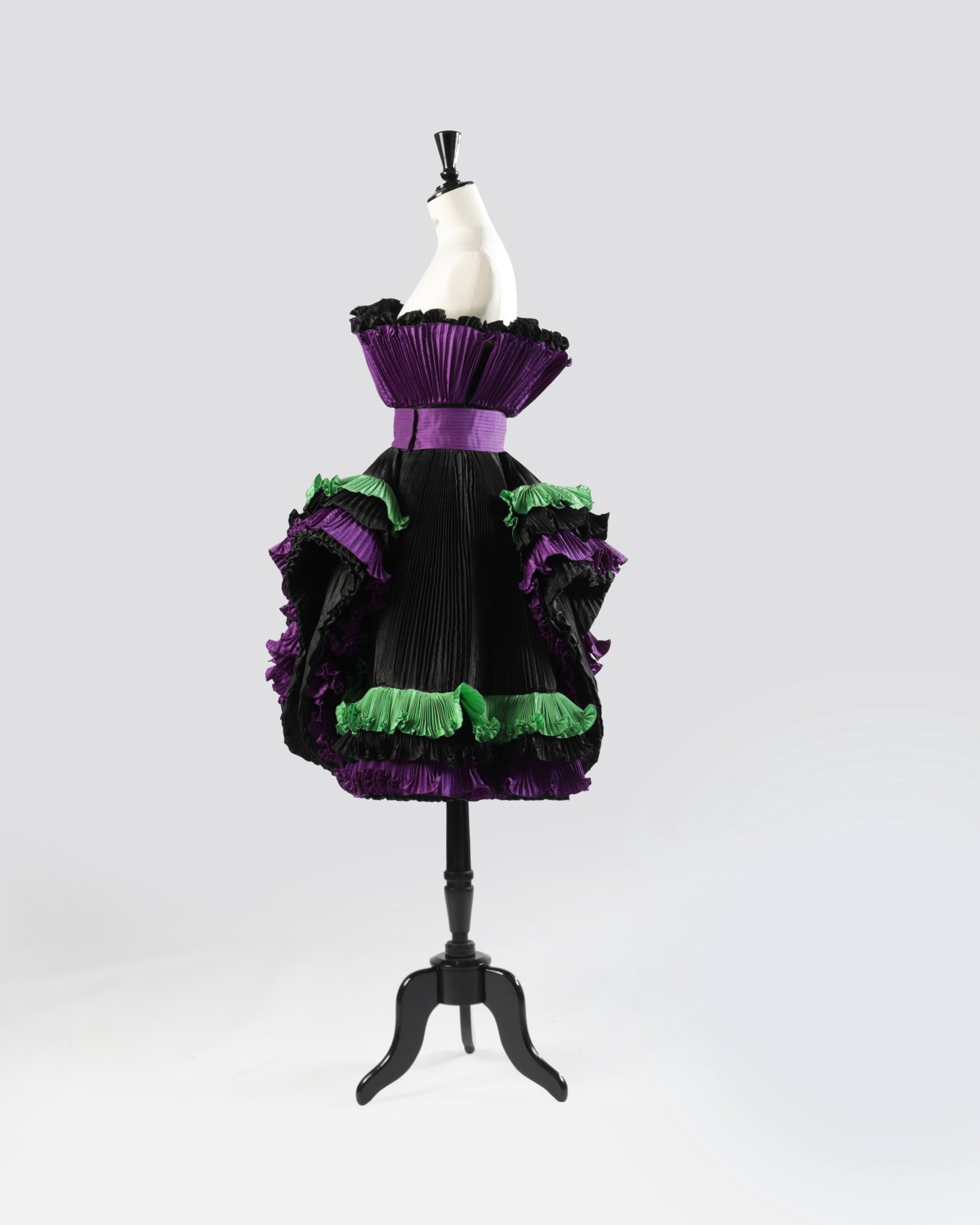 Abito-scultura anni ’80 di Roberto Capucci, a spalla scoperta con gonna al ginocchio. Realizzato in tessuto tecnico plissé tricolore. Linea svasata sul petto con fascia centrale e ampie bande sbalzate applicate su gonna. Made in Italy