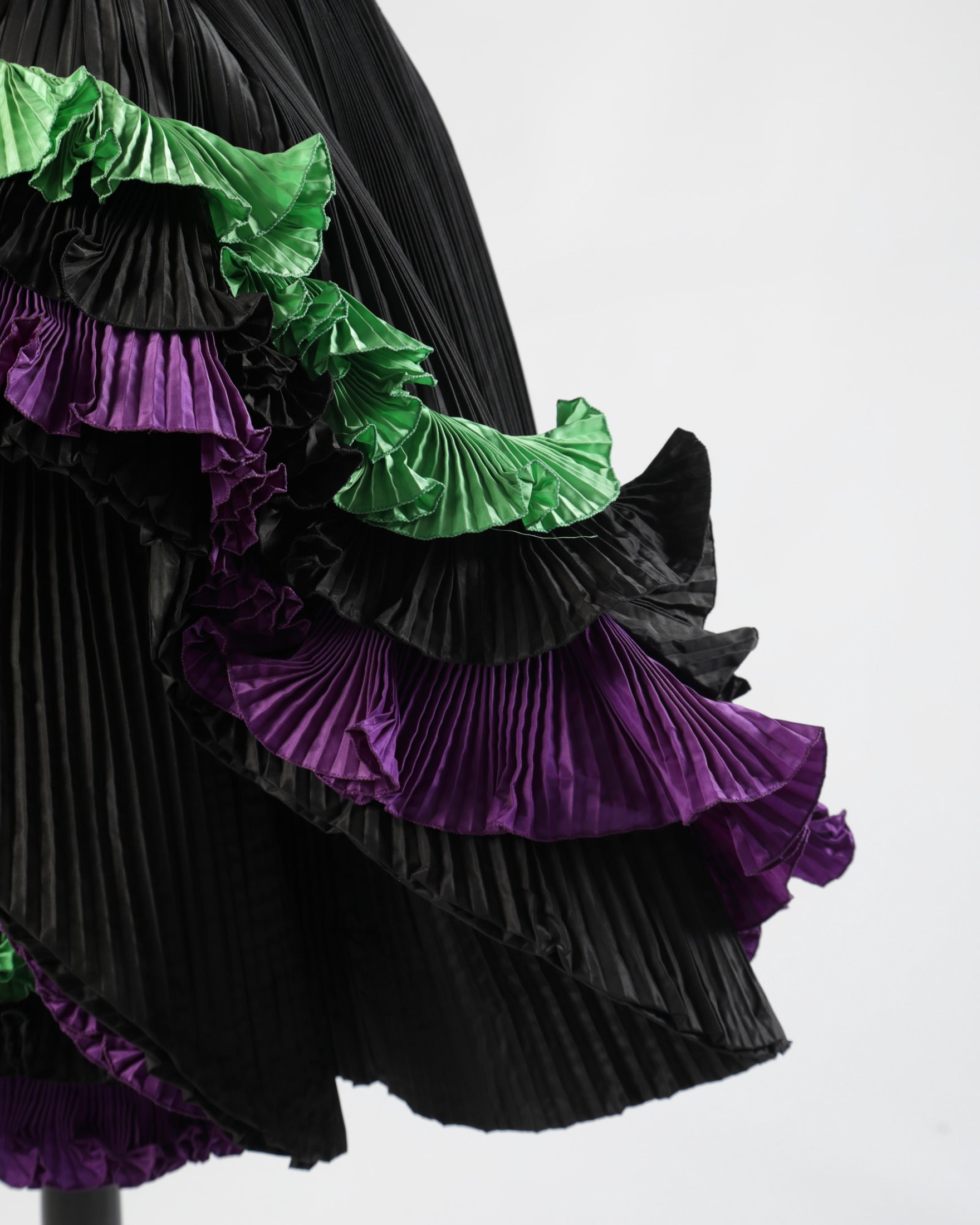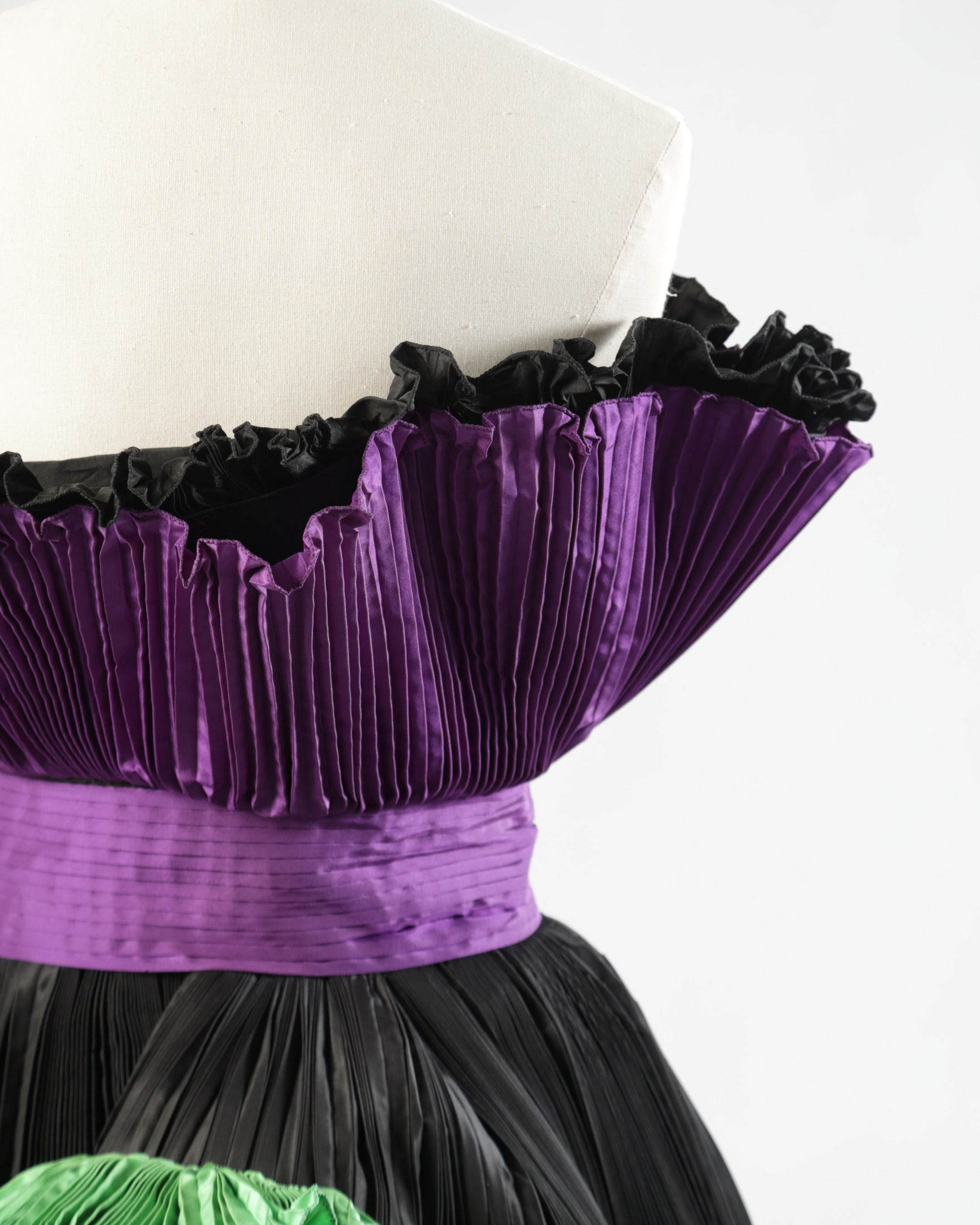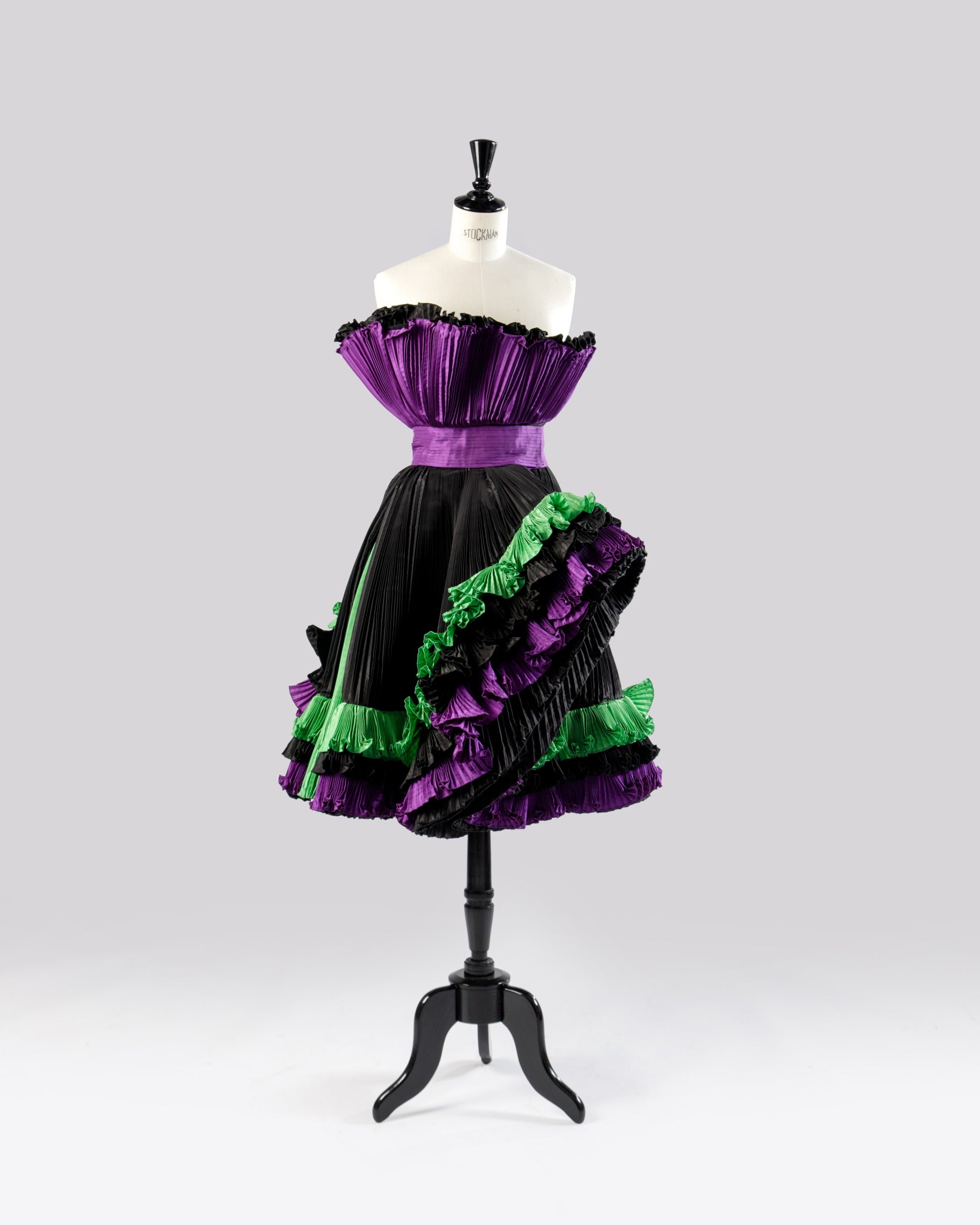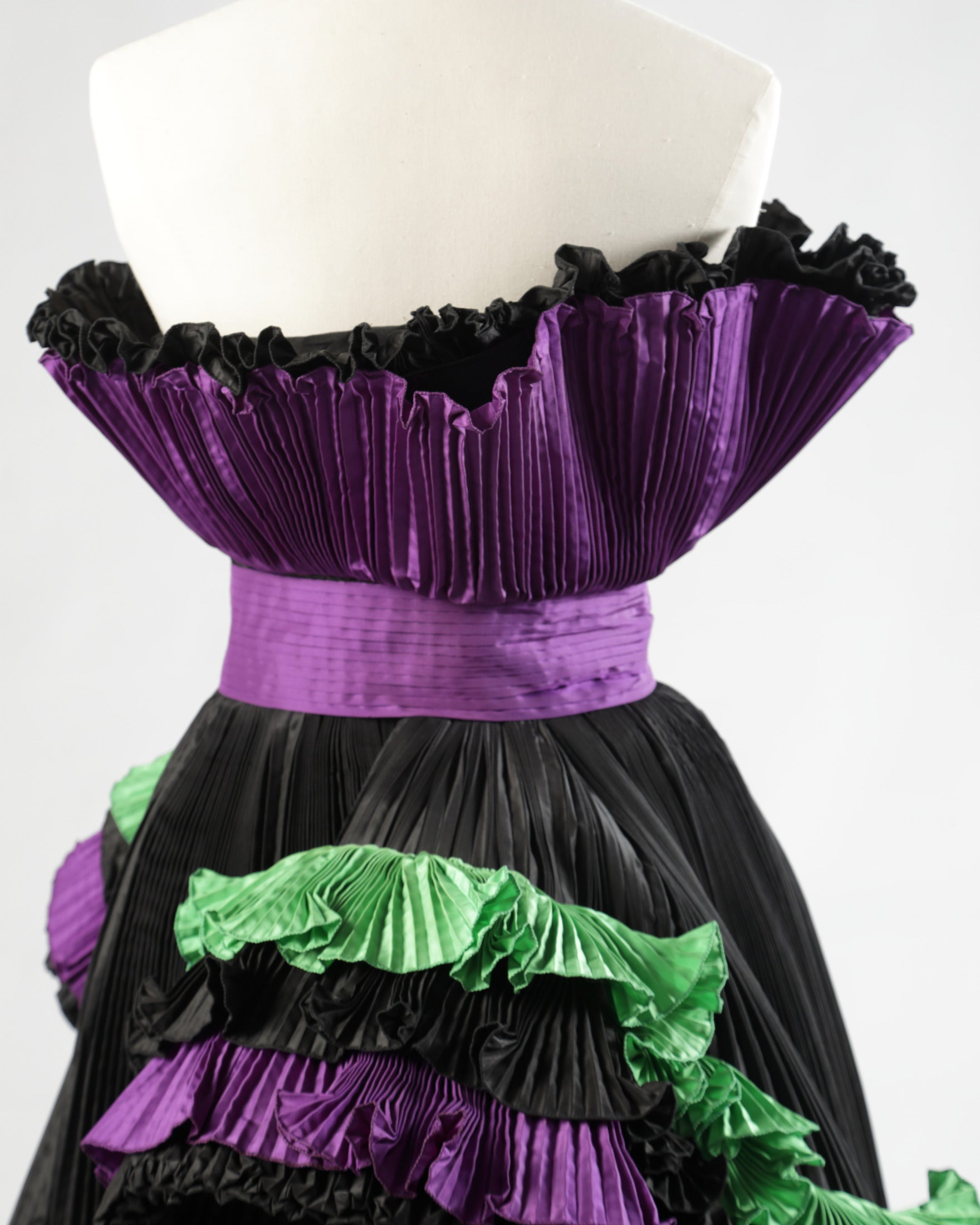 Abito-scultura anni ’80 di Roberto Capucci, a spalla scoperta con gonna al ginocchio. Realizzato in tessuto tecnico plissé tricolore. Linea svasata sul petto con fascia centrale e ampie bande sbalzate applicate su gonna. Made in Italy