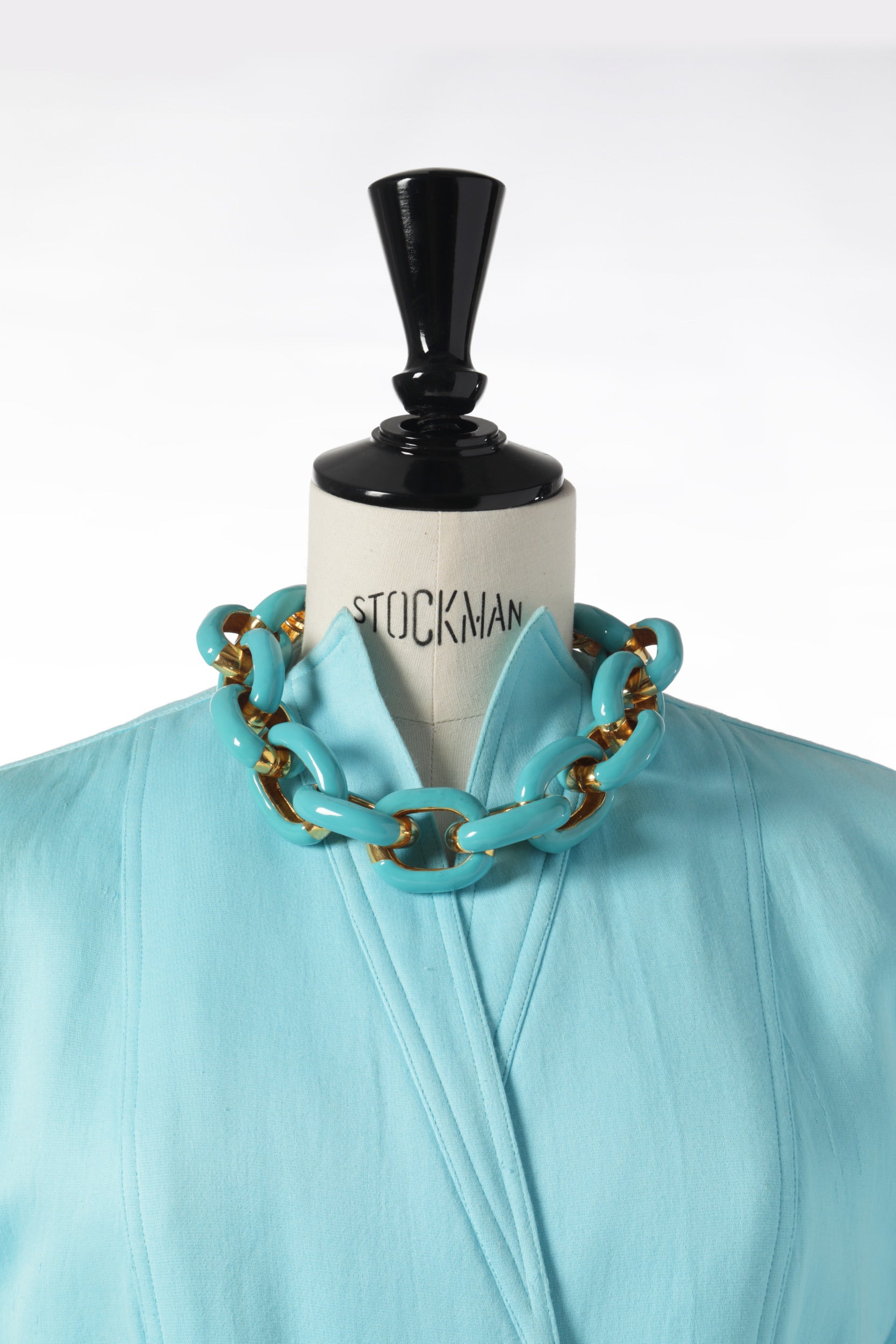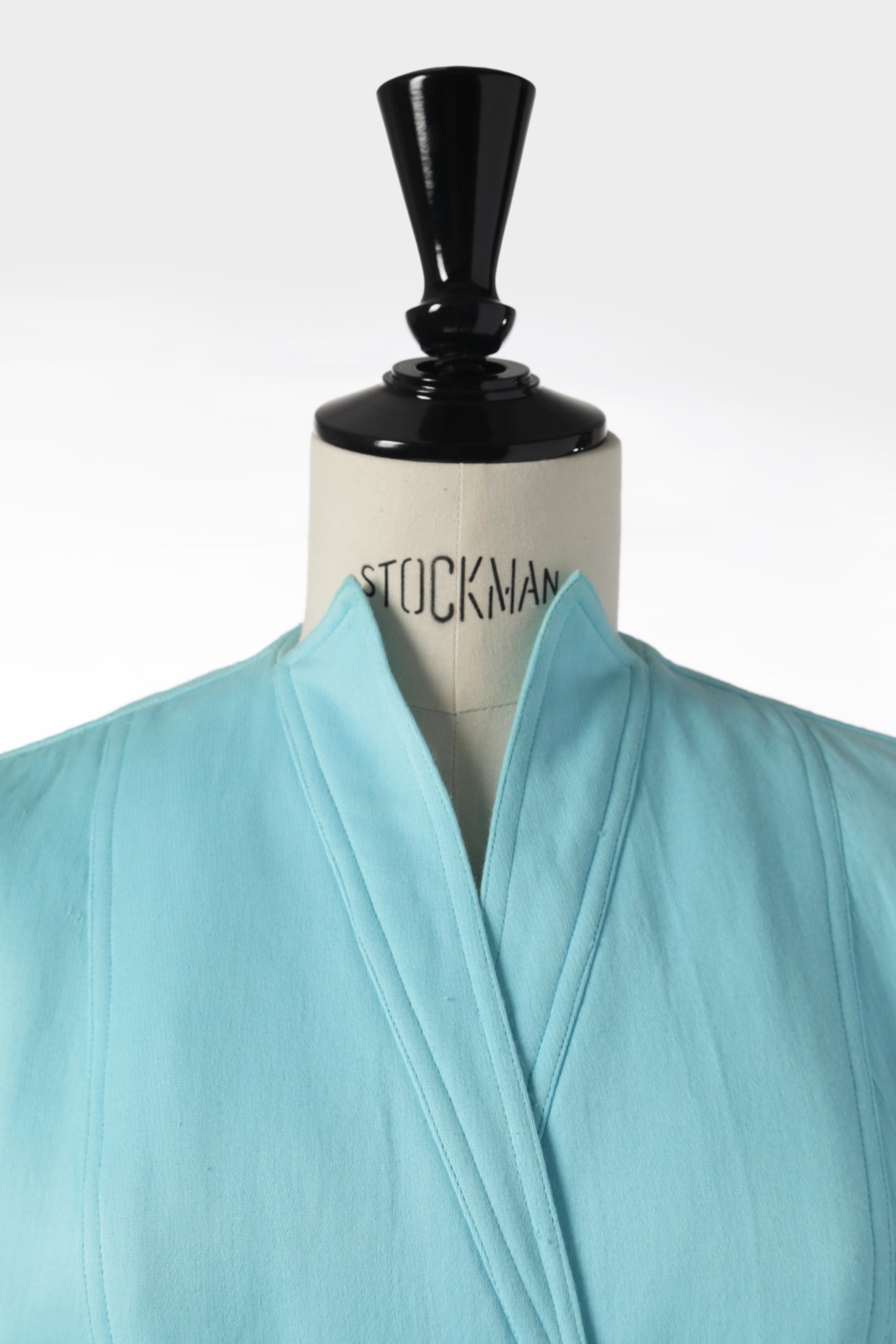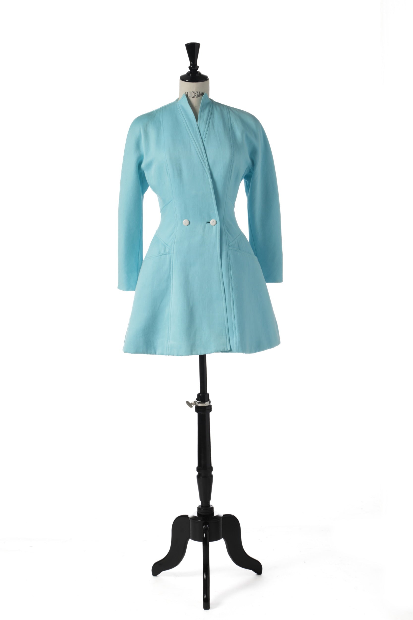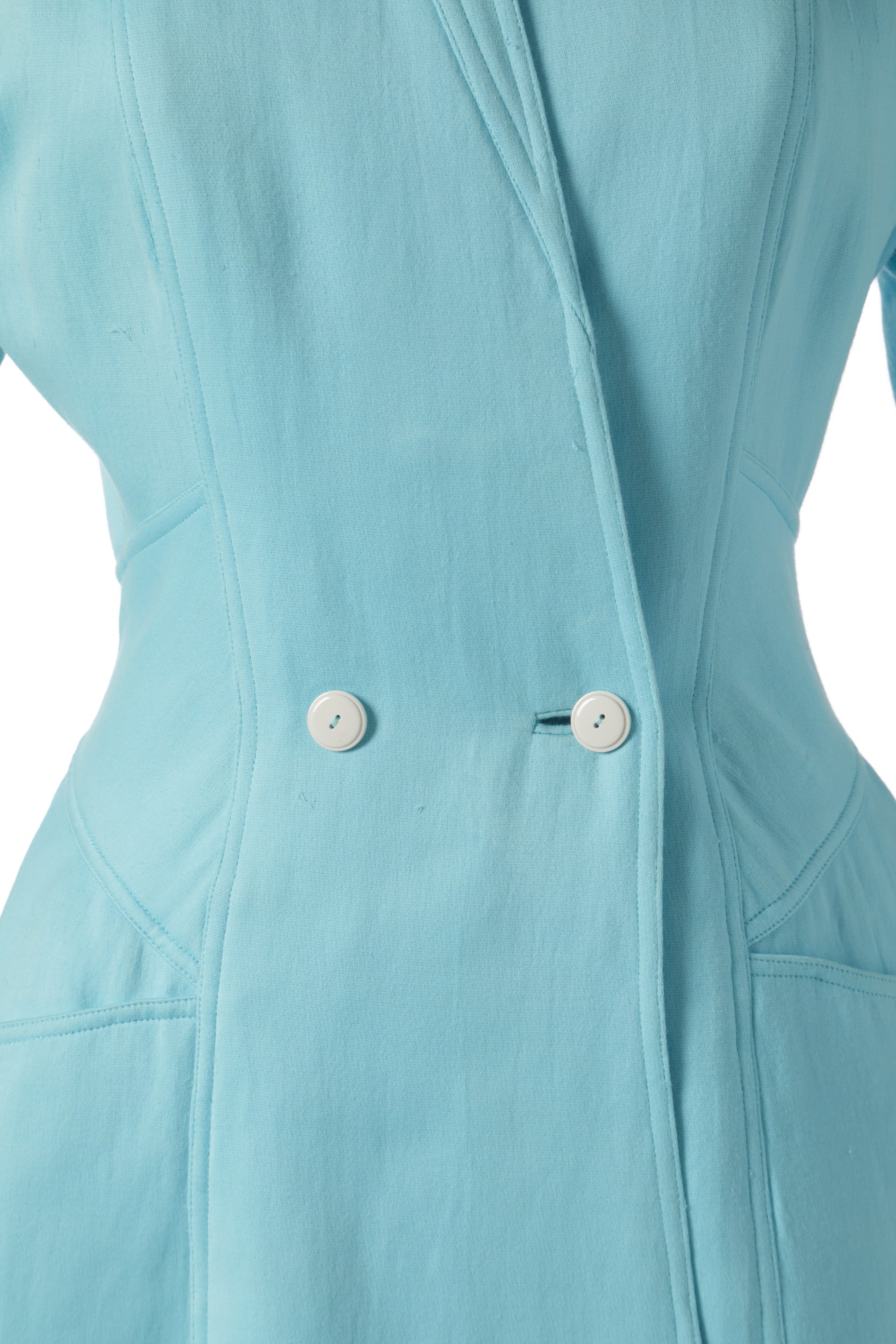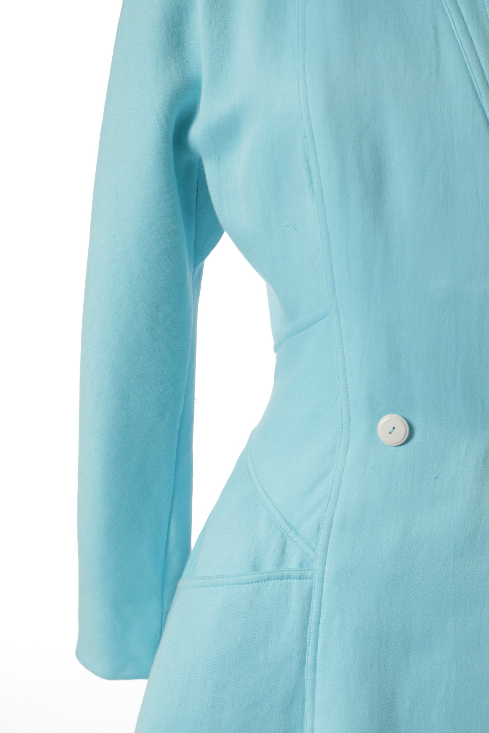 Blazer anni ’80 disegnato da Karl Lagerfeld per Fendi, realizzato in lana celeste con collo alla coreana e tasche frontali a taglio. Made in Italy