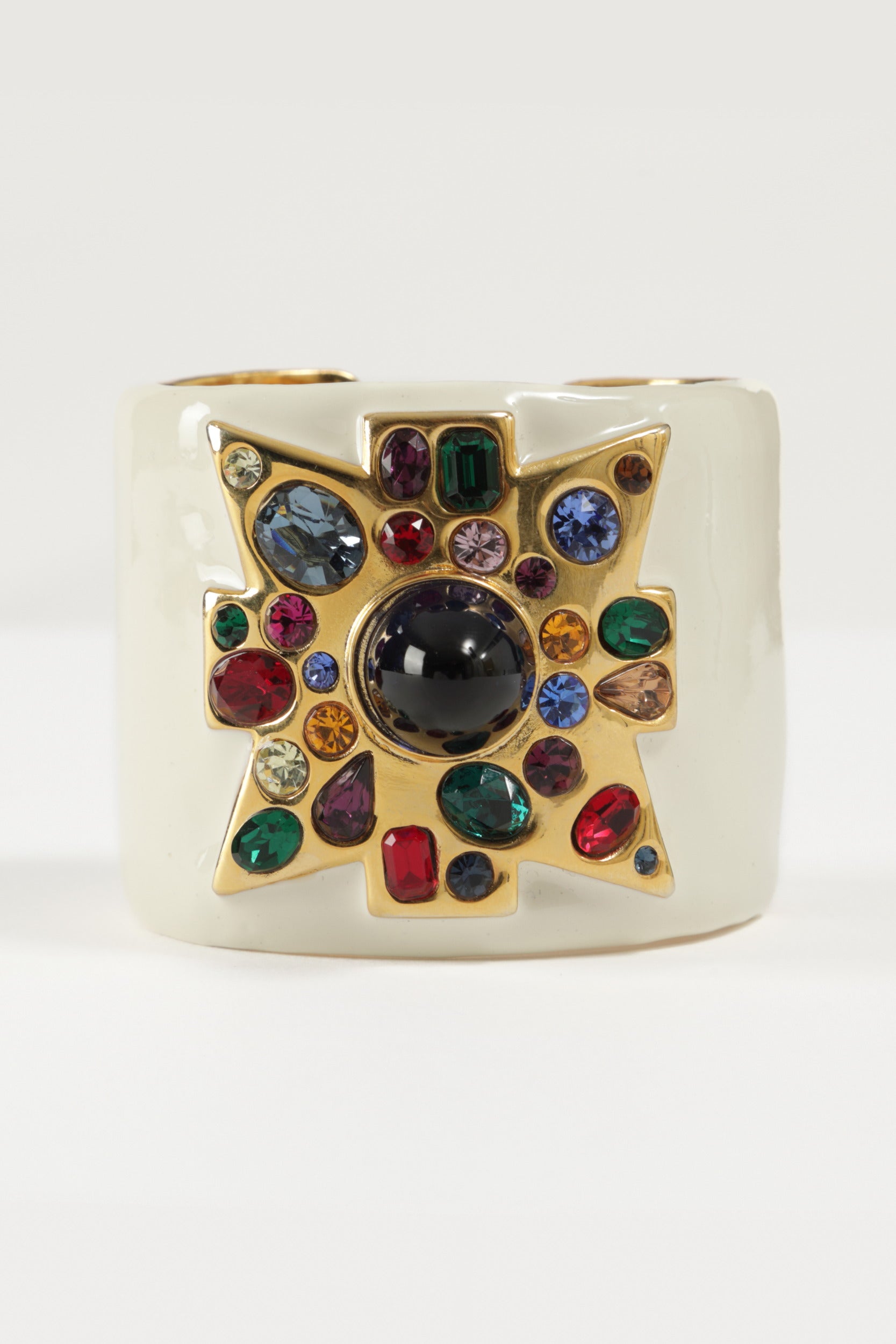 Bracciale anni 90, di Kenneth Jay Lane, in metallo smaltato bianco lucido con decoro in metallo dorato a croce ricoperto di pietre multicolore. Made in Usa