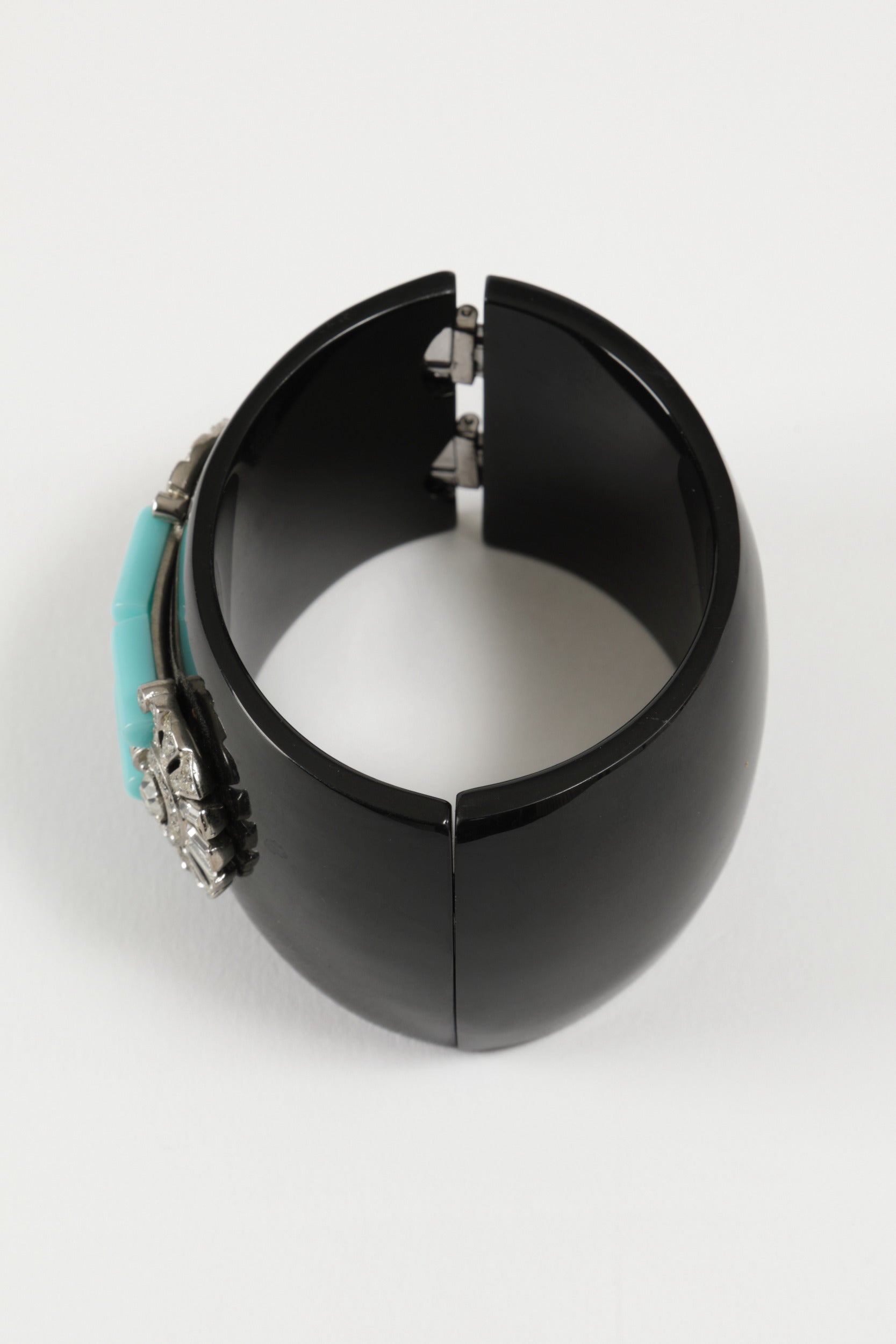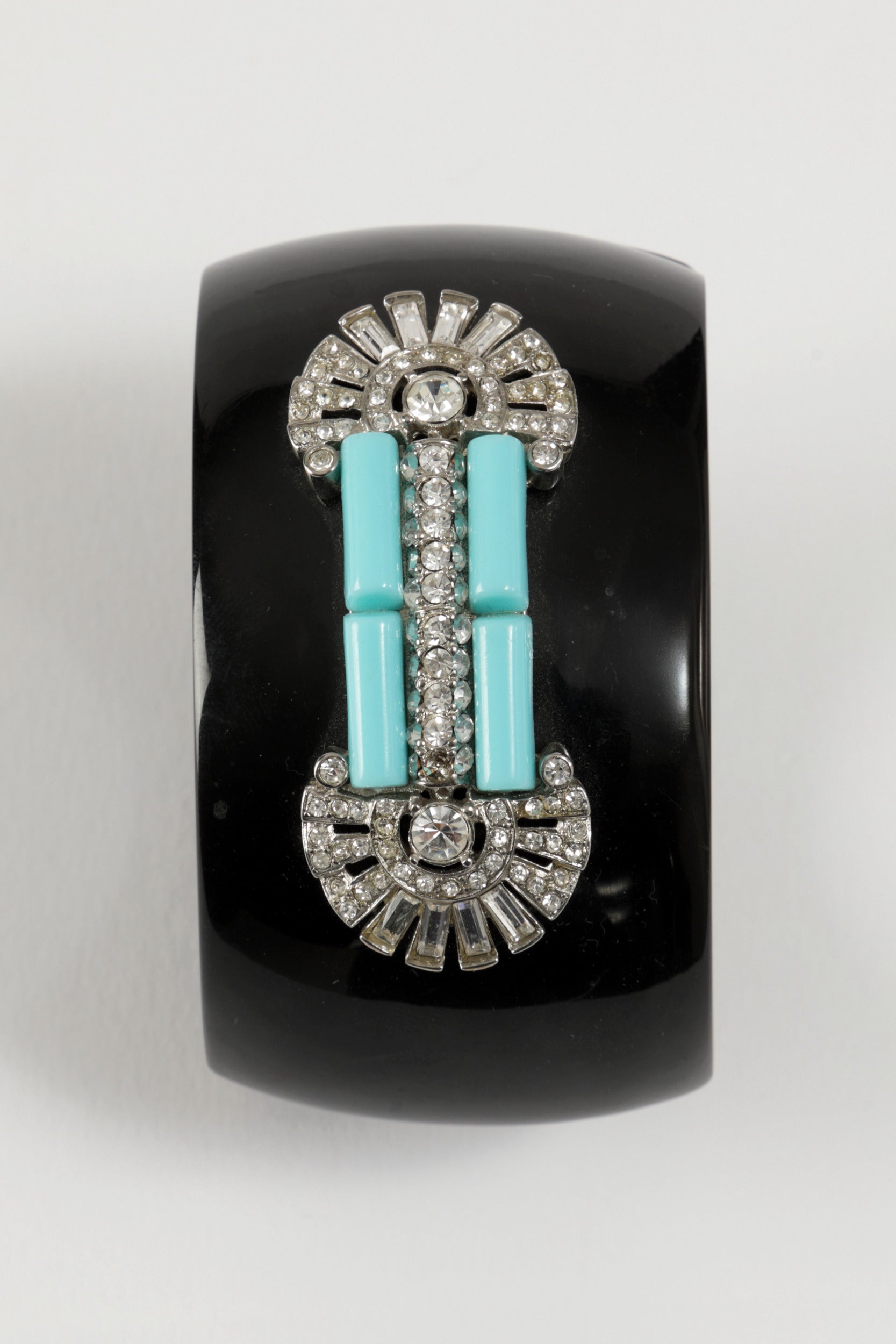 Bracciale anni 90, di Kenneth Jay Lane, in smalto nero lucido con decoro centrale stile decò in strass, cristalli baguette, e cabochon turchesi. Made in Usa
