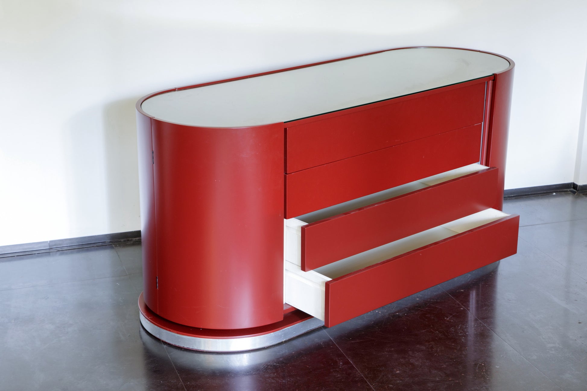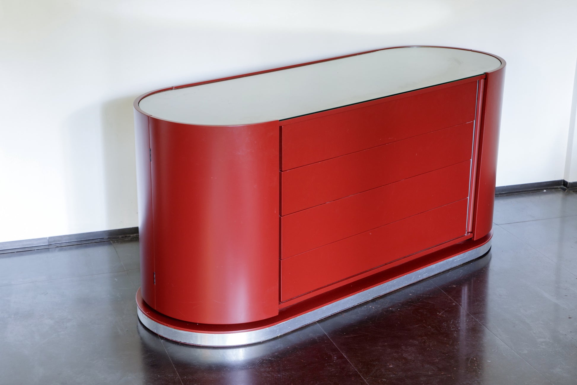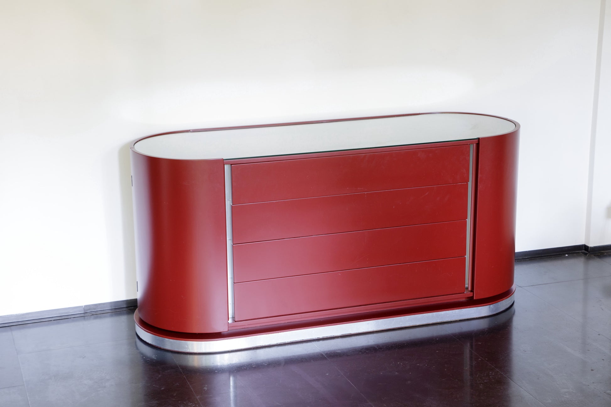 Cassettiera anni 70, attribuibile a Willy Rizzo. Struttura stondata in legno laccato bordeaux, piano specchiato fumè, due ante a due ripiani ciascuna e 4 cassetti centrali, base a fascia in acciaio. Produzione Italiana.