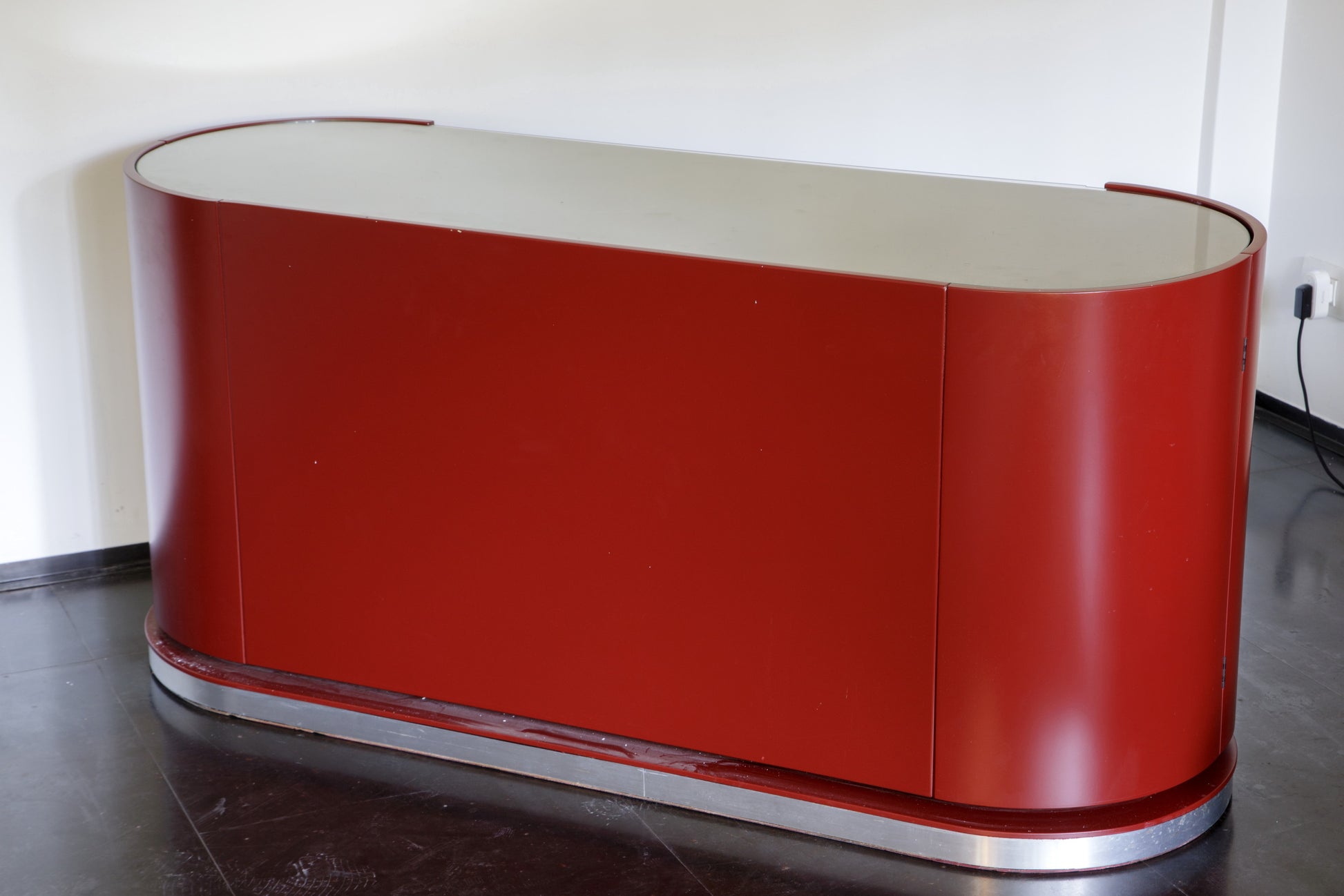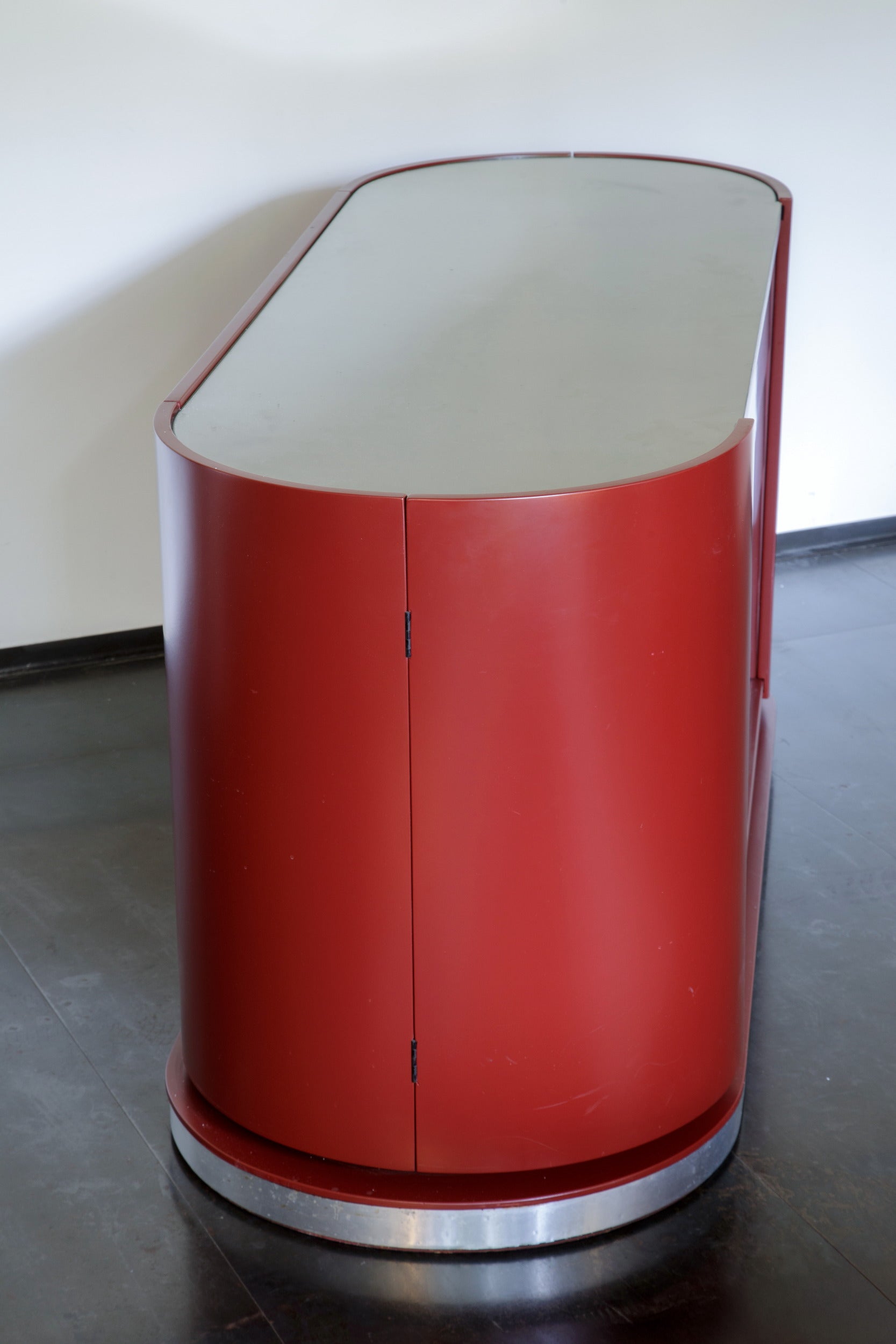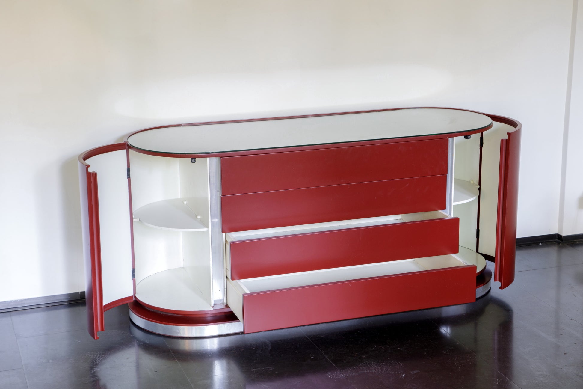 Cassettiera anni 70, attribuibile a Willy Rizzo. Struttura stondata in legno laccato bordeaux, piano specchiato fumè, due ante a due ripiani ciascuna e 4 cassetti centrali, base a fascia in acciaio. Produzione Italiana.
