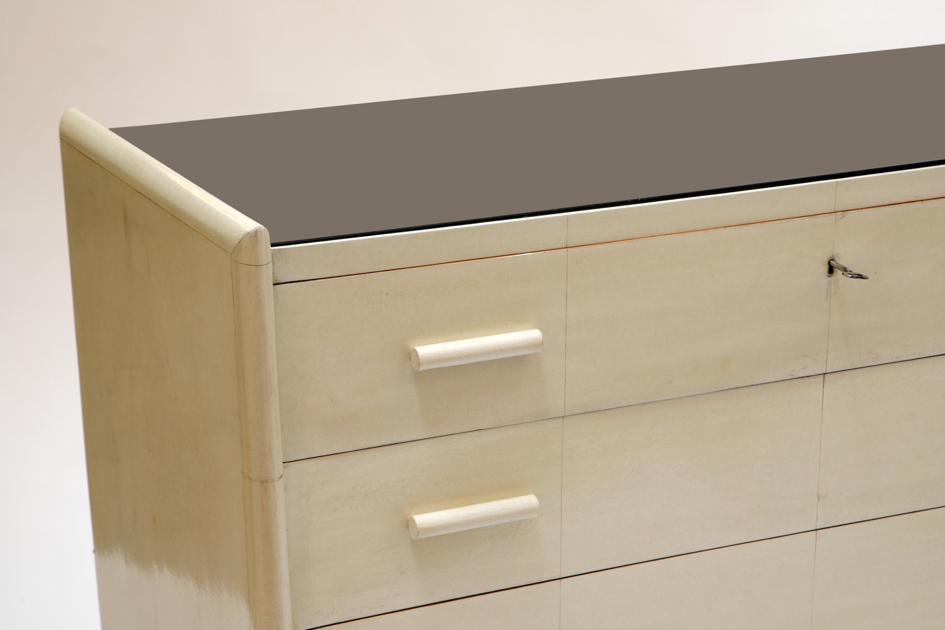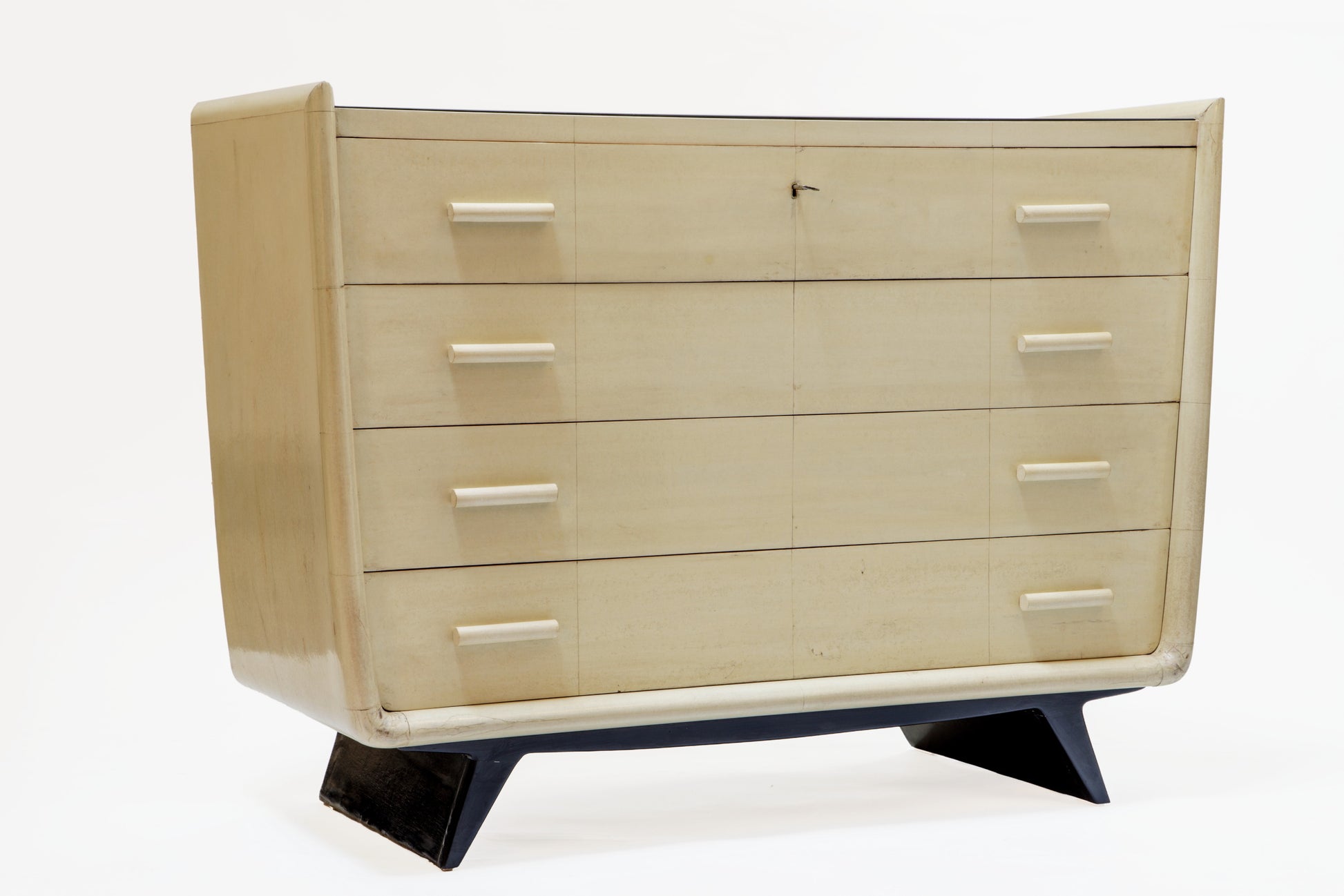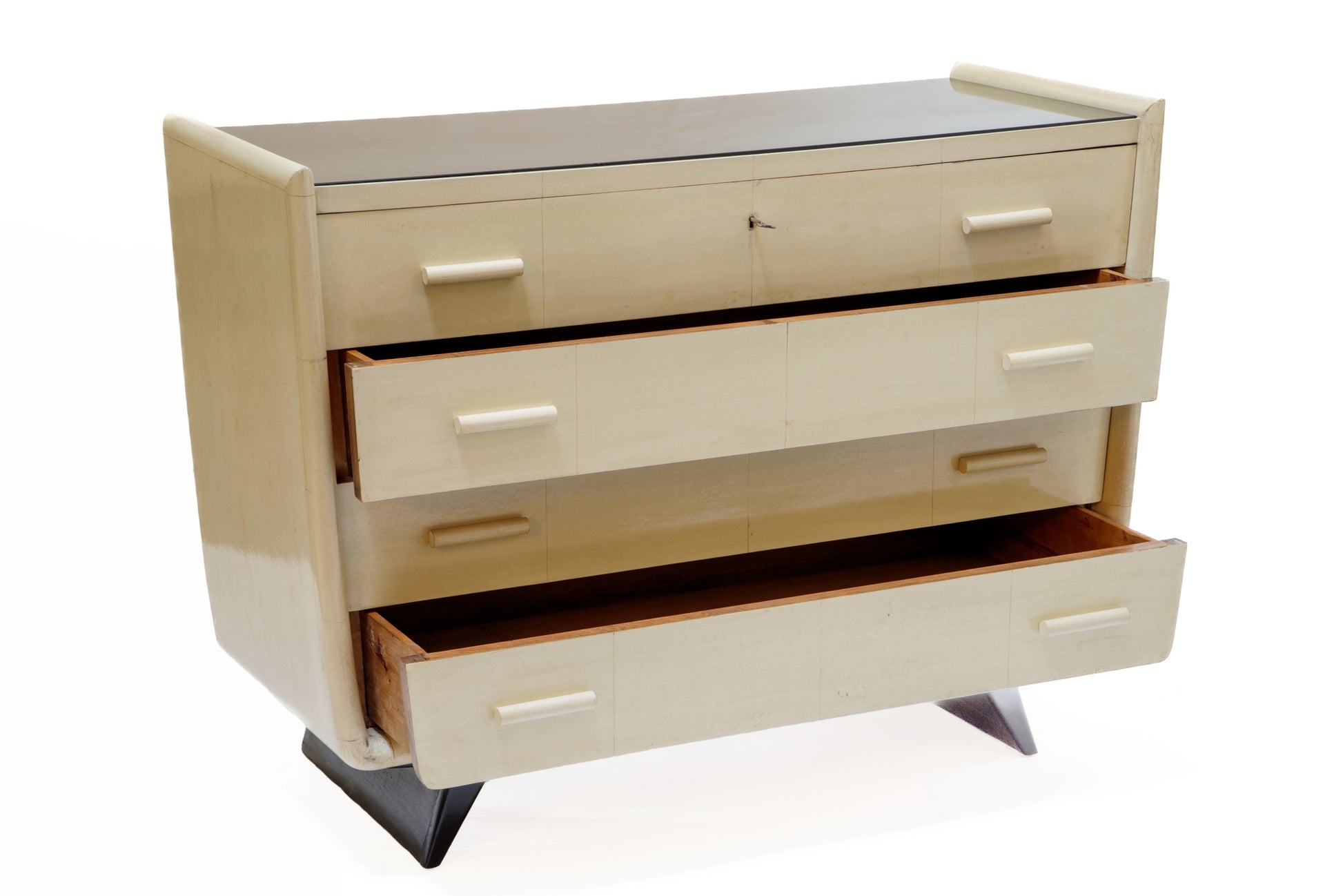 Comò ammo 30, struttura, a 4 cassetti, in legno ricoperta di pergamena con piano in vetro nero. Attribuibile a Guglielmo Ulrich x Valzania. Produzione Italiana.