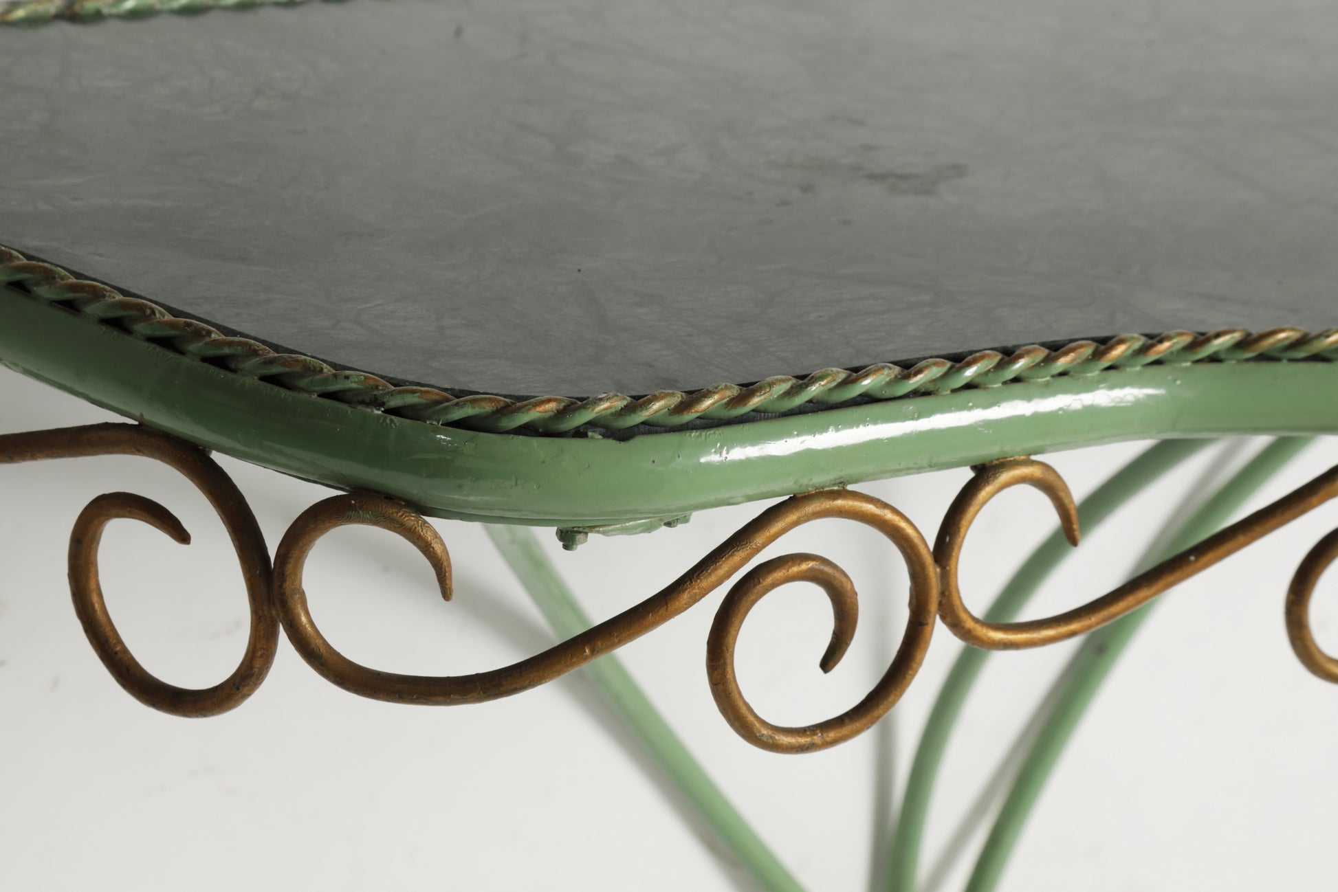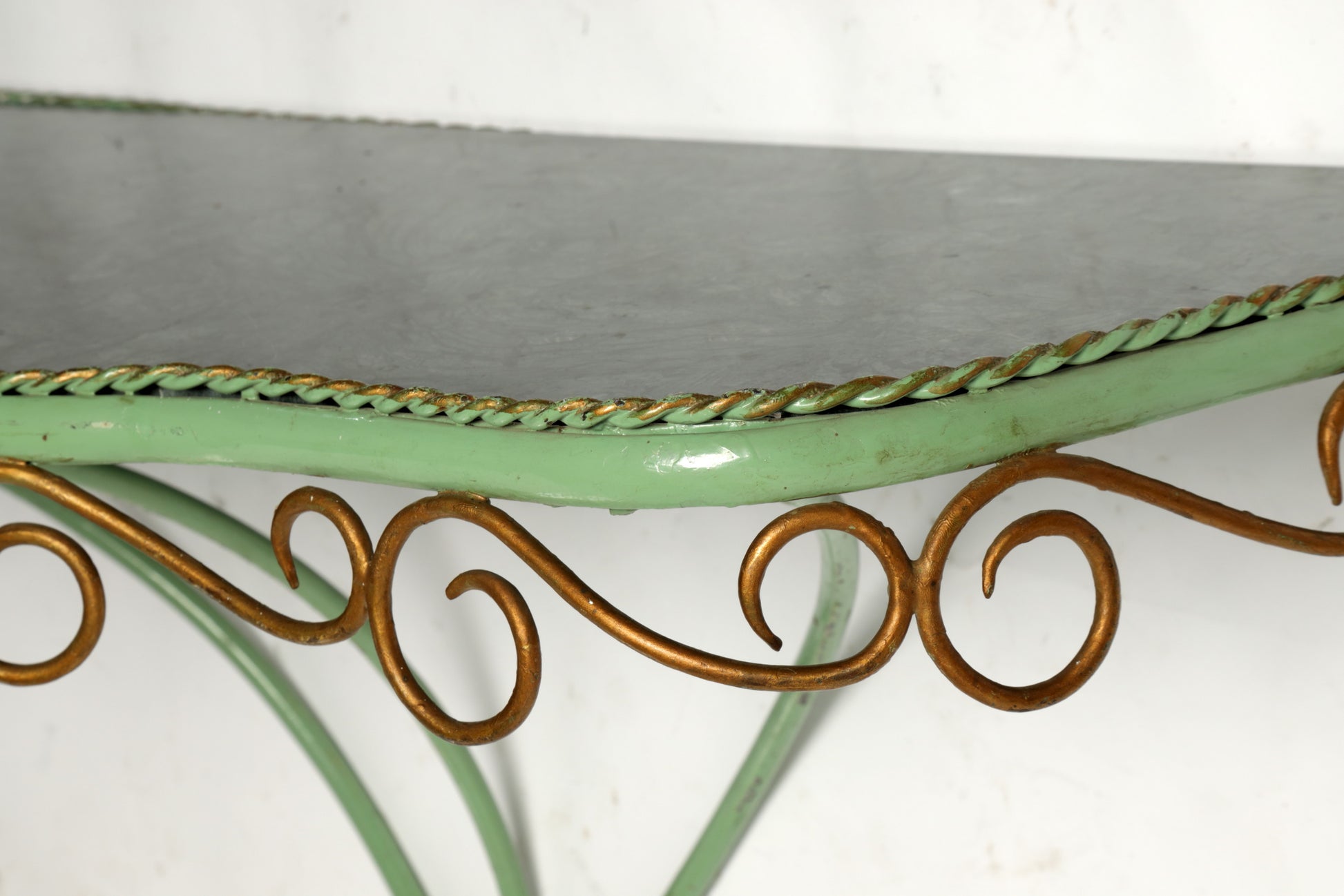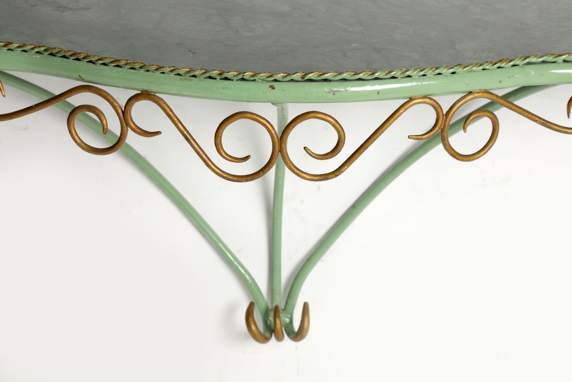 Consolle anni 60, struttura in ferro smaltato e piano in marmo verde sagomato. Produzione Italiana.
