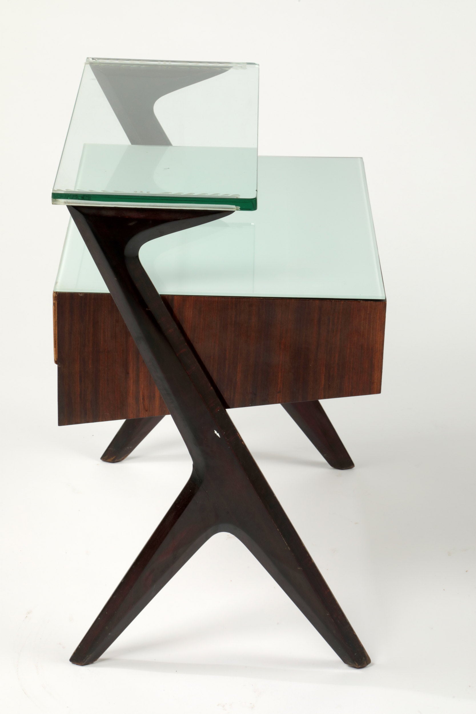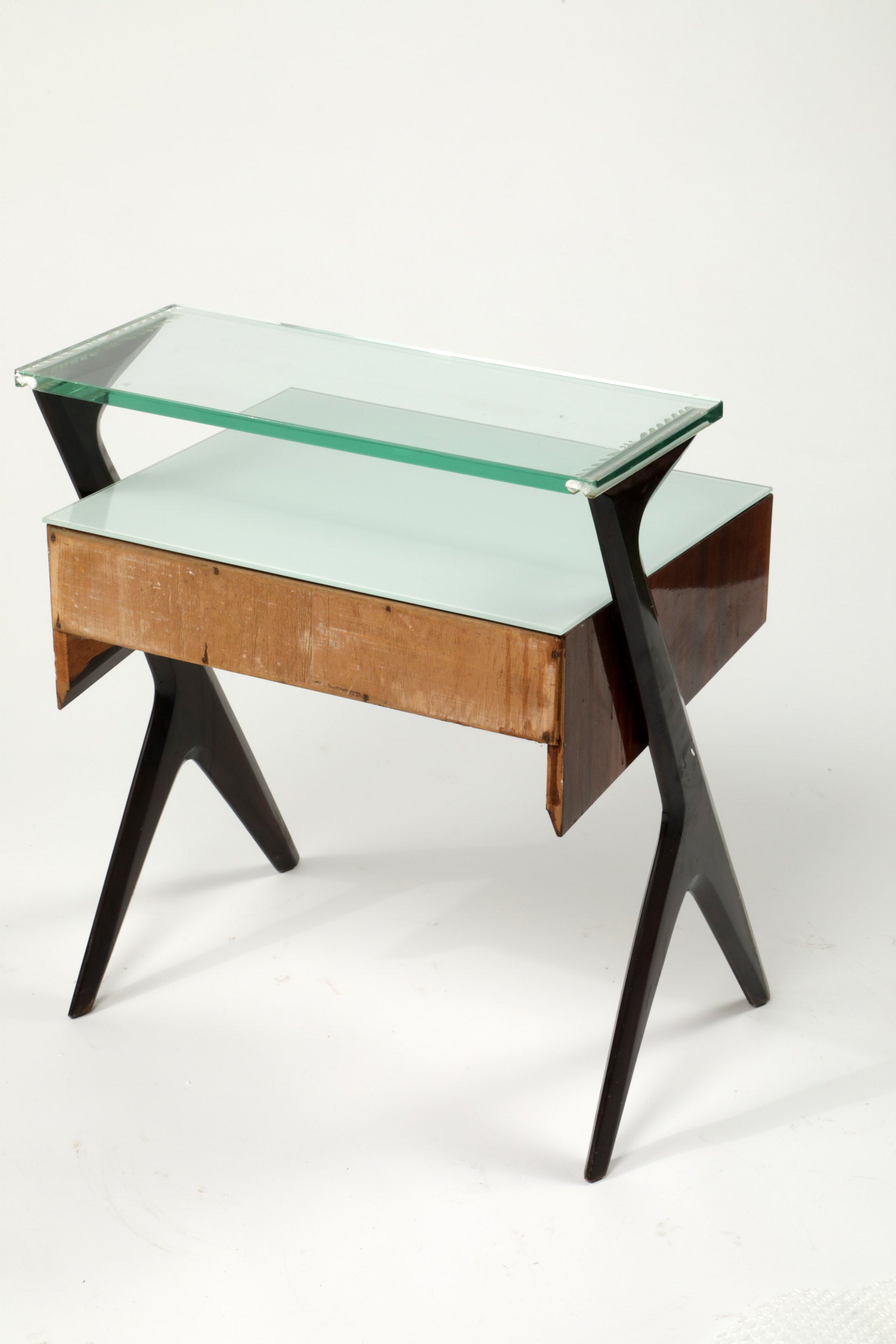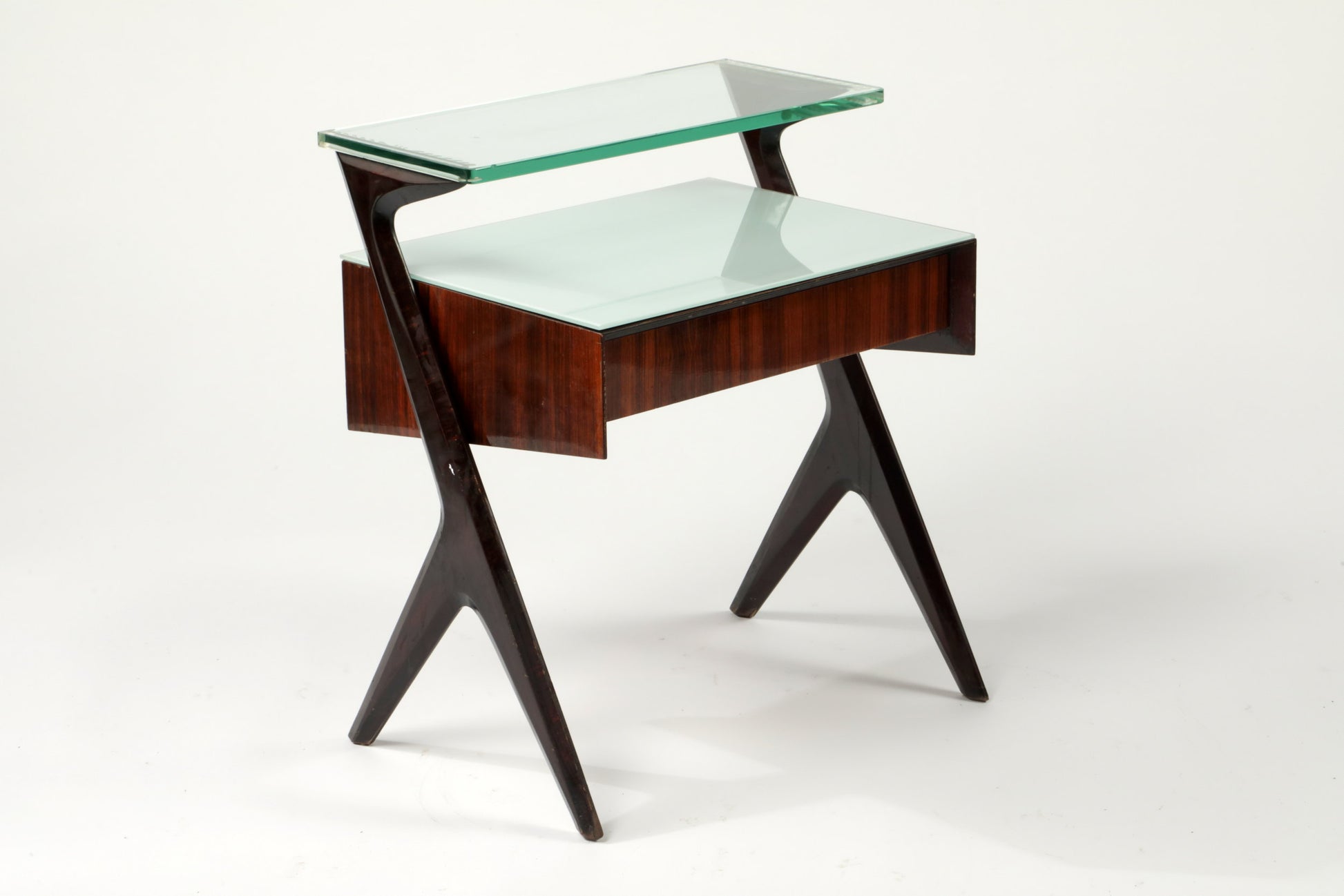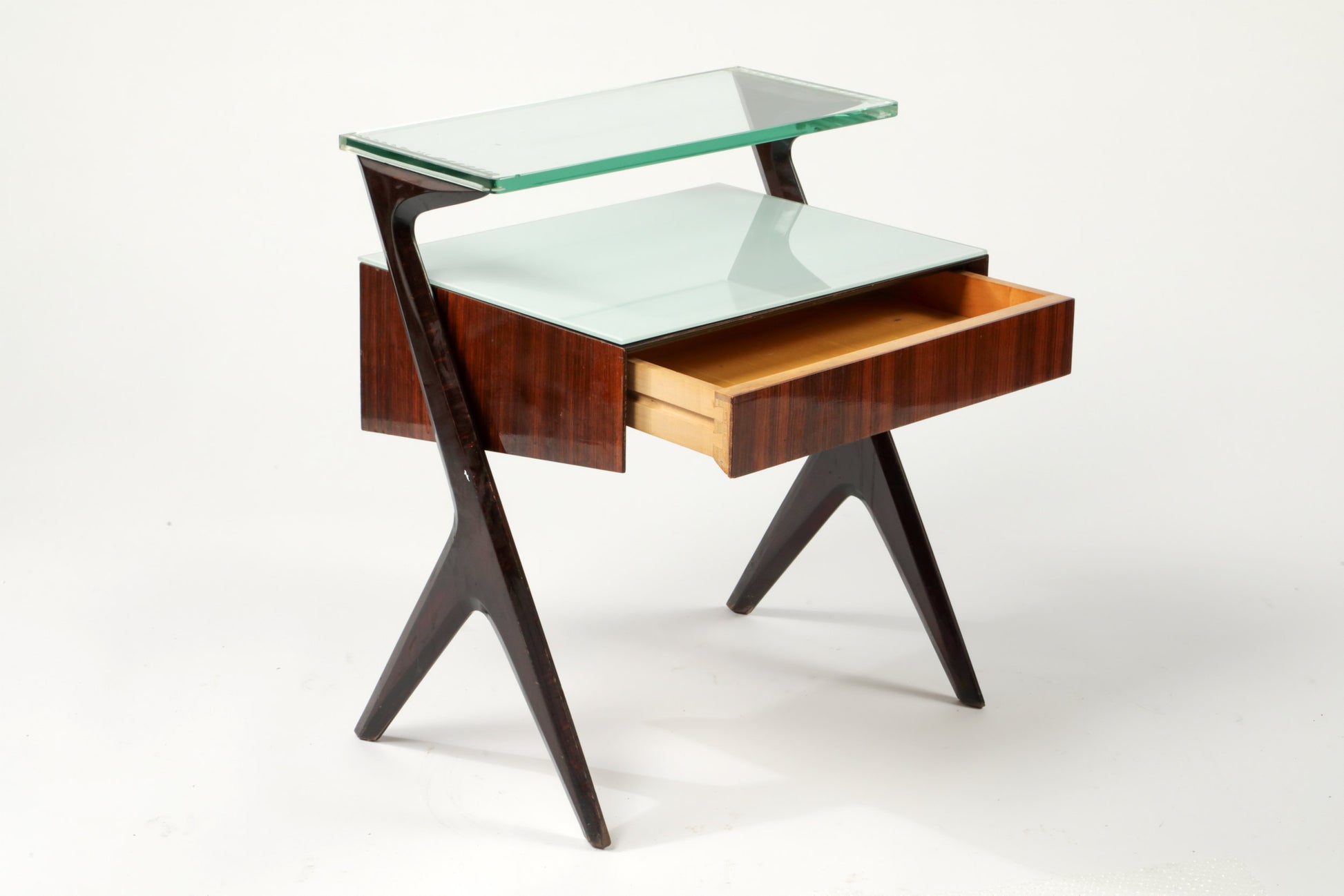 Coppia comodini anni 60, attribuibili a Vittorio Dassi. Struttura in palissandro e mogano, ad un cassetto con due ripiani in vetro. Manifattura Italiana.