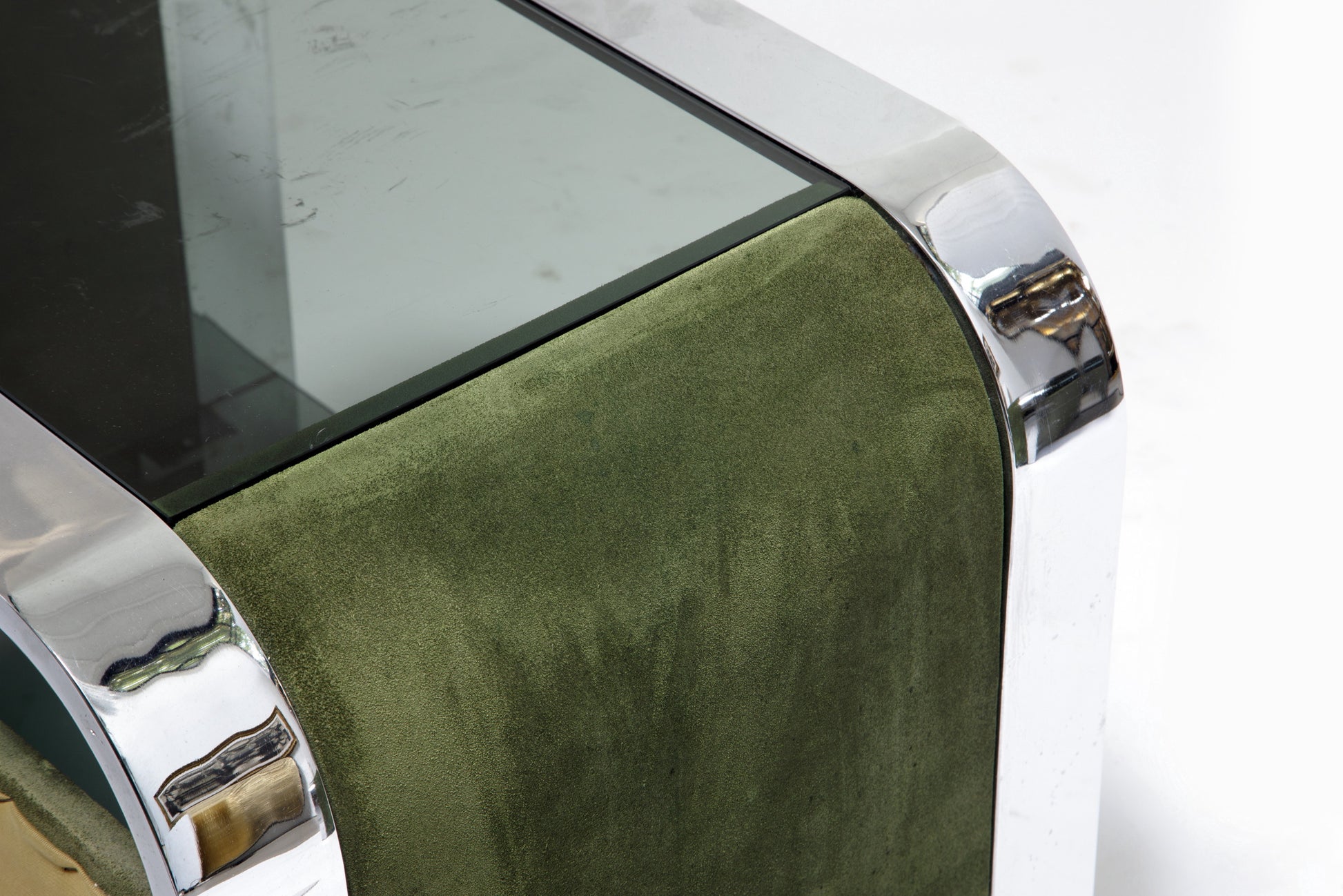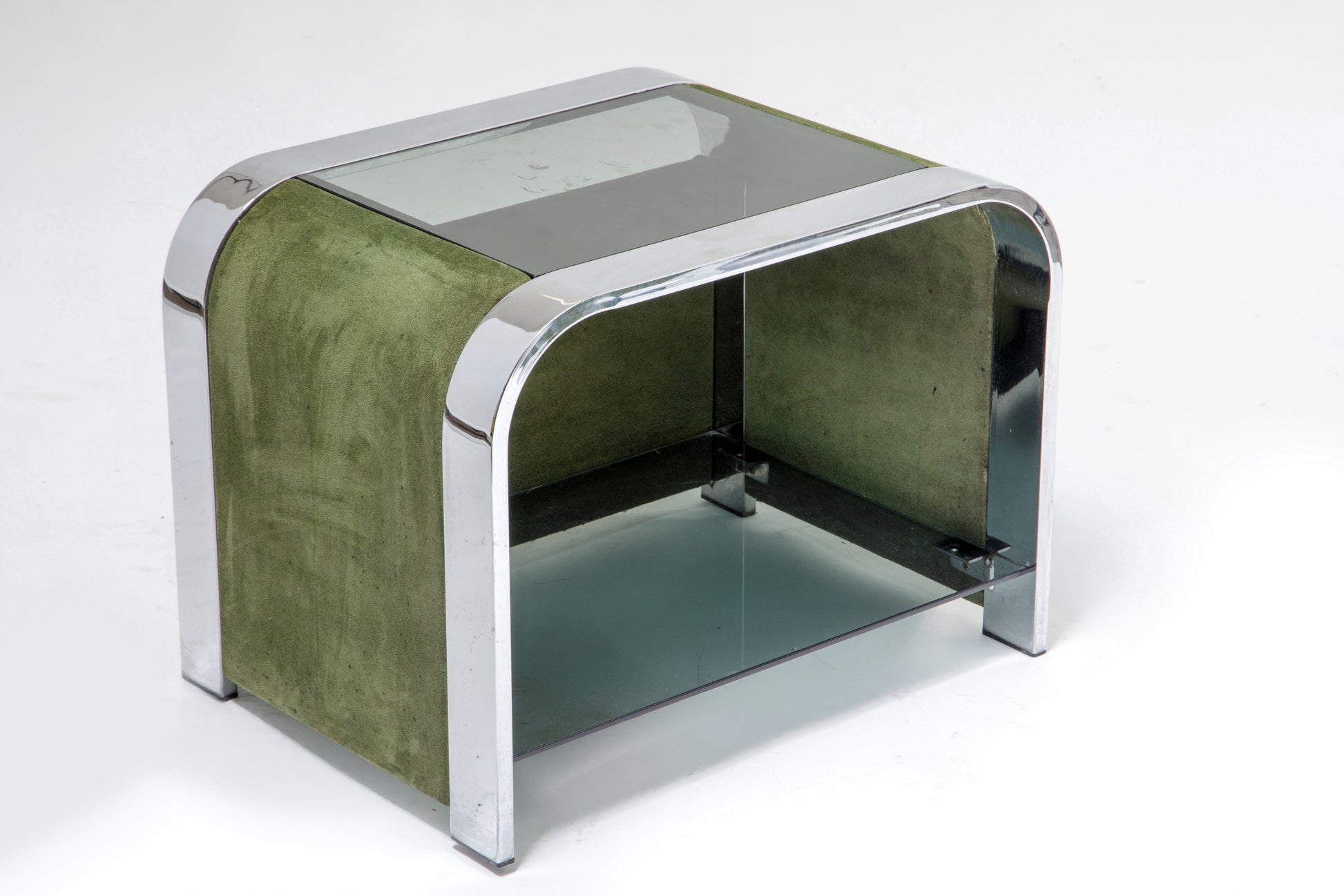 Coppia comodini anni 70, struttura in acciaio e velluto verde bottiglia con due ripiani in vetro fumé. Produzione Italiana.