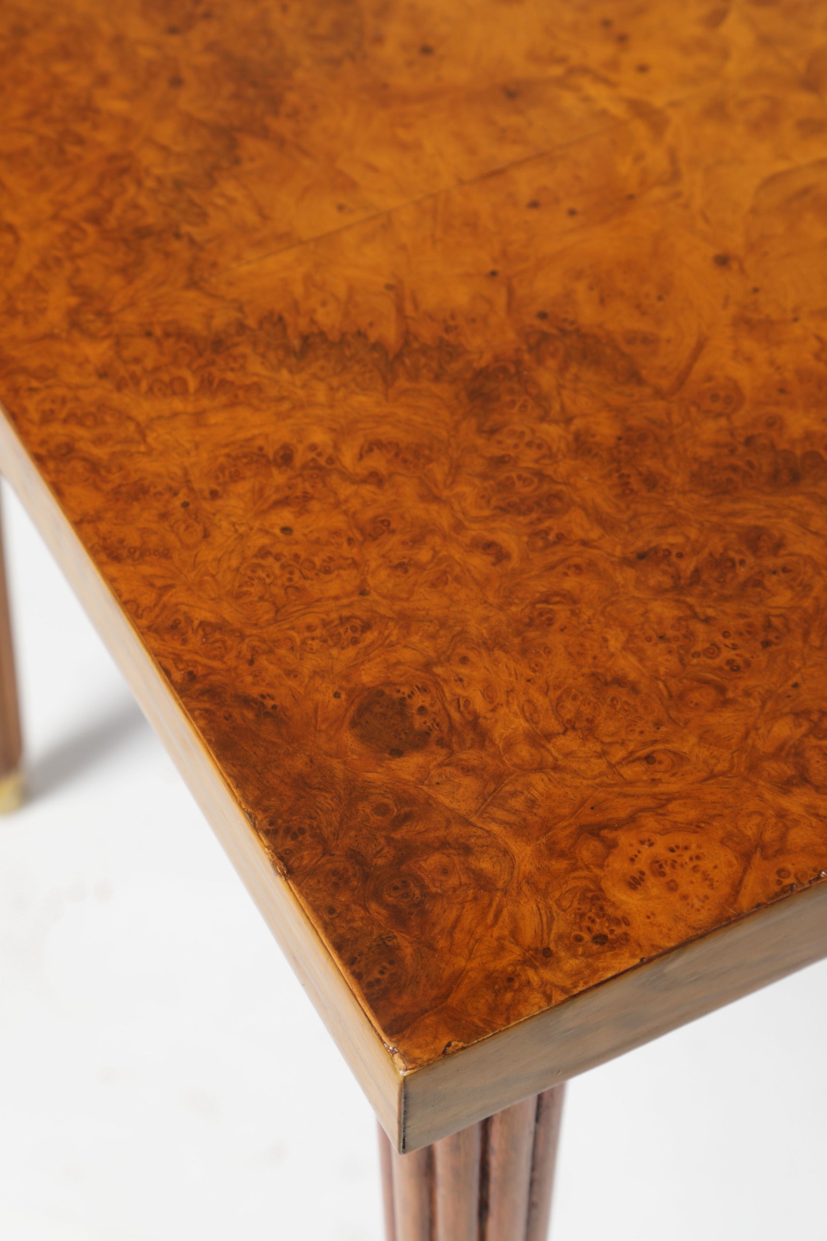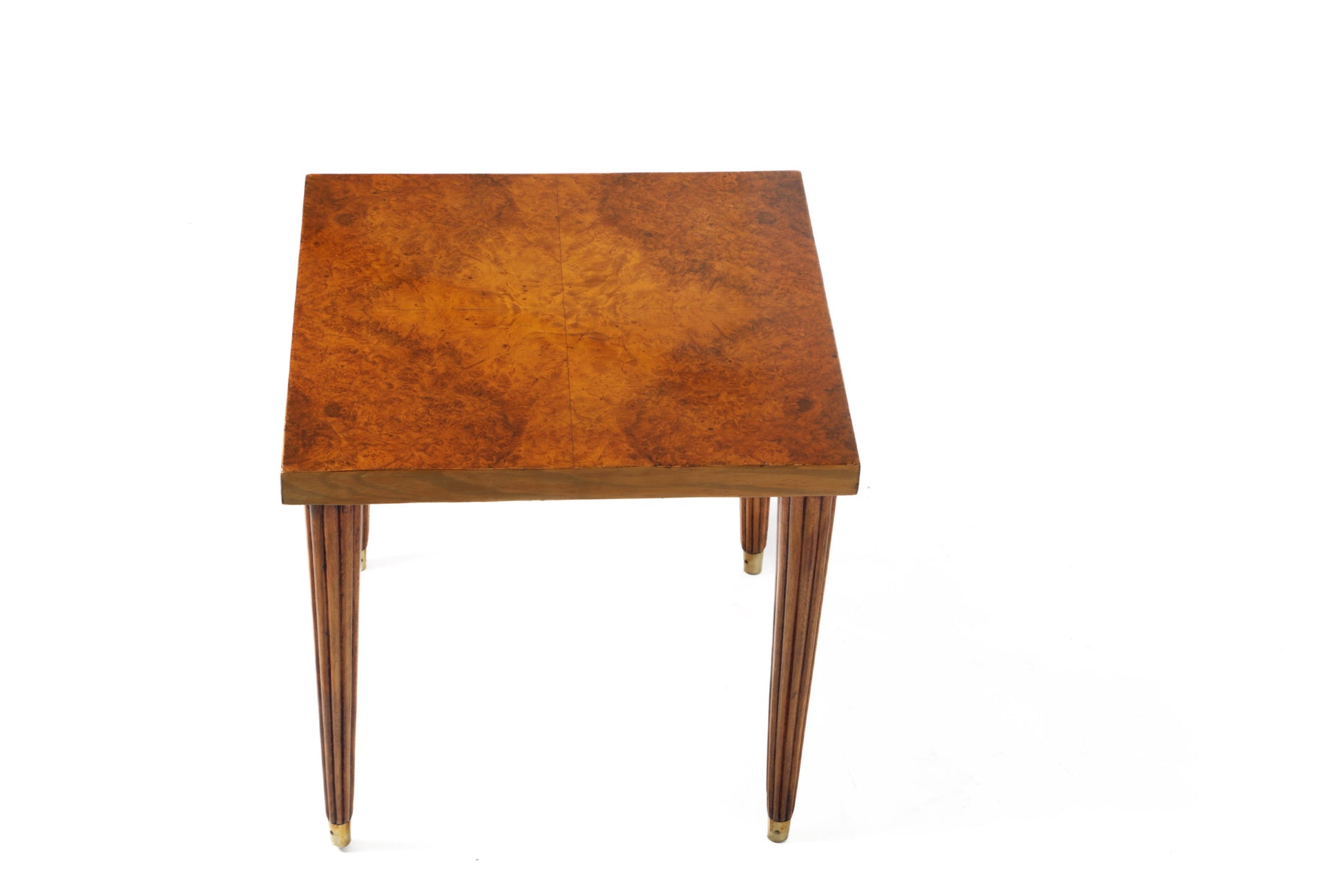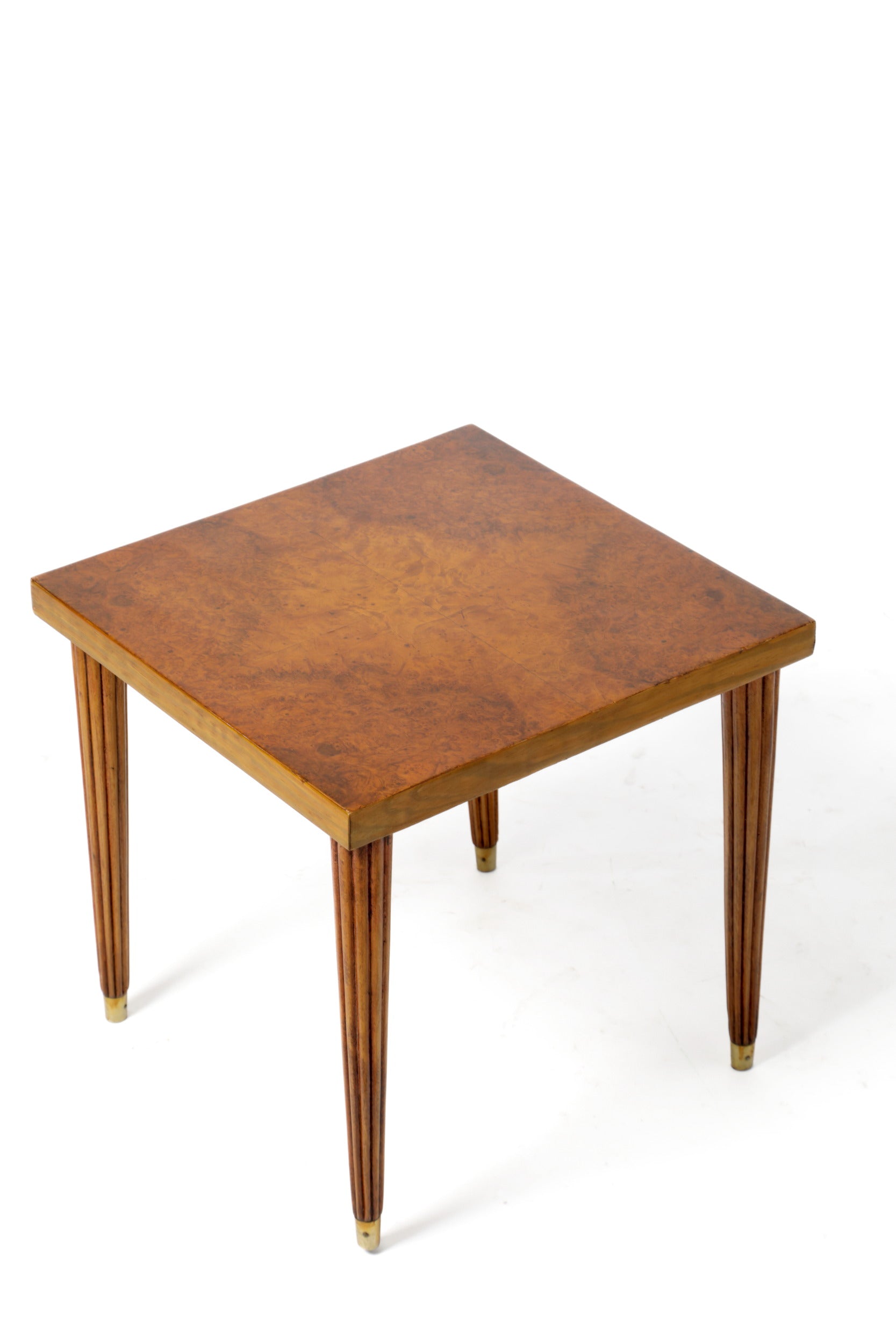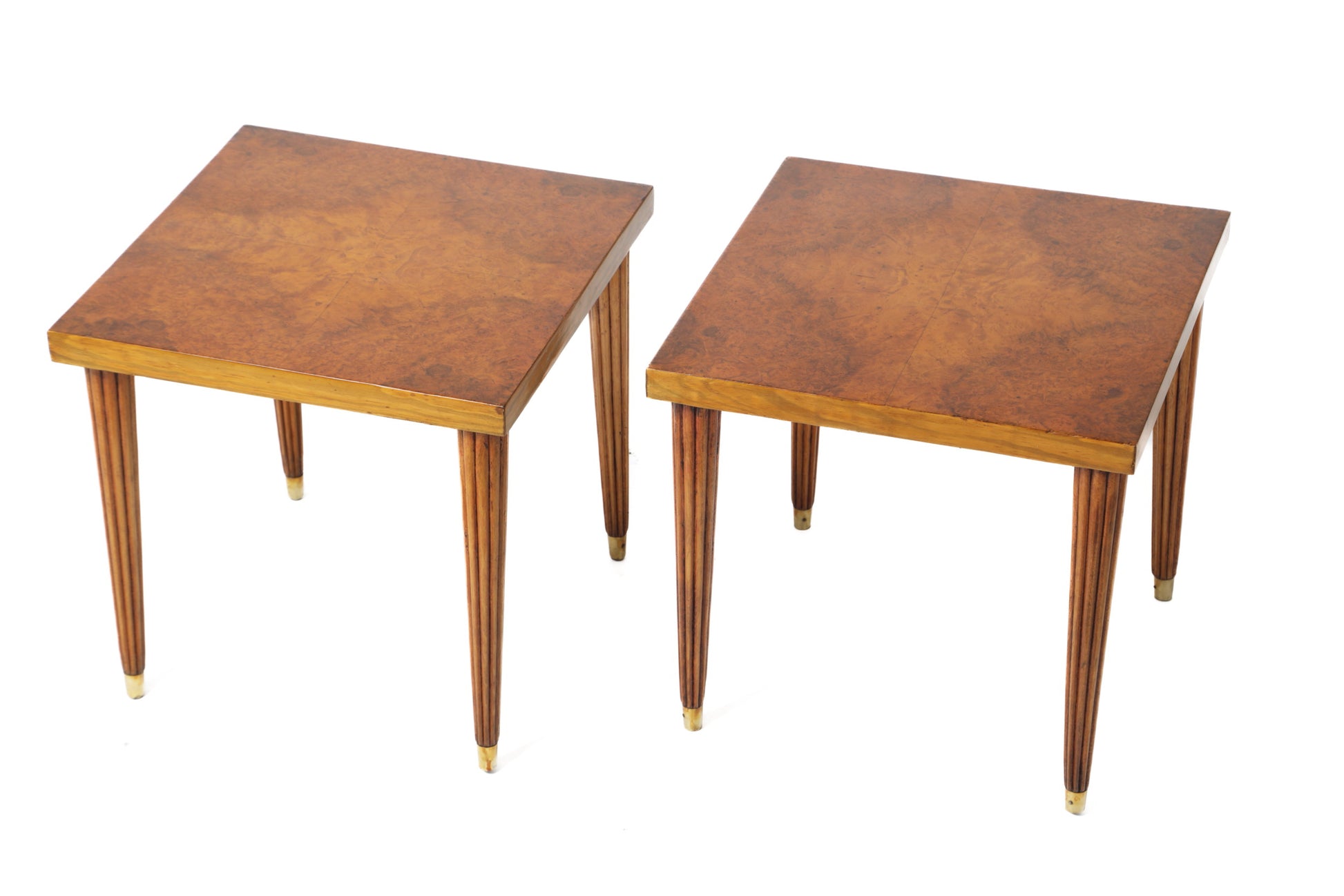 Coppia tavolini anni 50, struttura in radica con zampe grissinate e sabot in ottone. Produzione Italiana.