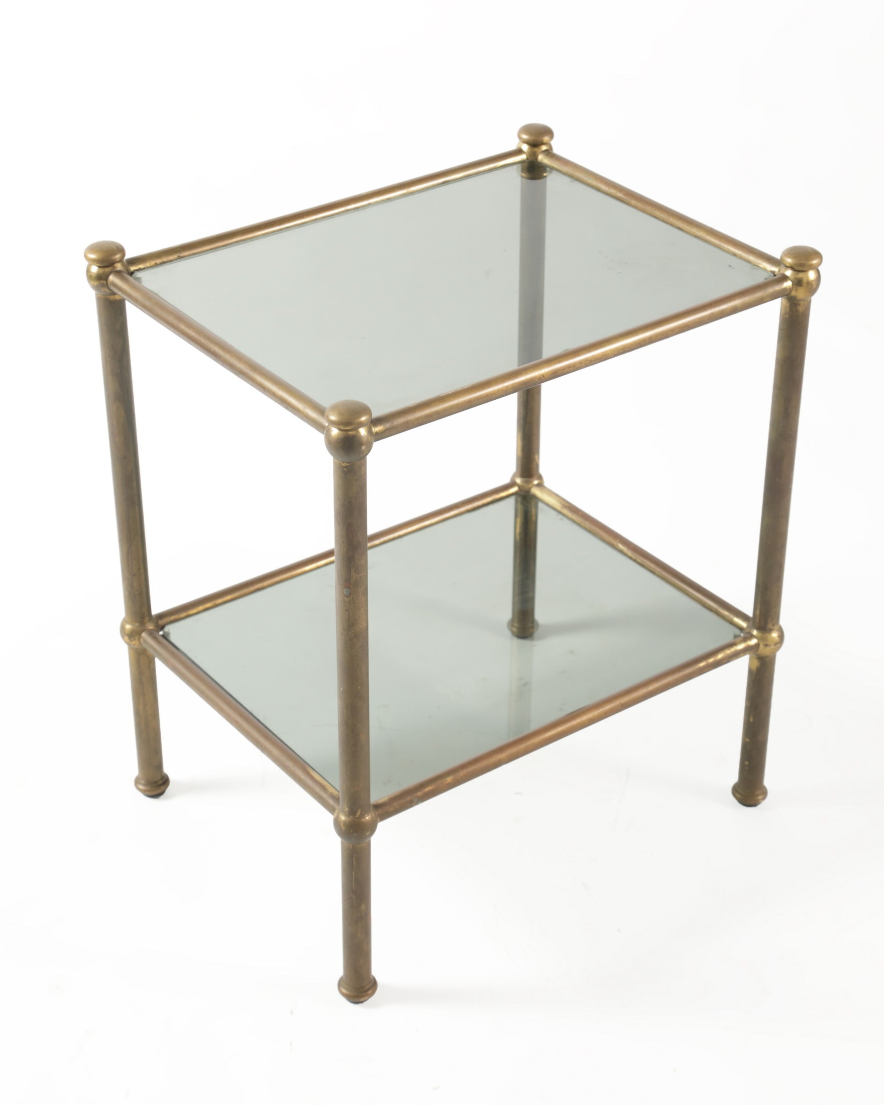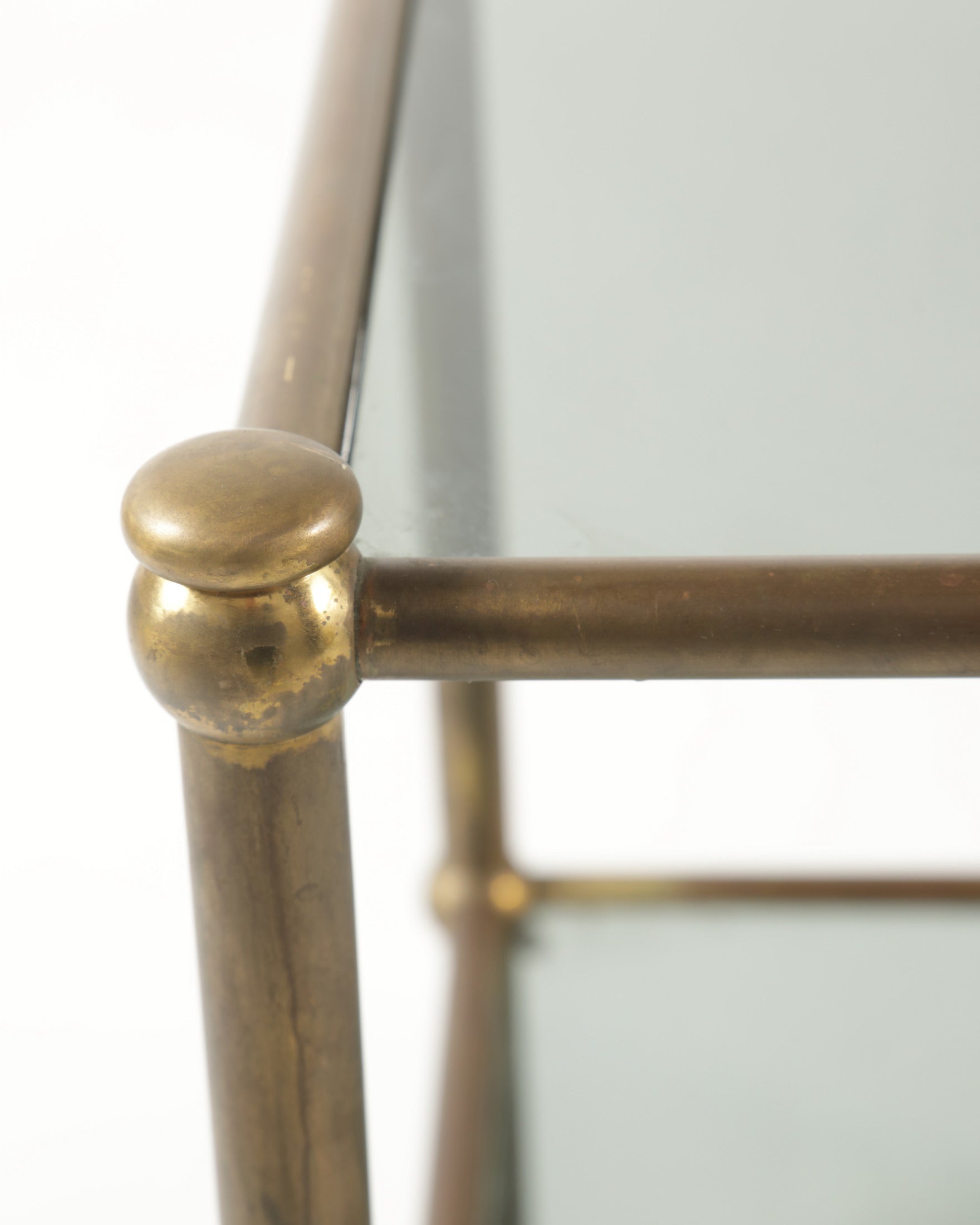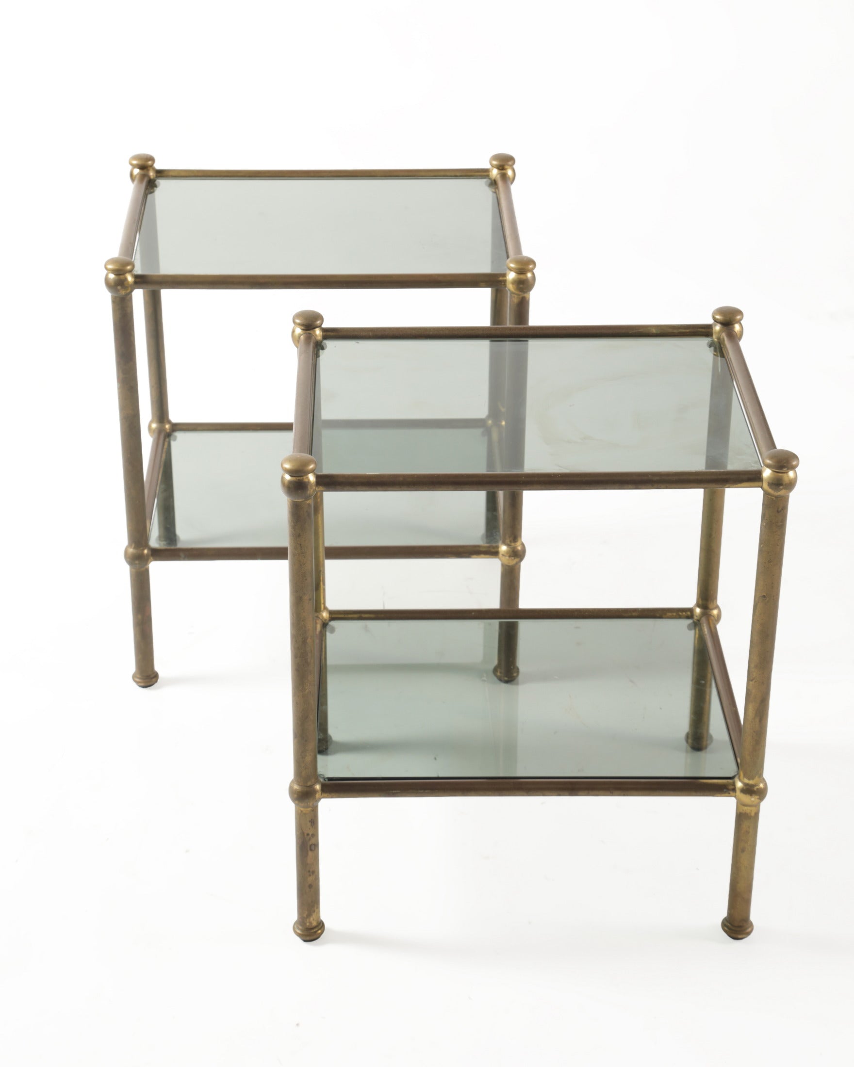Coppia tavolini anni 60, struttura a canne di ottone liscio con doppio ripiano in vetro fumé. Produzione Italiana.