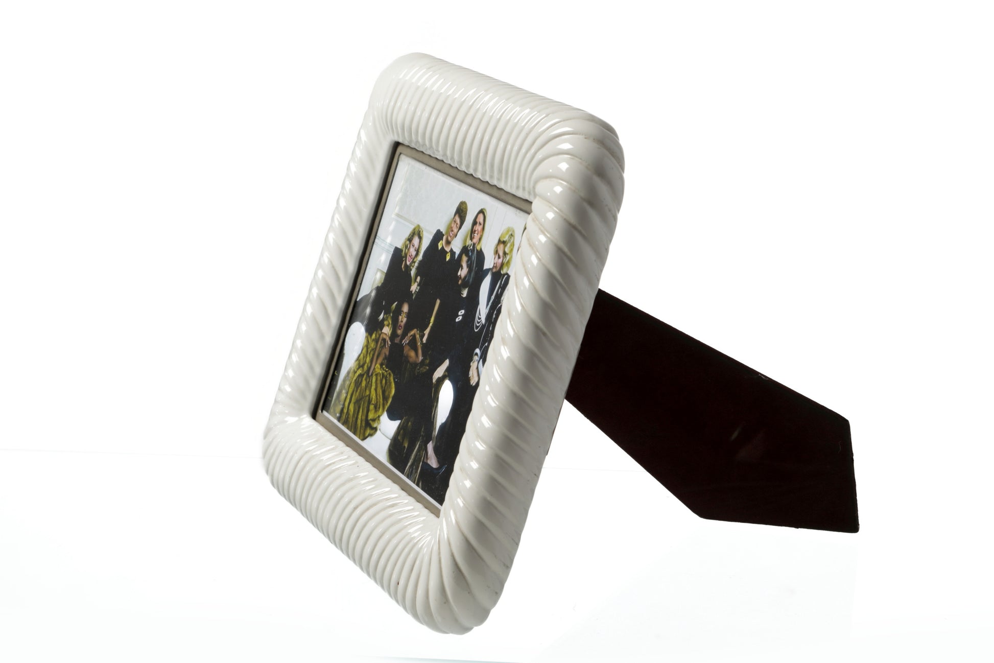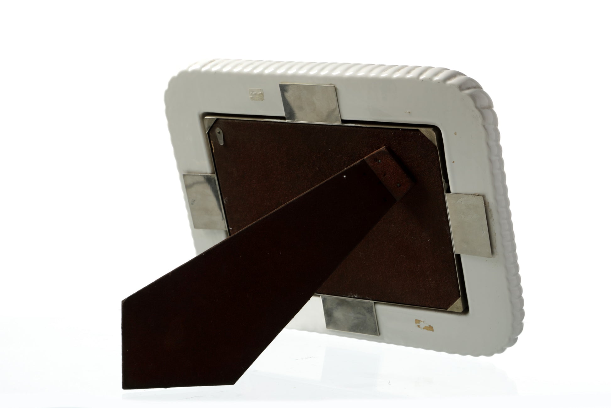 Cornice portafoto anni 70, di Tommaso Barbi in ceramica bianca, lavorazione a torchon, inserti in ottone. Produzione Italiana.