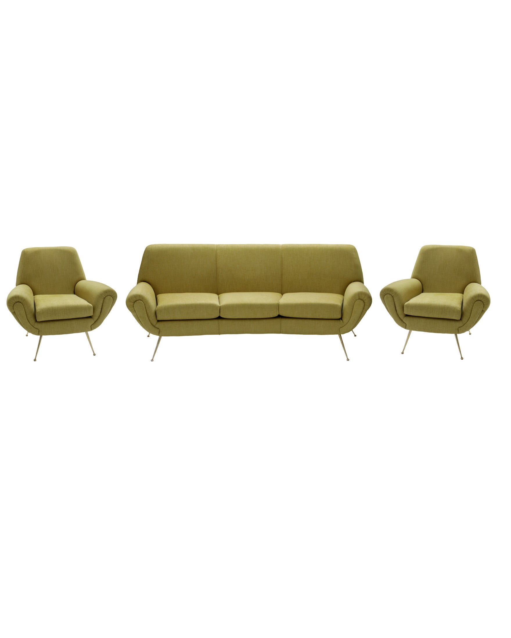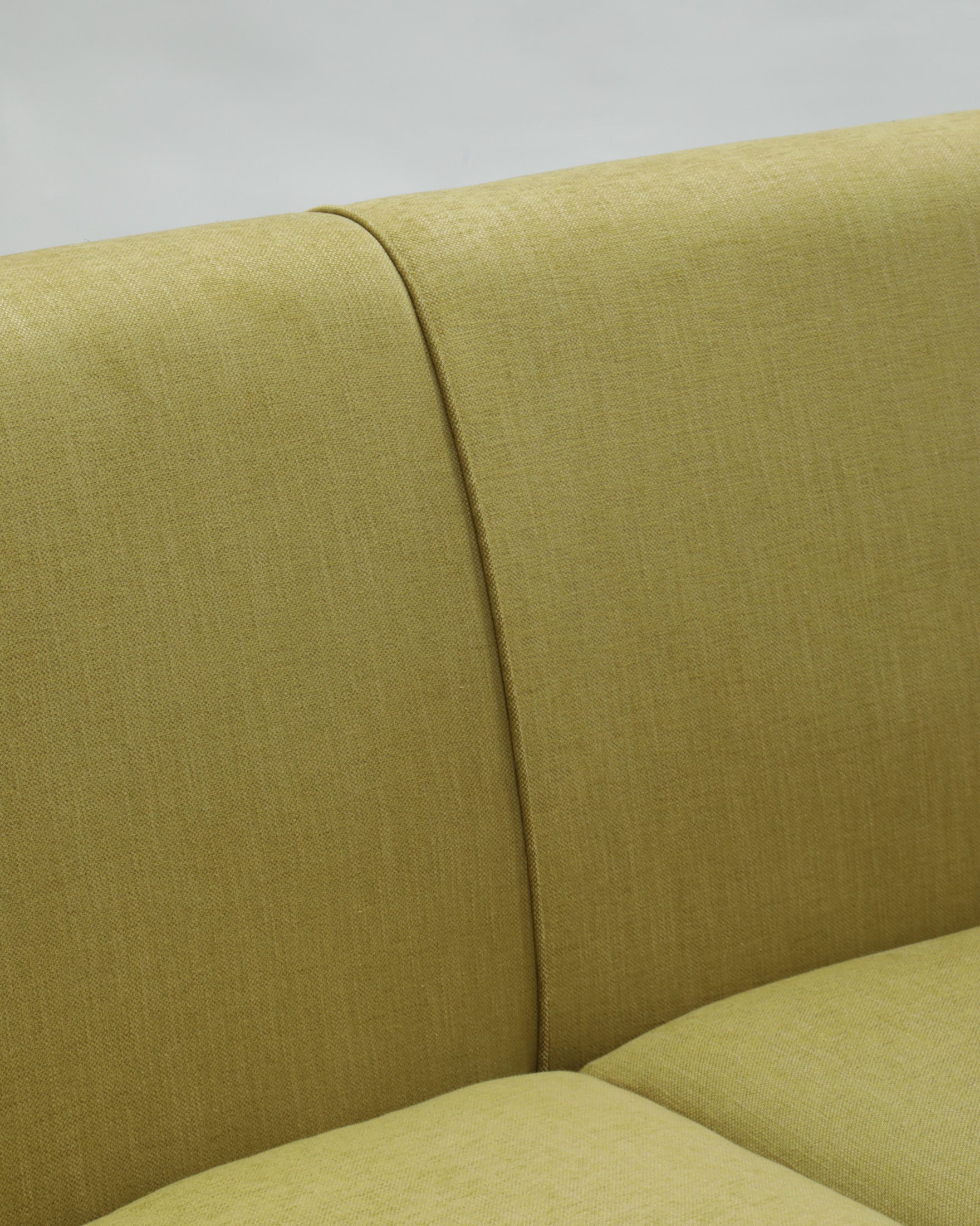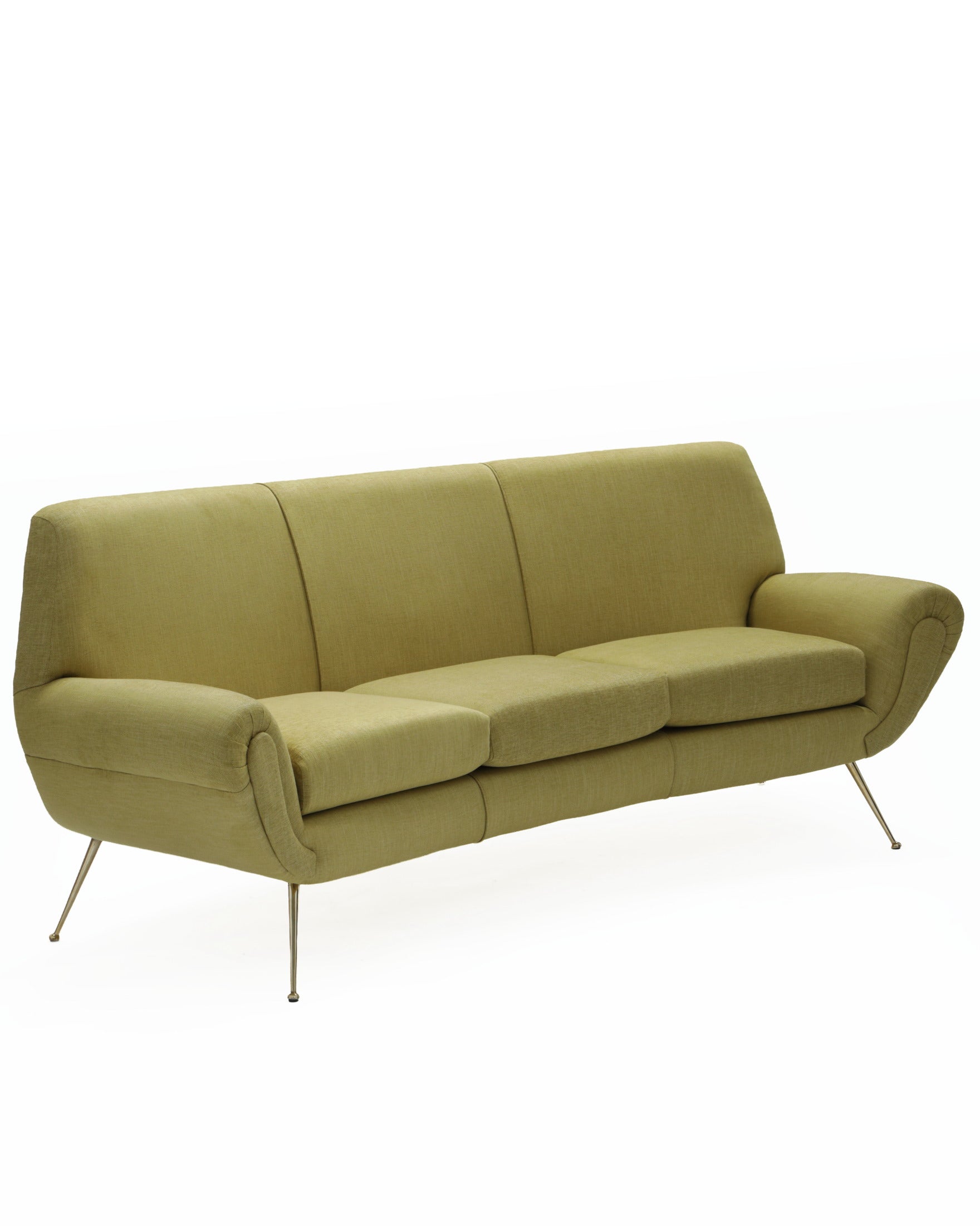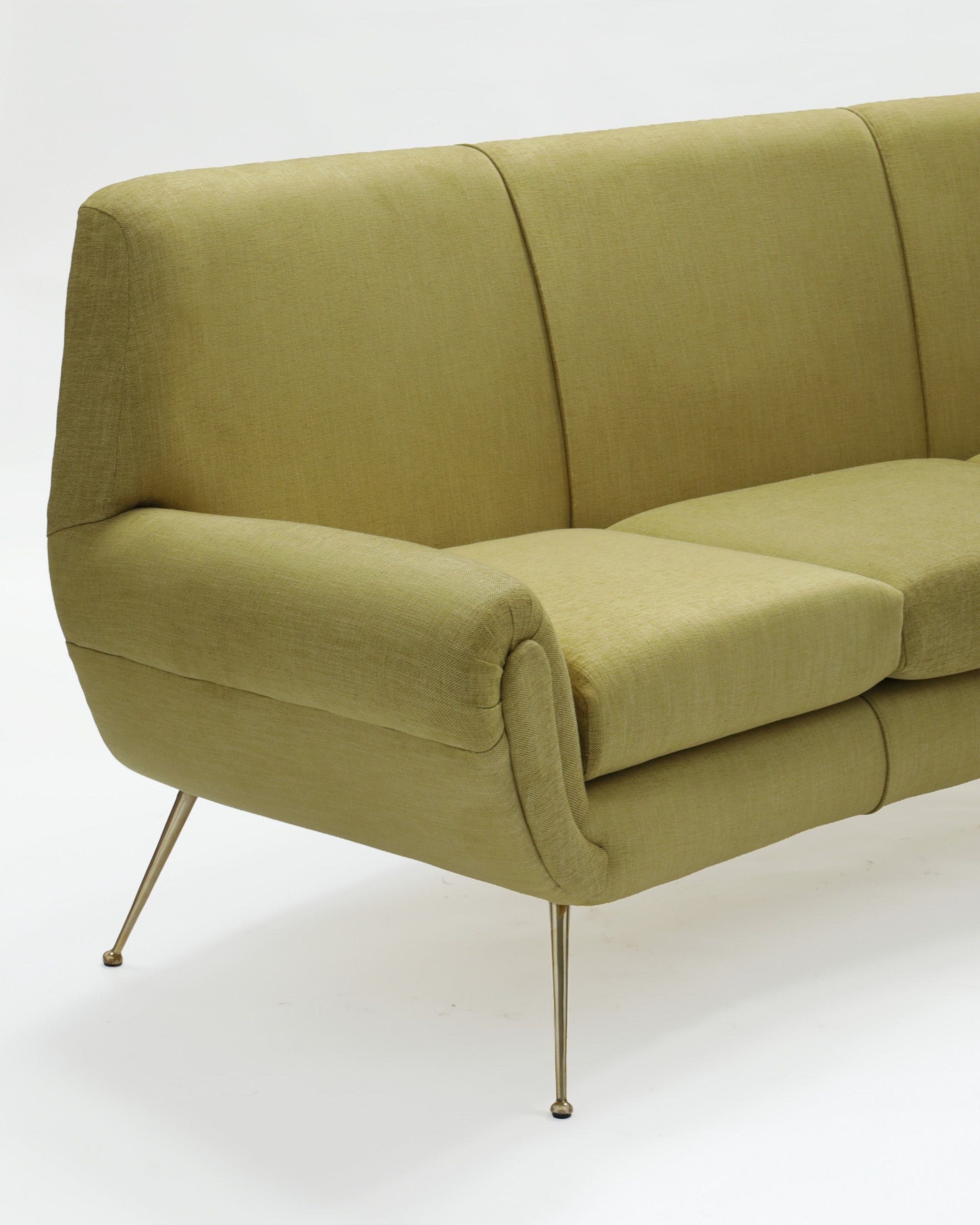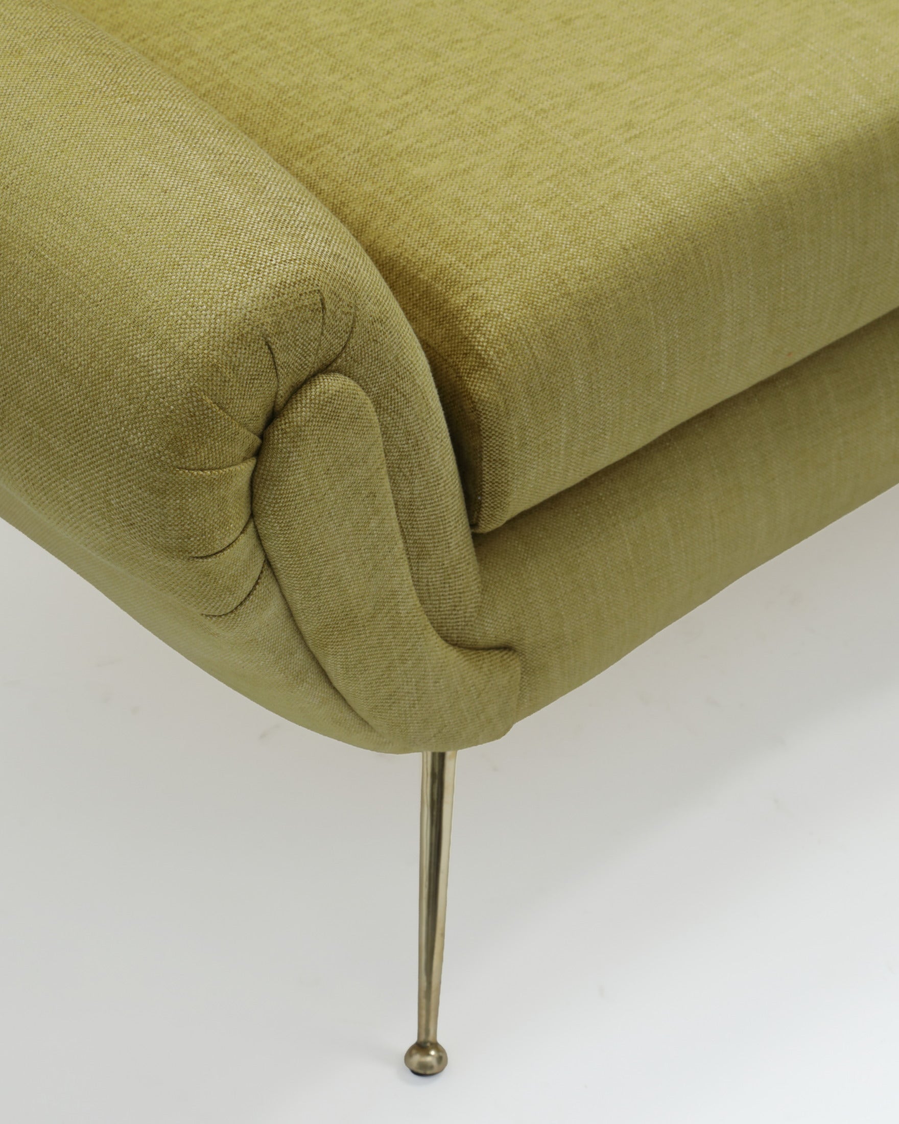 Divano curvo anni 50, reinterpretate da t r i p l e f in cotone senape, zampe a spillo in ottone. Produzione Italiana