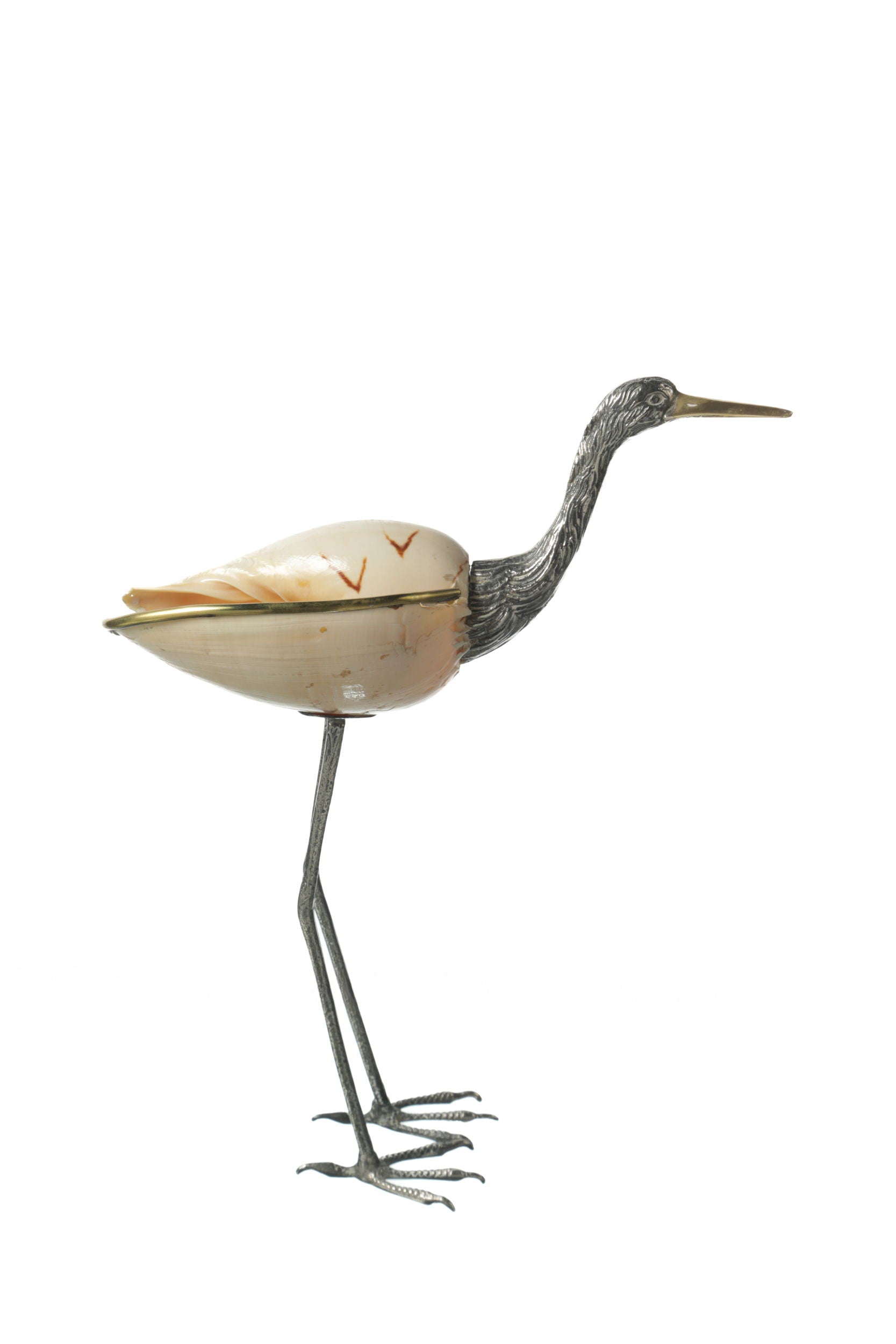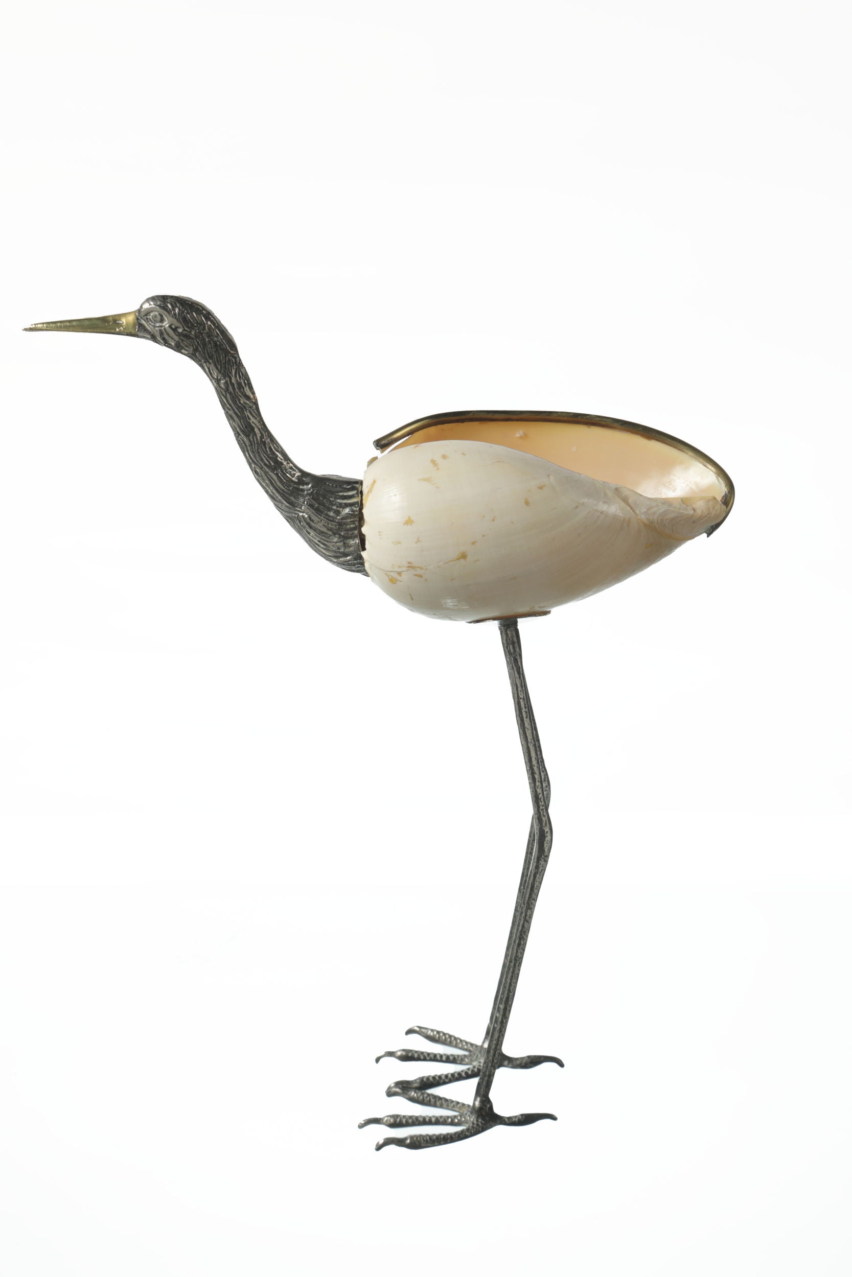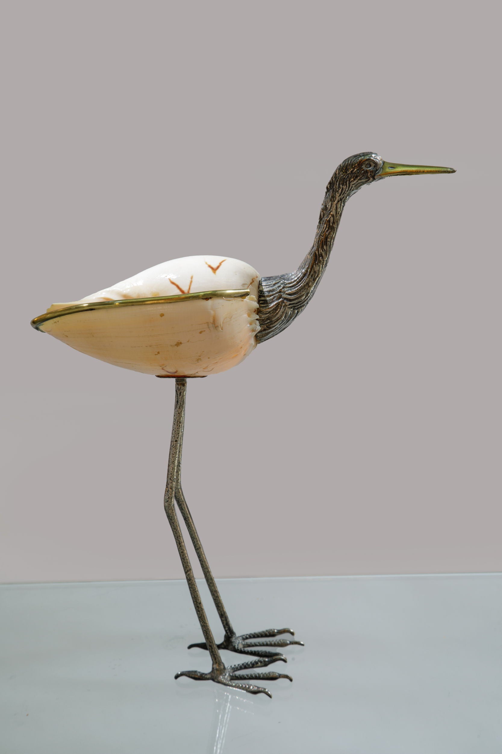 Fenicottero anni 70, in ottone con bagno argento e conchiglia. Priduzione Italiana.