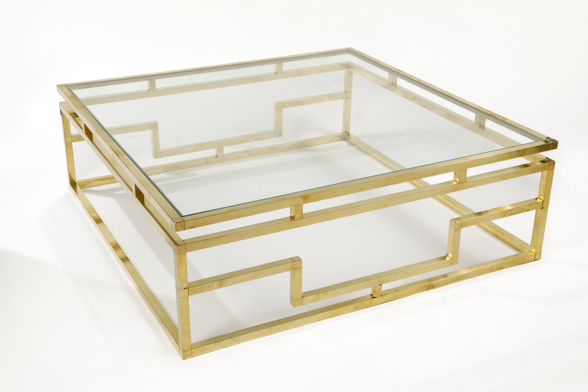 Grande tavolo anni 70, struttura quadrata in ottone con piano in vetro trasparente. Produzione Italiana.