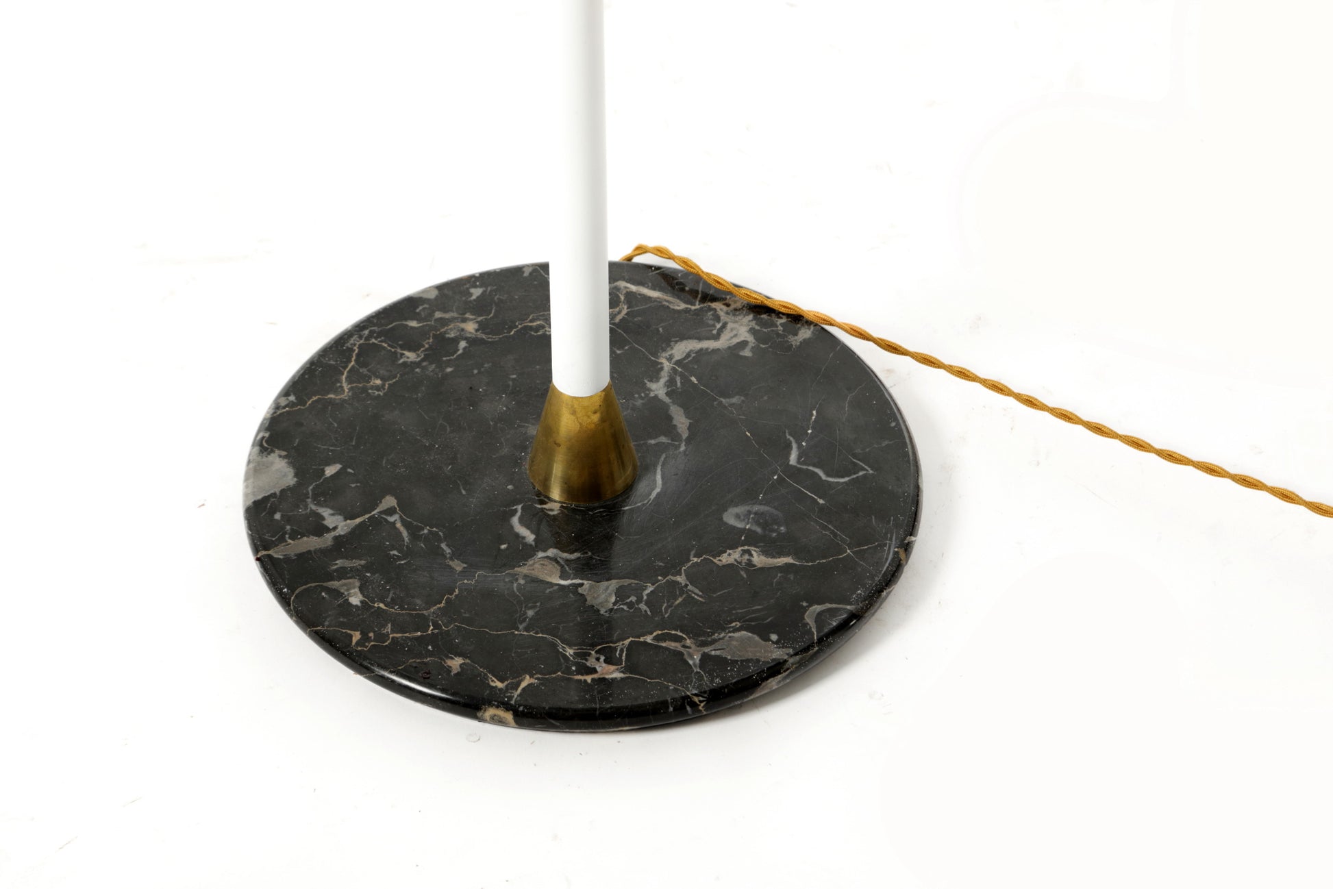 Lampada da terra anni 50, struttura in ottone tinto bianco, base in marmo nero e paralume in paglia intrecciata. Produzione Italiana.