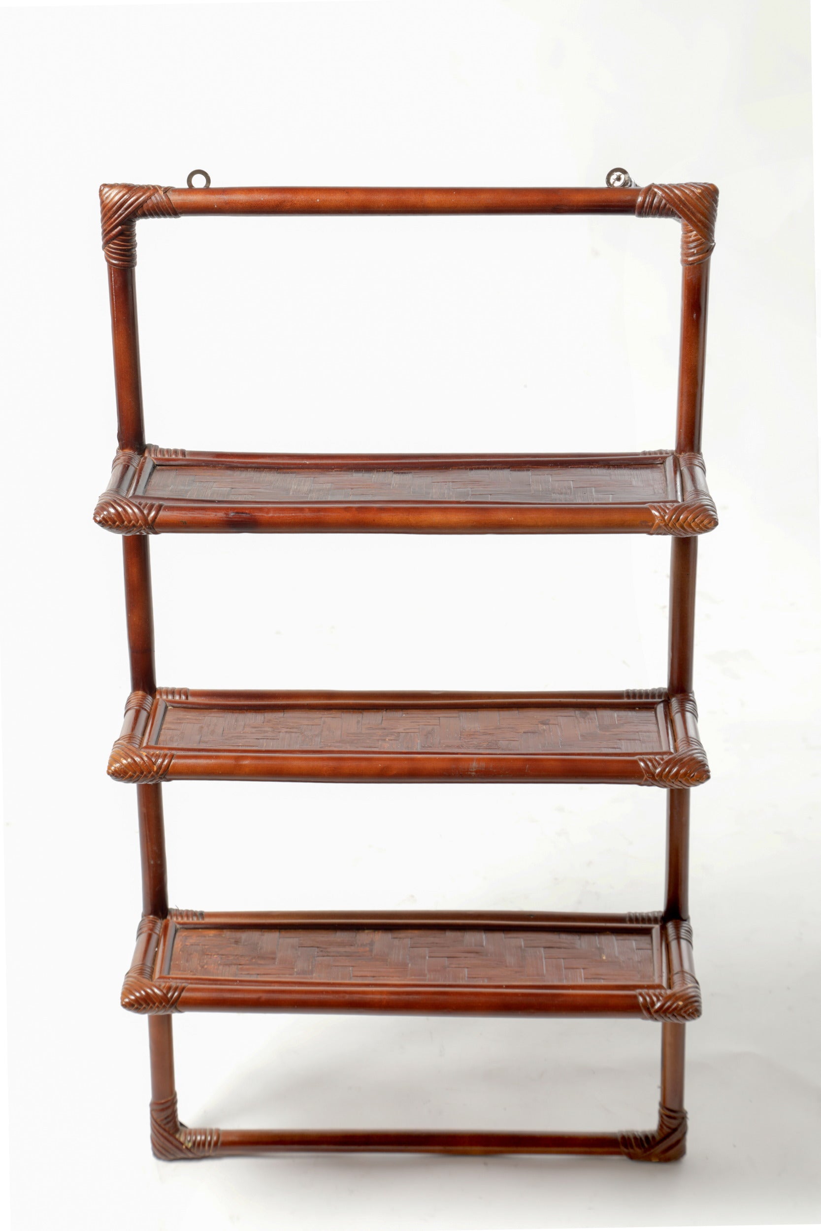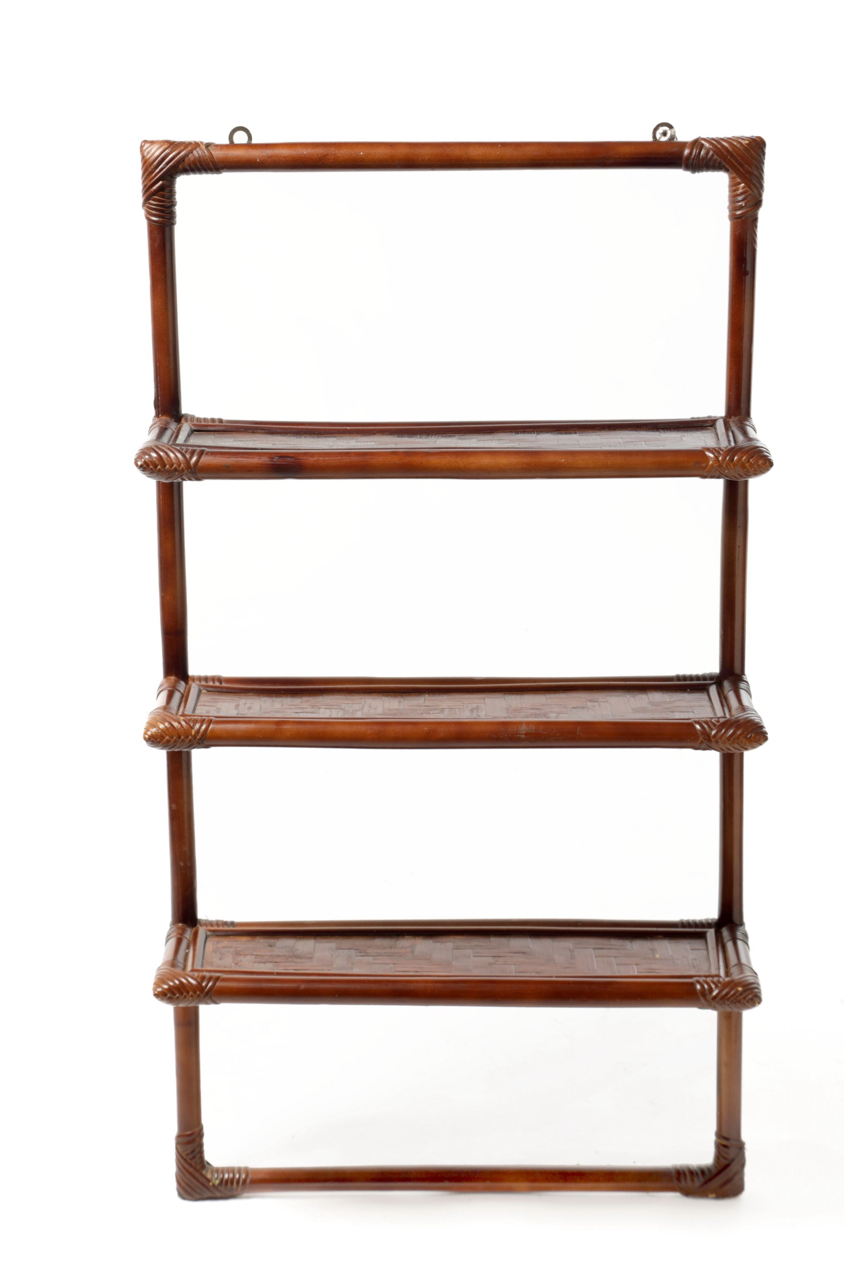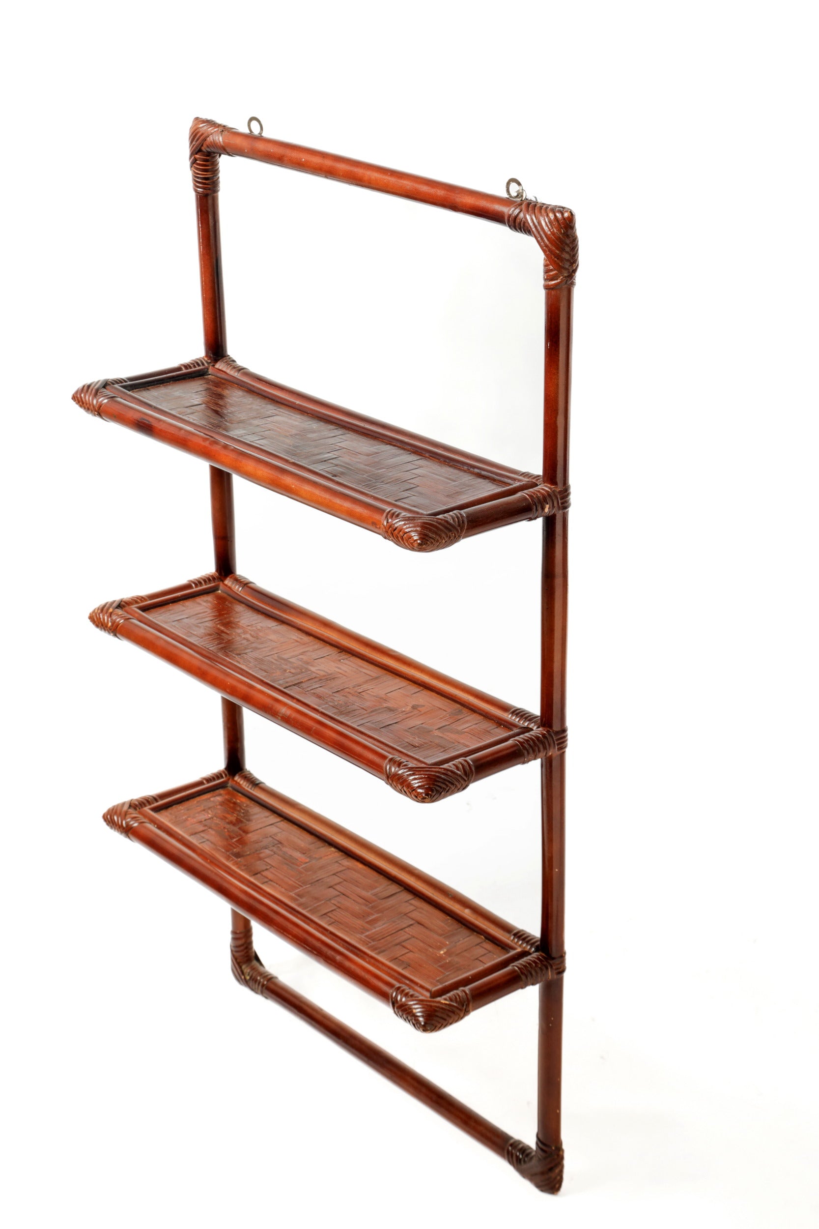 Piccola libreria sospesa anni 70, Struttura a treripiani in bamboo, rattan pressato e paglia. Produzione Italiana.