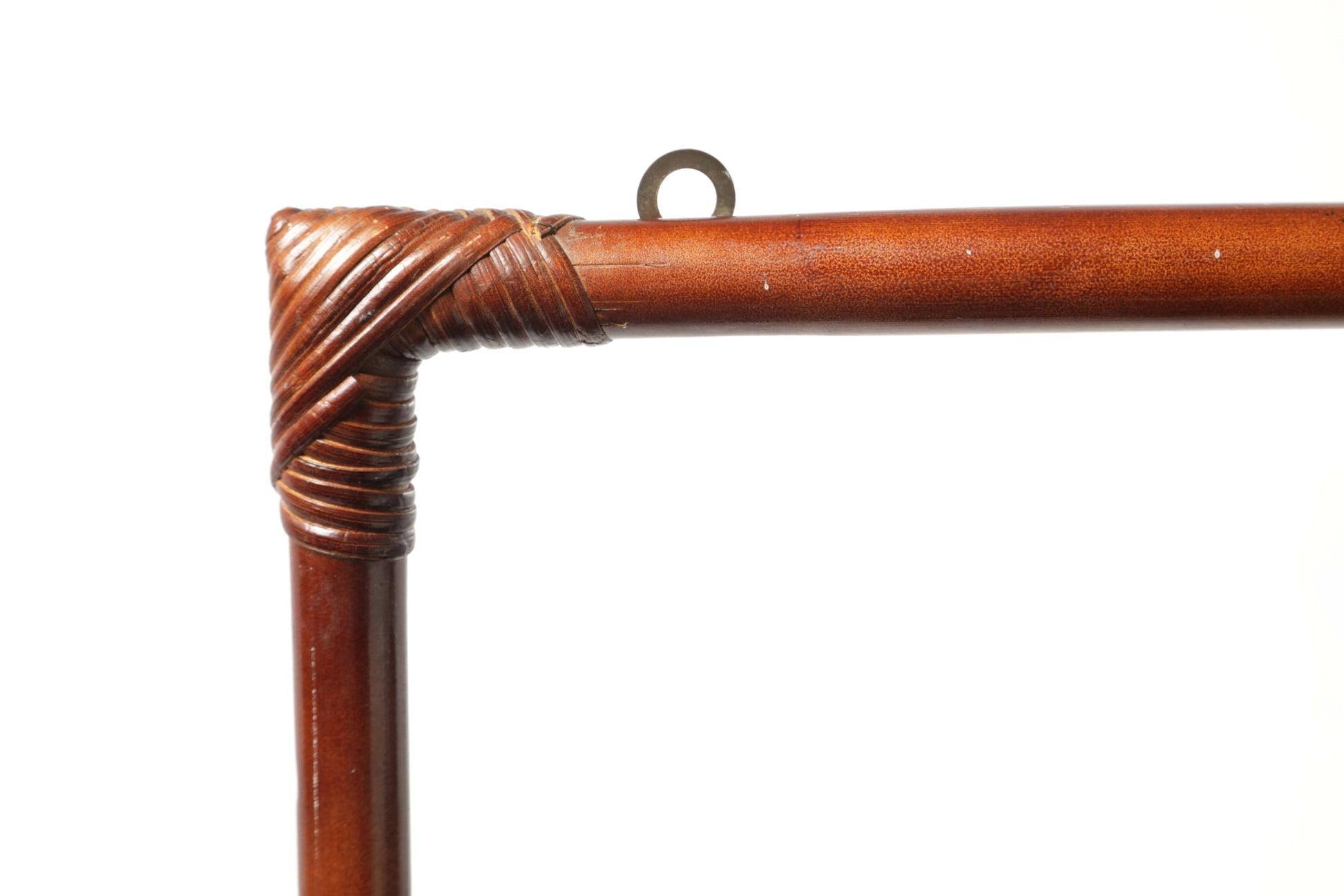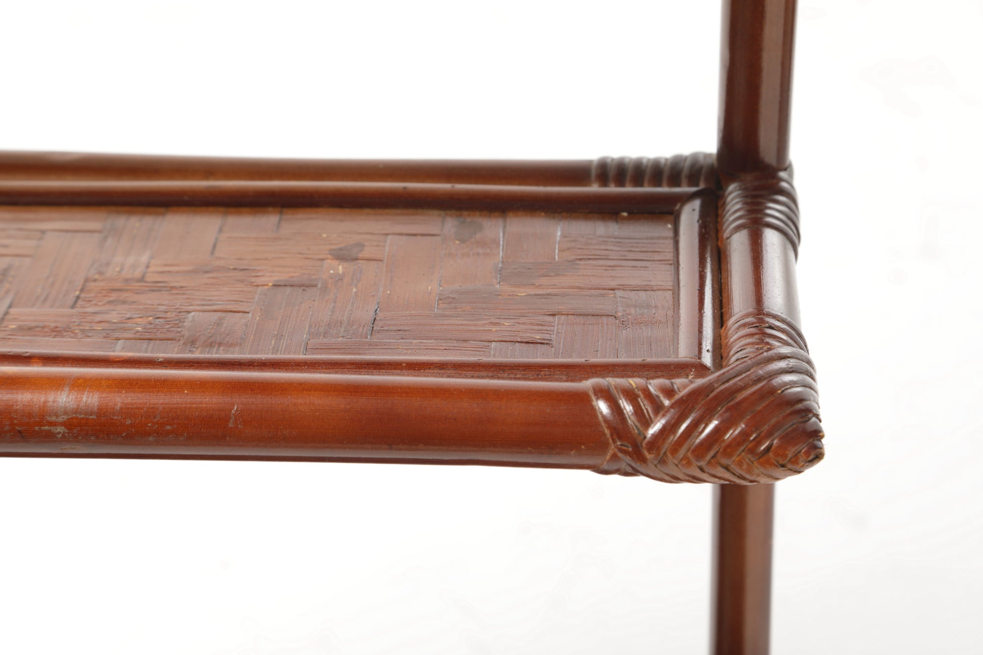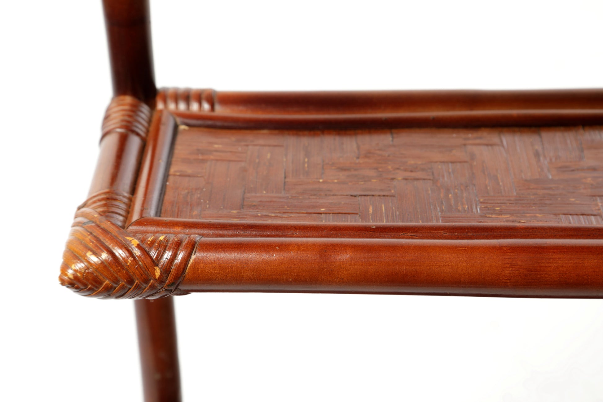 Piccola libreria sospesa anni 70, Struttura a treripiani in bamboo, rattan pressato e paglia. Produzione Italiana.