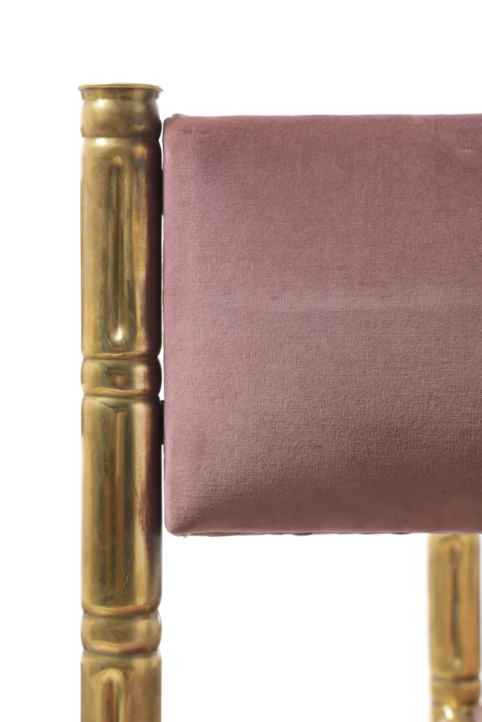 Quattro sedie anni 70,struttura in ottone con decoro bamboo, seduta e schienale reinterpretati t r i p l e f in velluto mauve anni 70. Produzione Italiana.