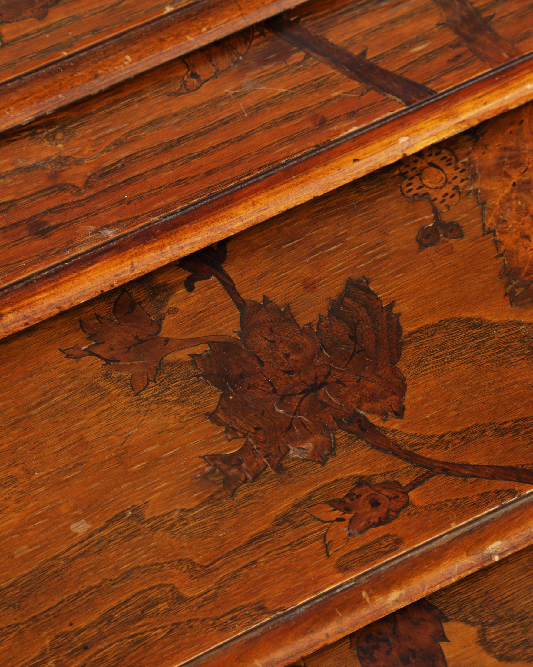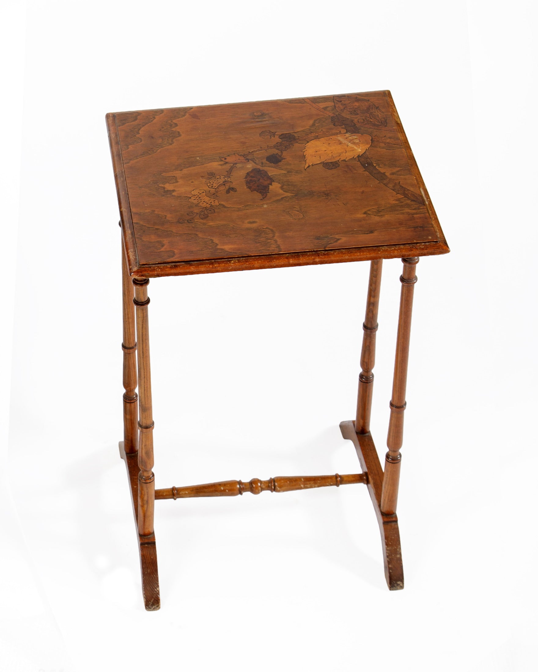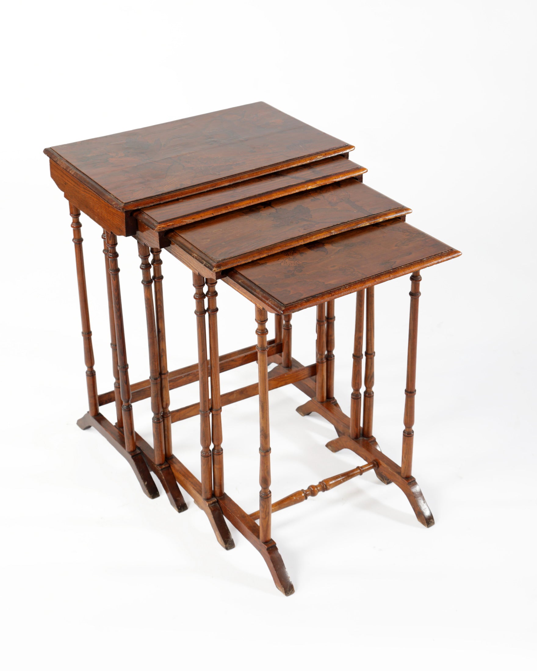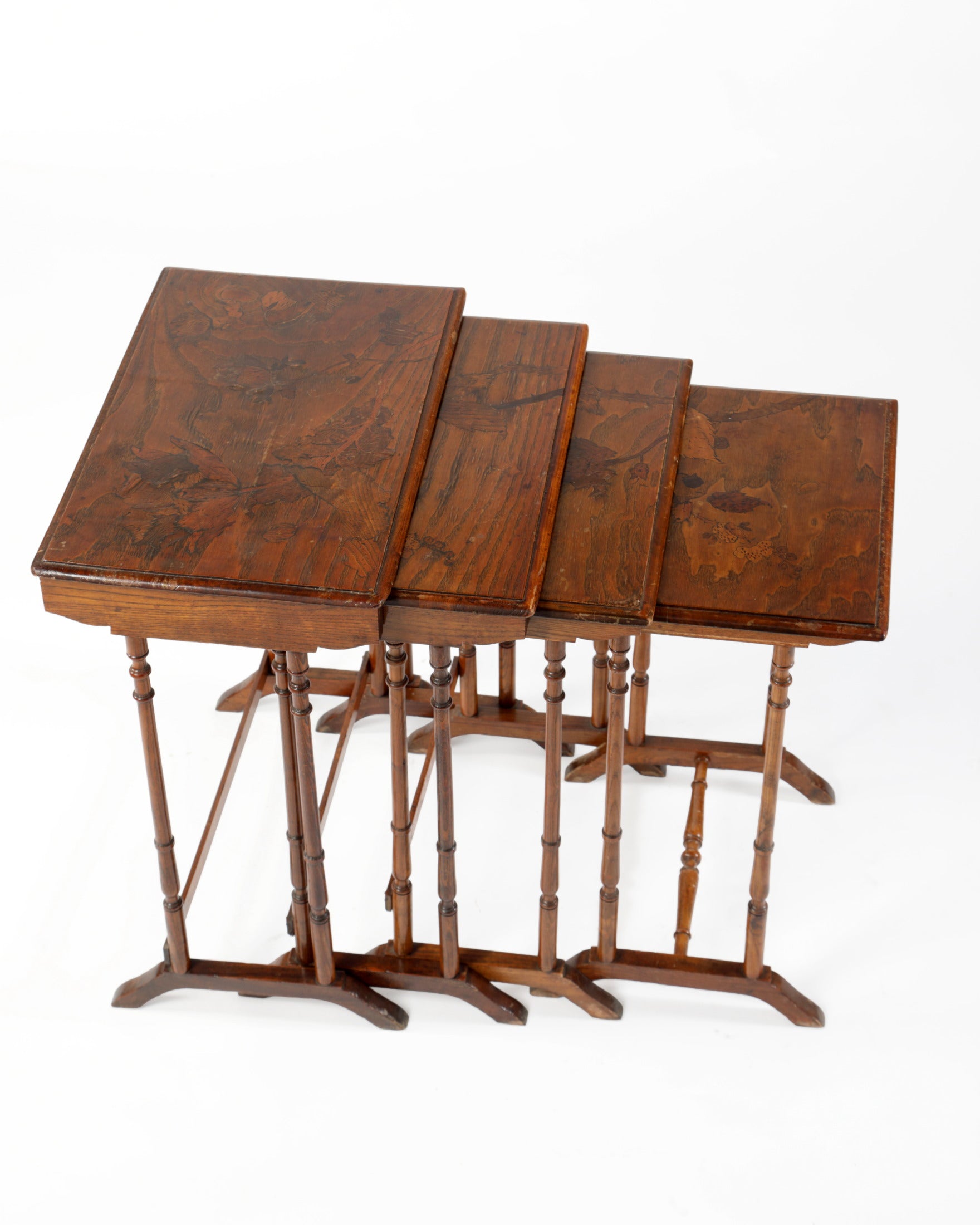 Quattro tavoli impilabili 900, in legno di mogano con piano a decori floreali intarsiati. Produzione Inglese.