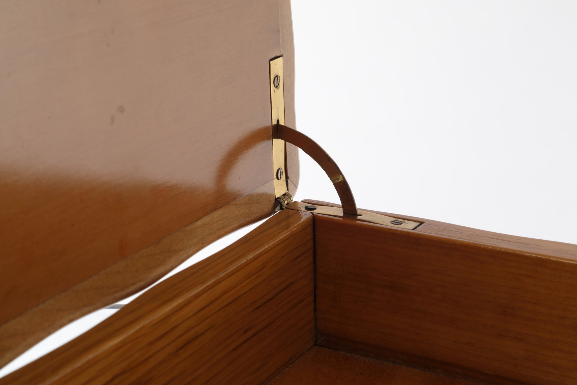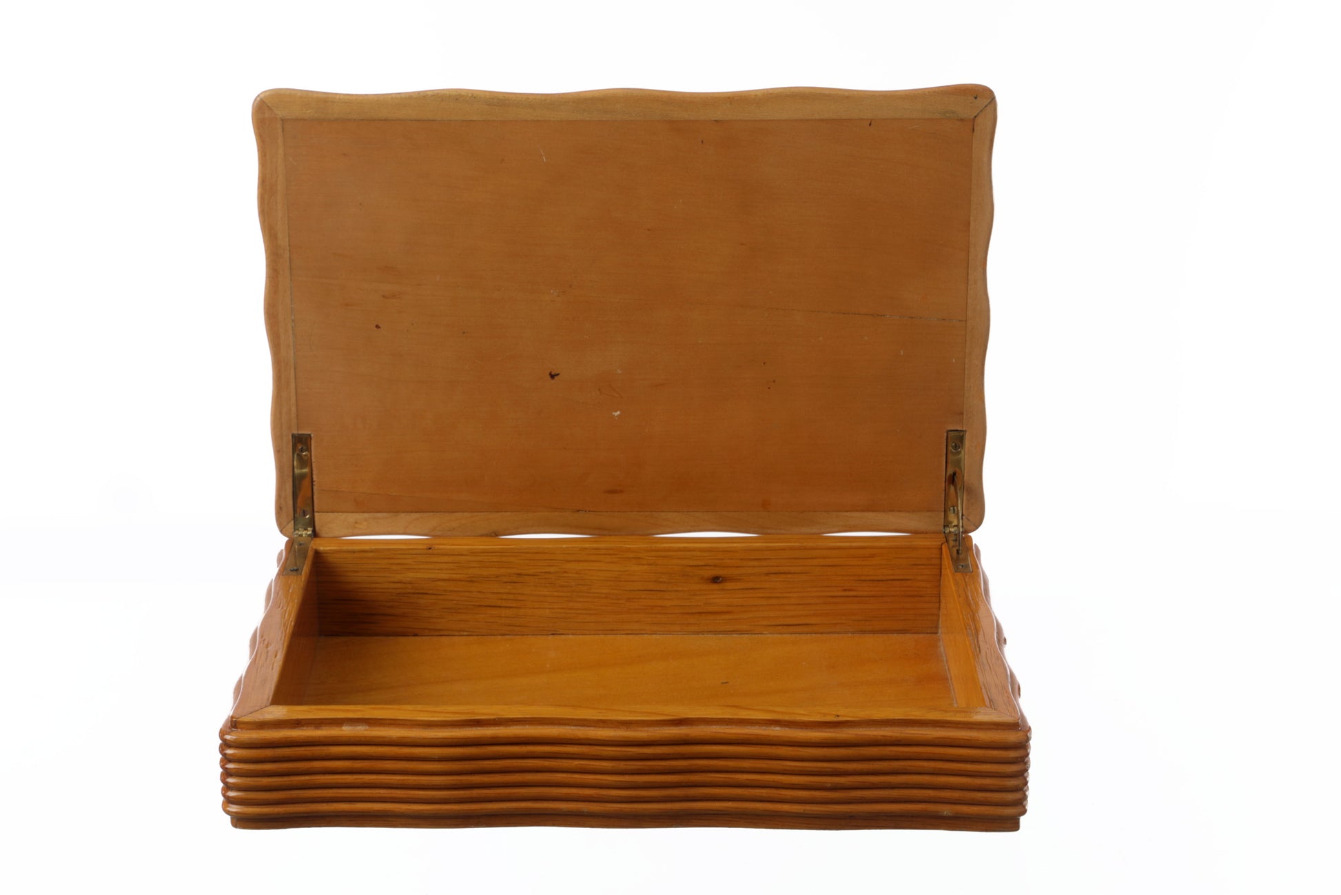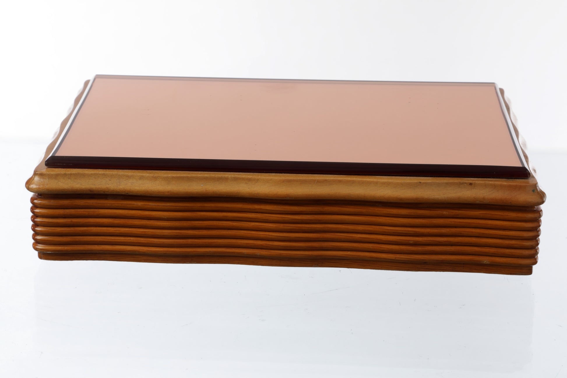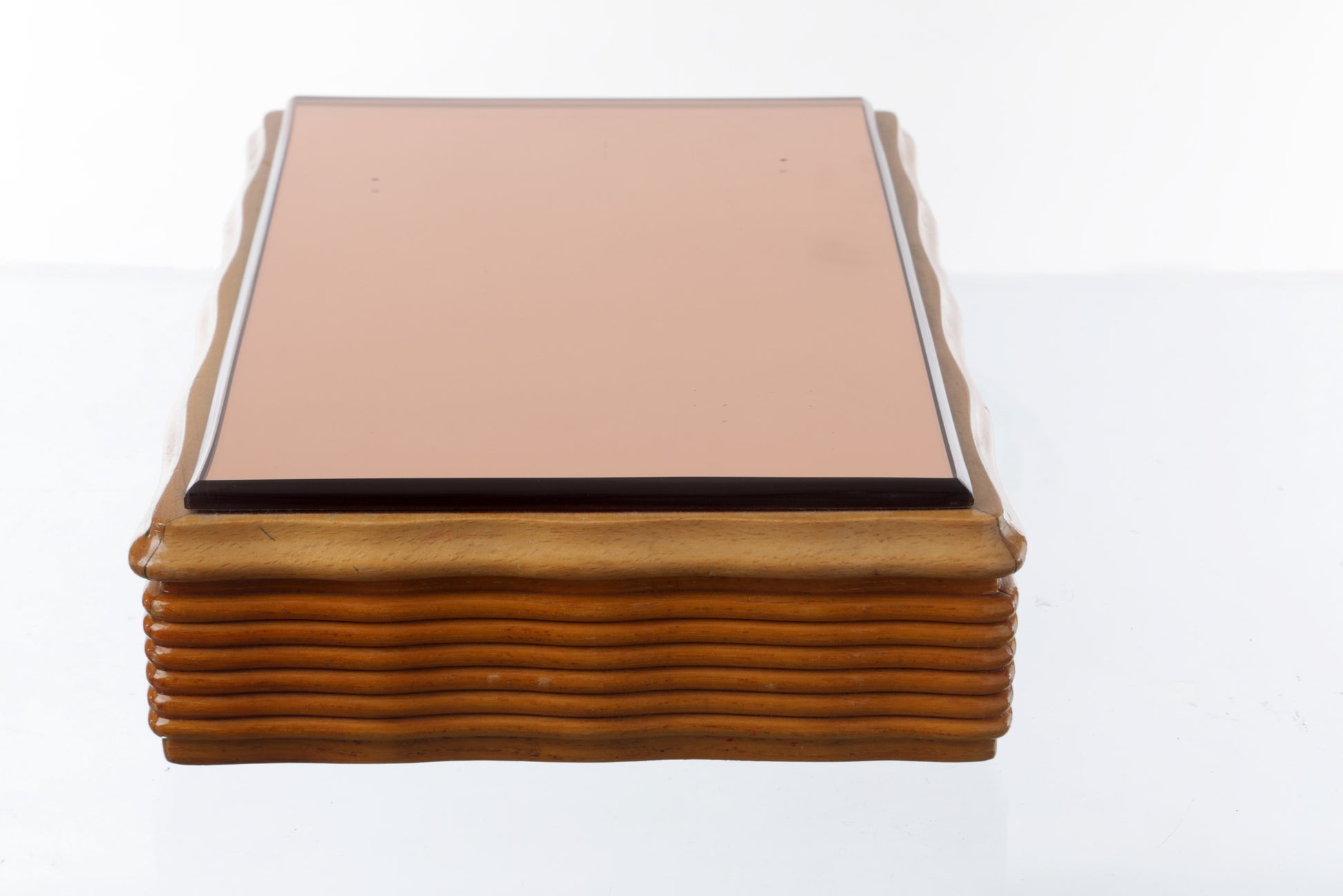Scatola in legno grissinato, lavorazione ondulata, coperchio in vetro specchiato rosa. Attribuibile alla produzione di Fontana Arte, anni 50.