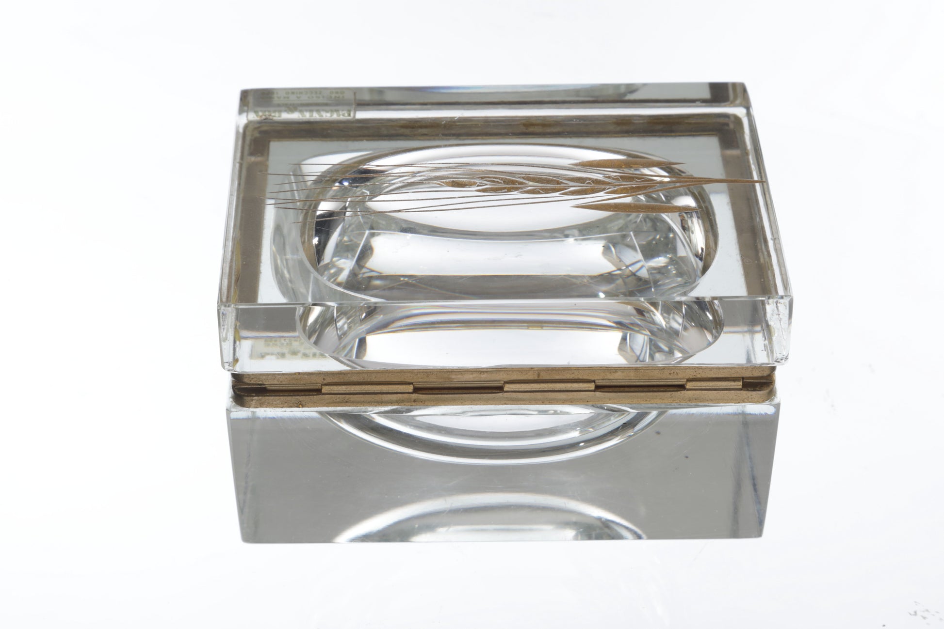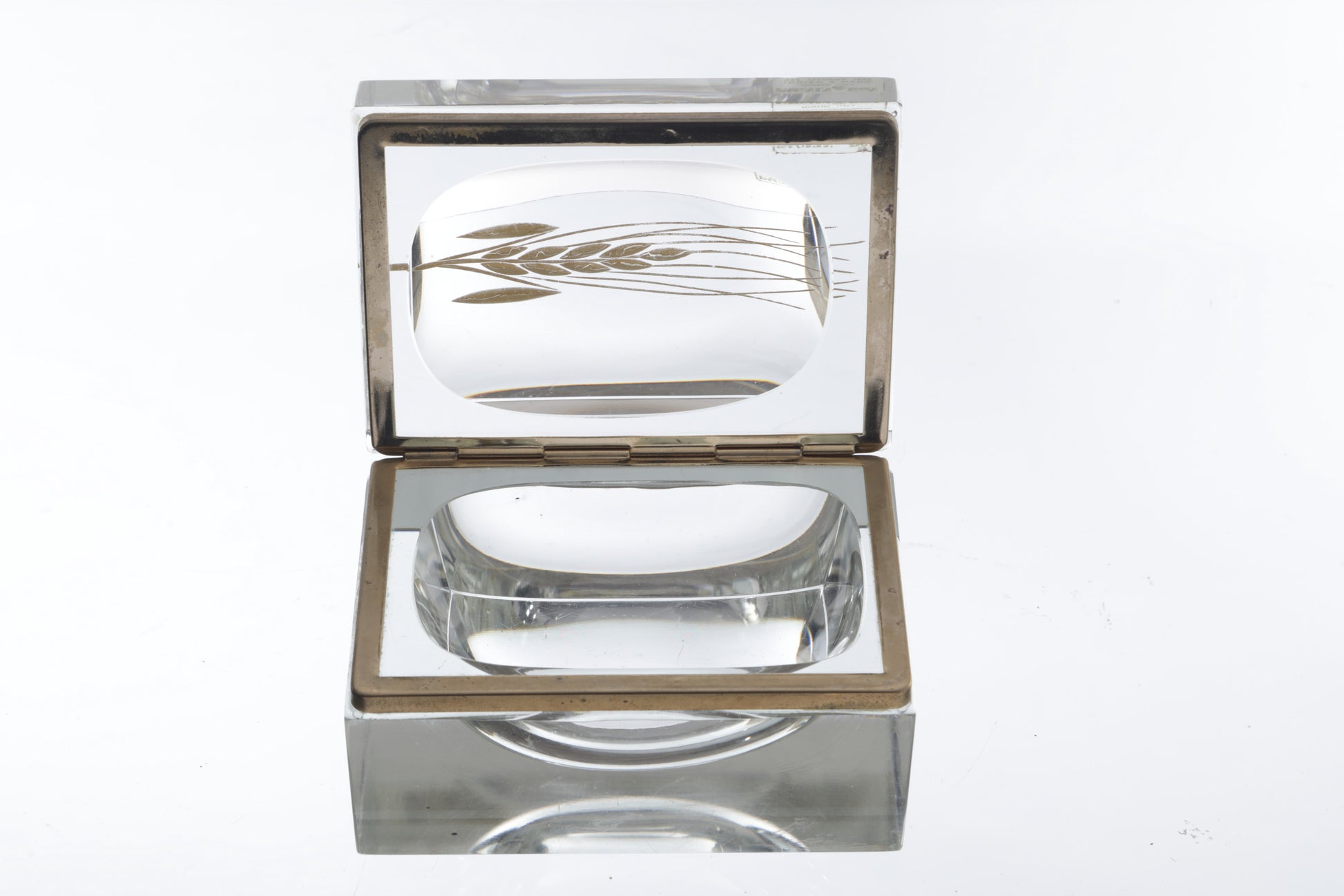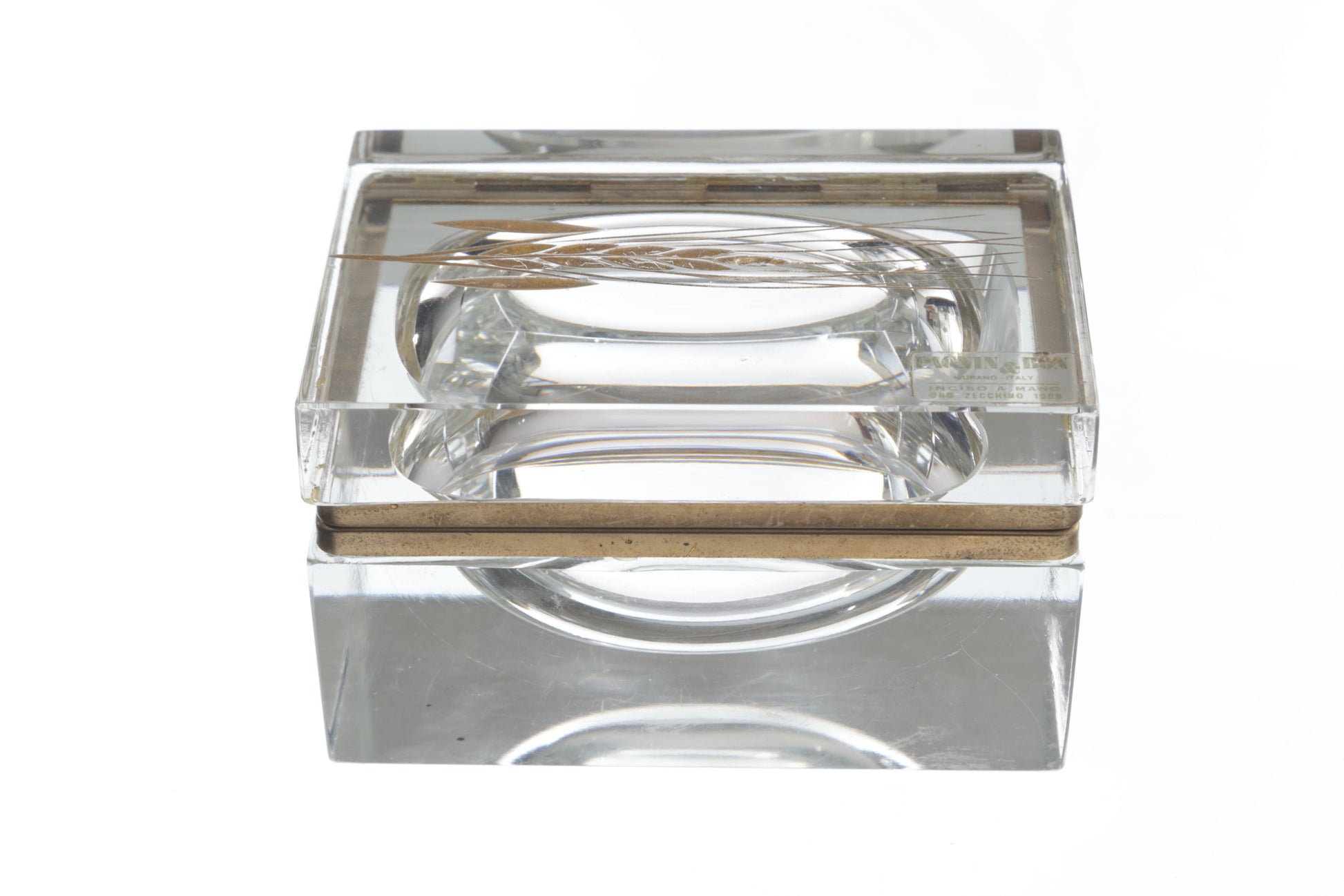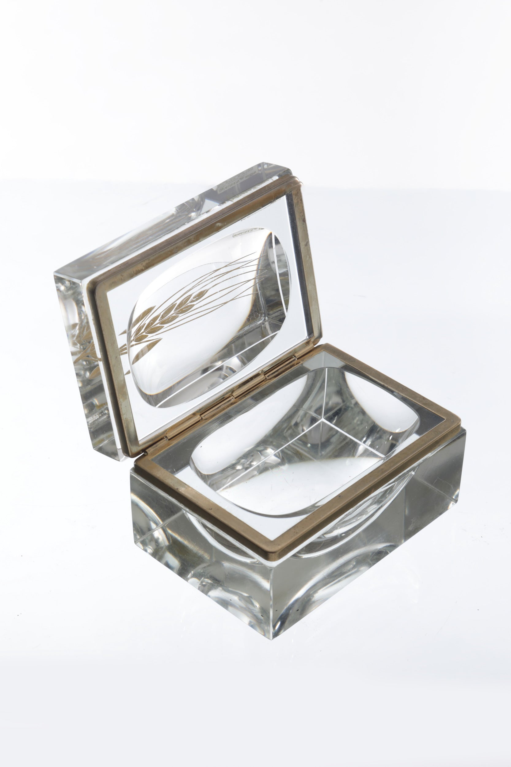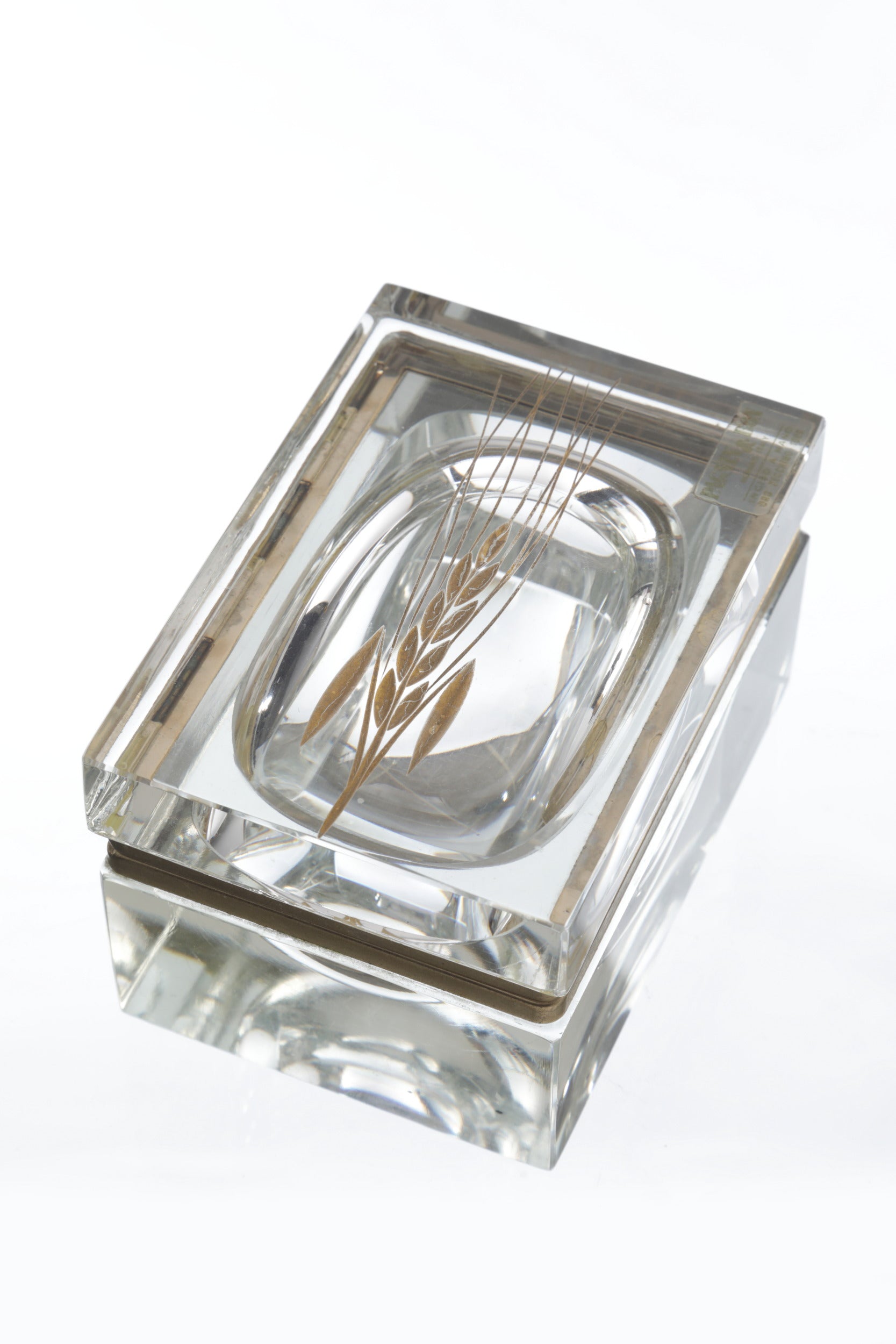 Scatola anni 60, interamente in vetro in vetro di Murano, coperchio inciso con decoro spiga,0 e chiusura in ottone. Produzione Italiana.