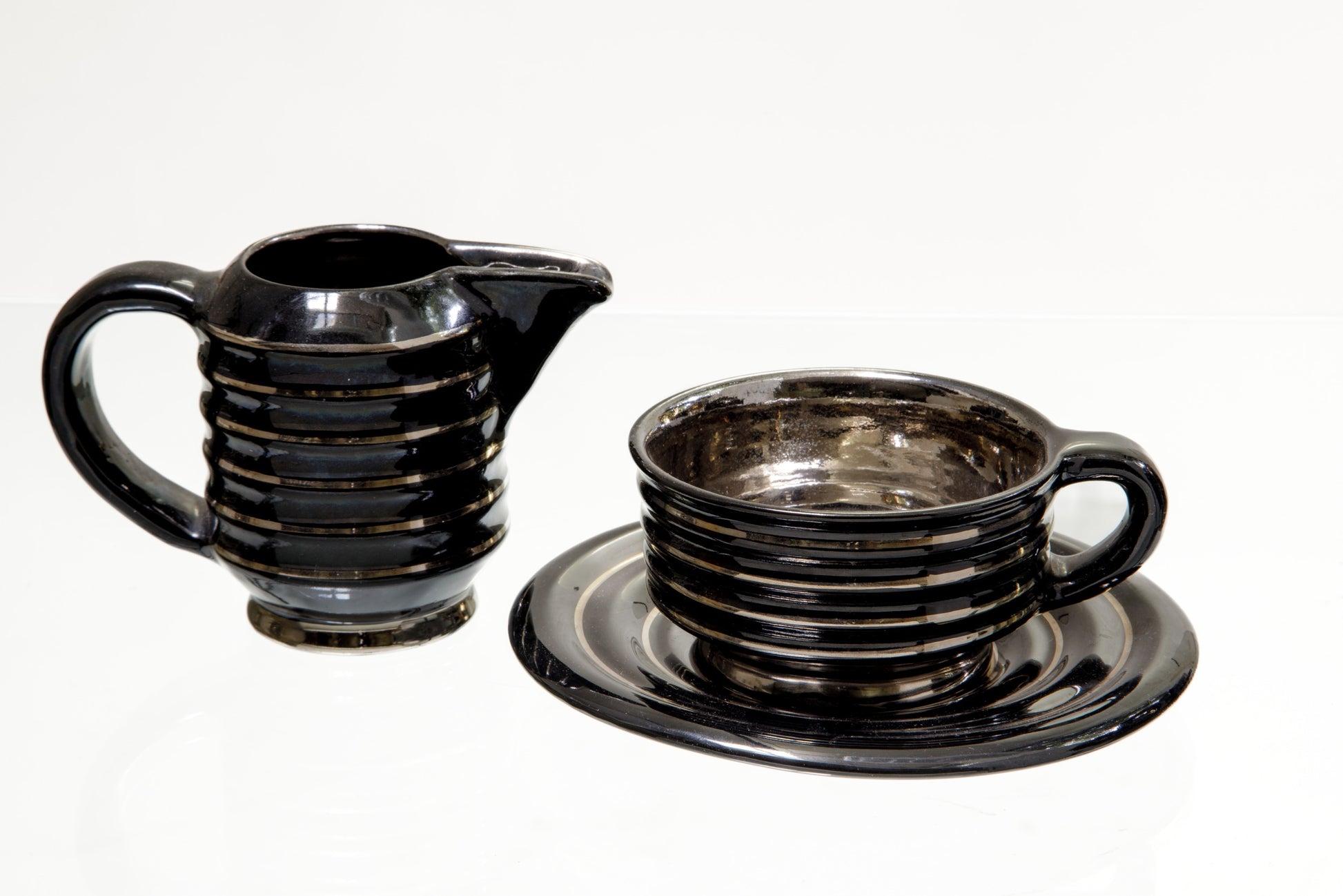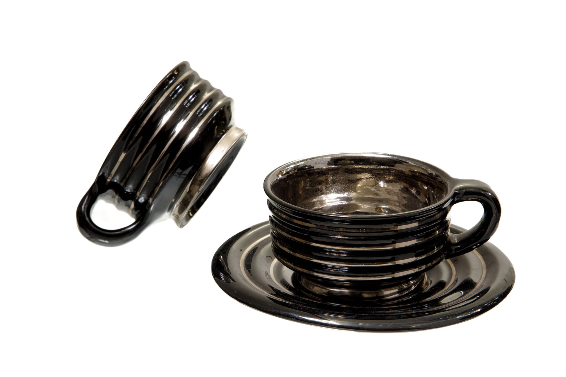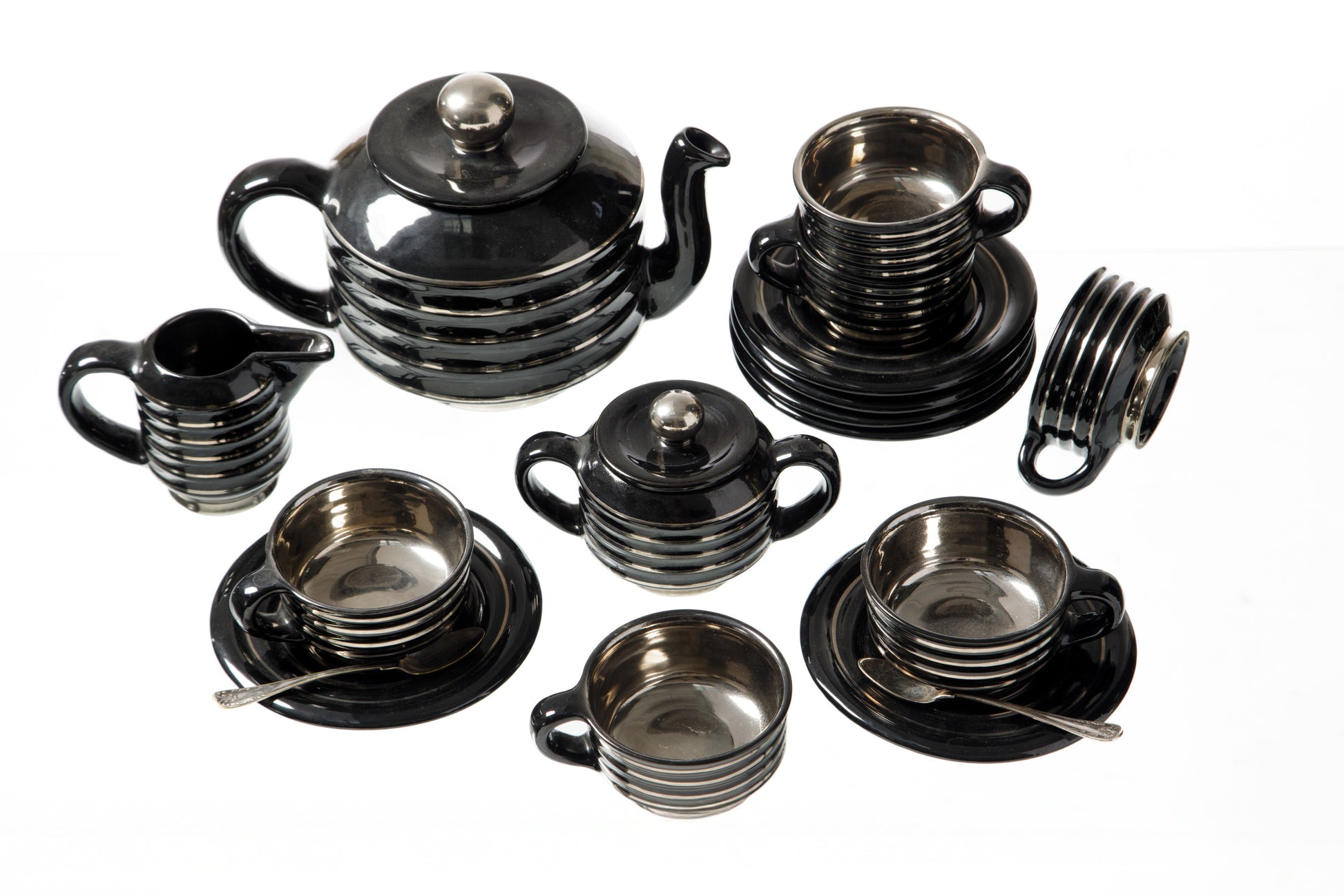 Servizio da tè anni 30, in ceramica nera e argento, composta da 6 tazze, teiera, latteria e zuccheriera. Firma alla base Rometti Umbertide Sacru. Produzione Italiana.