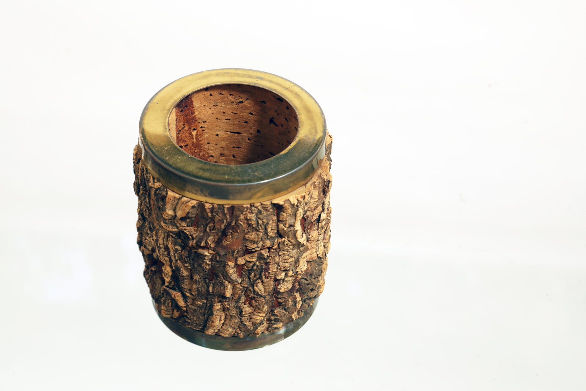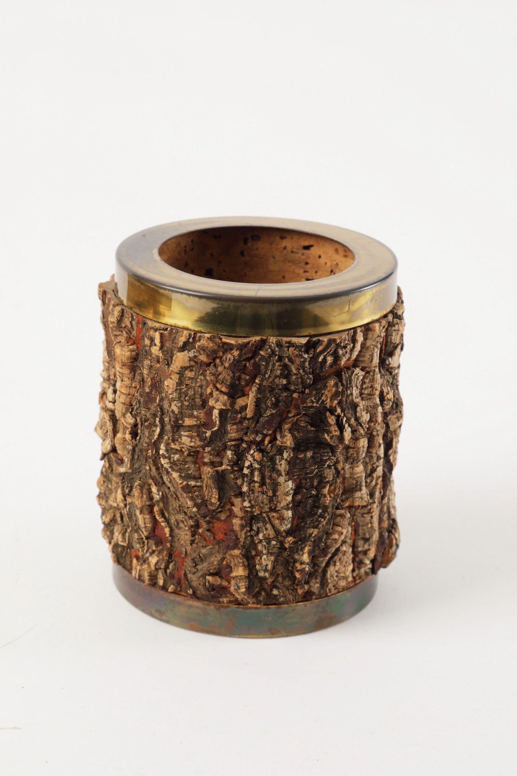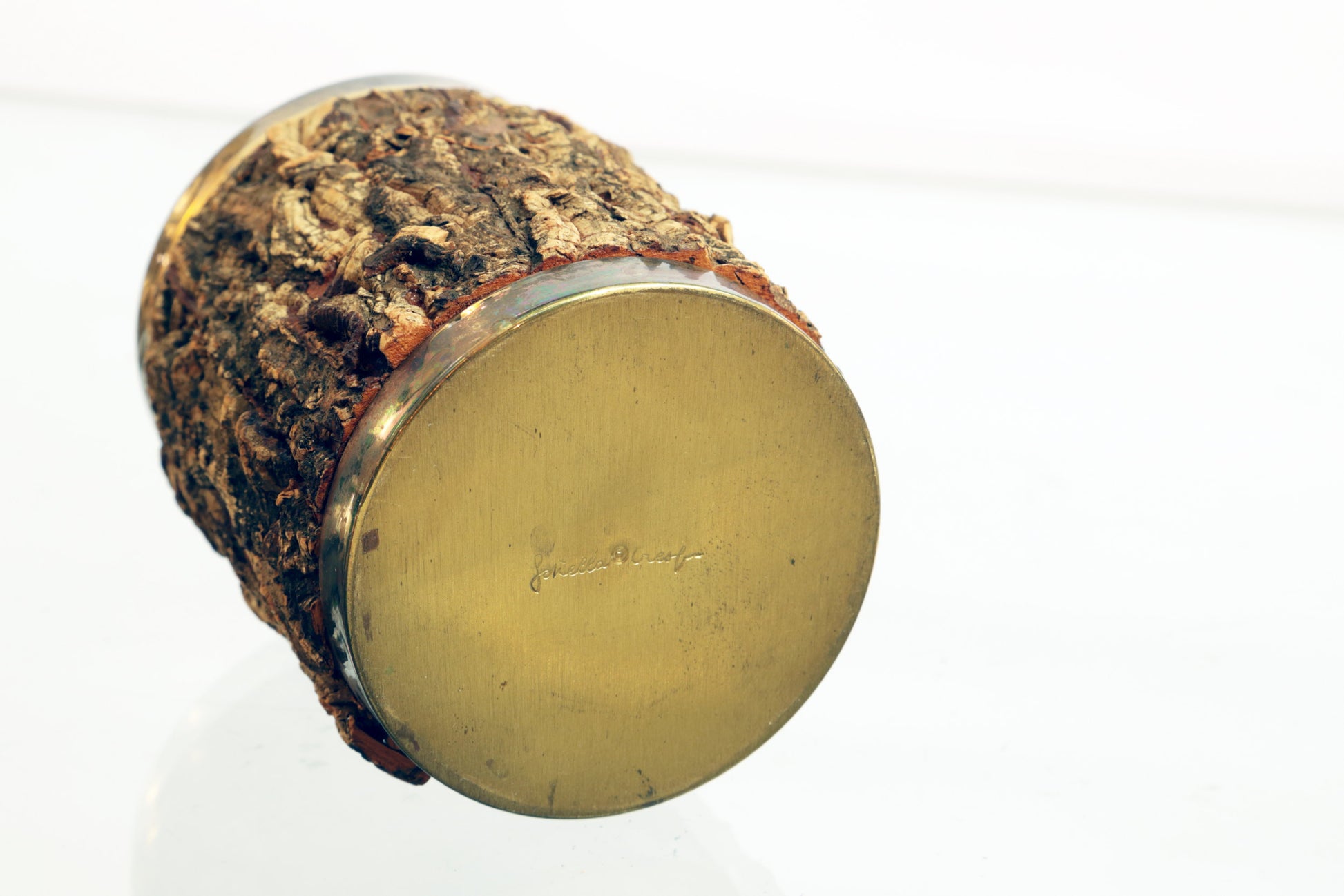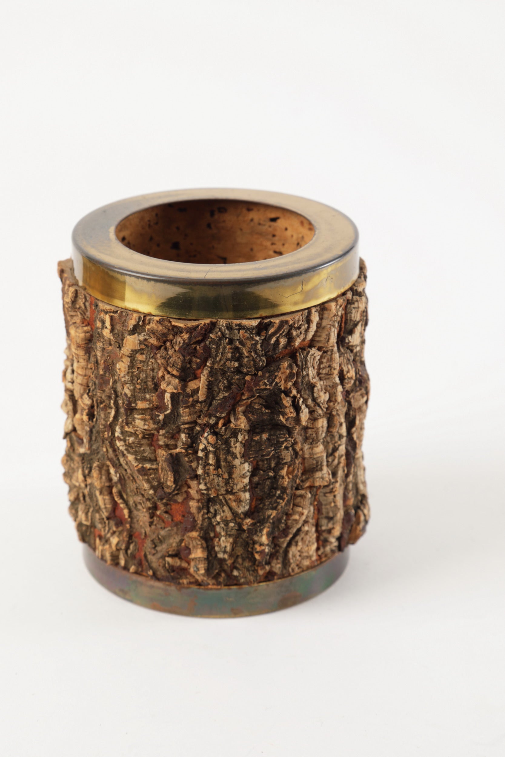 Set scrivania Gabriella Crespi anni 70, composto da due svuota tasche in ottone e vetro e un porta penne in sughero e ottone. Firmati alla base.