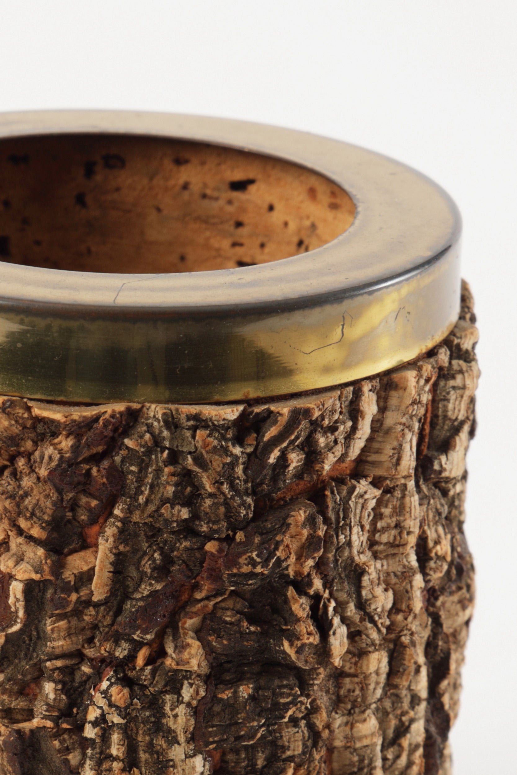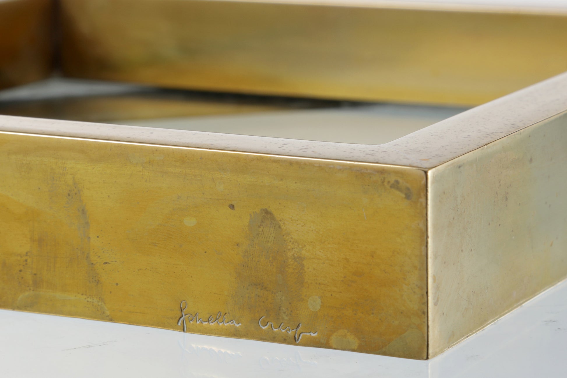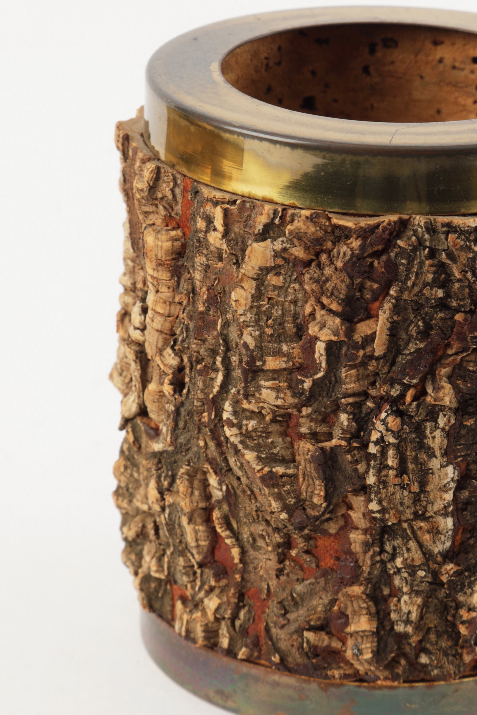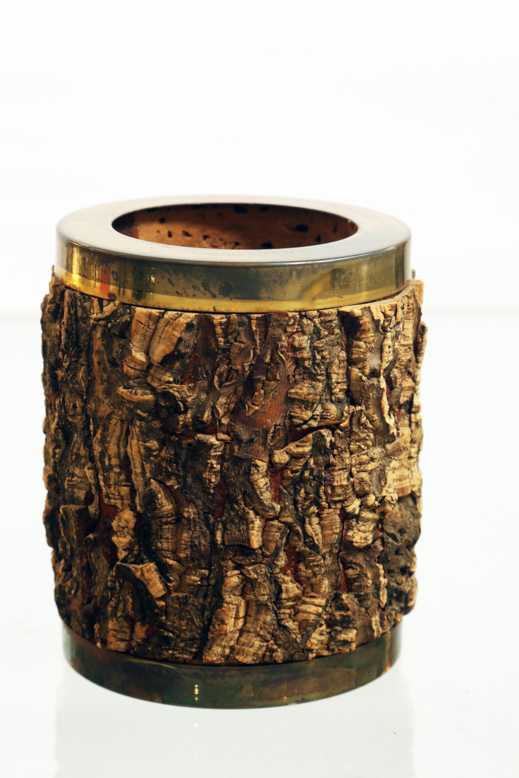 Set scrivania Gabriella Crespi anni 70, composto da due svuota tasche in ottone e vetro e un porta penne in sughero e ottone. Firmati alla base.
