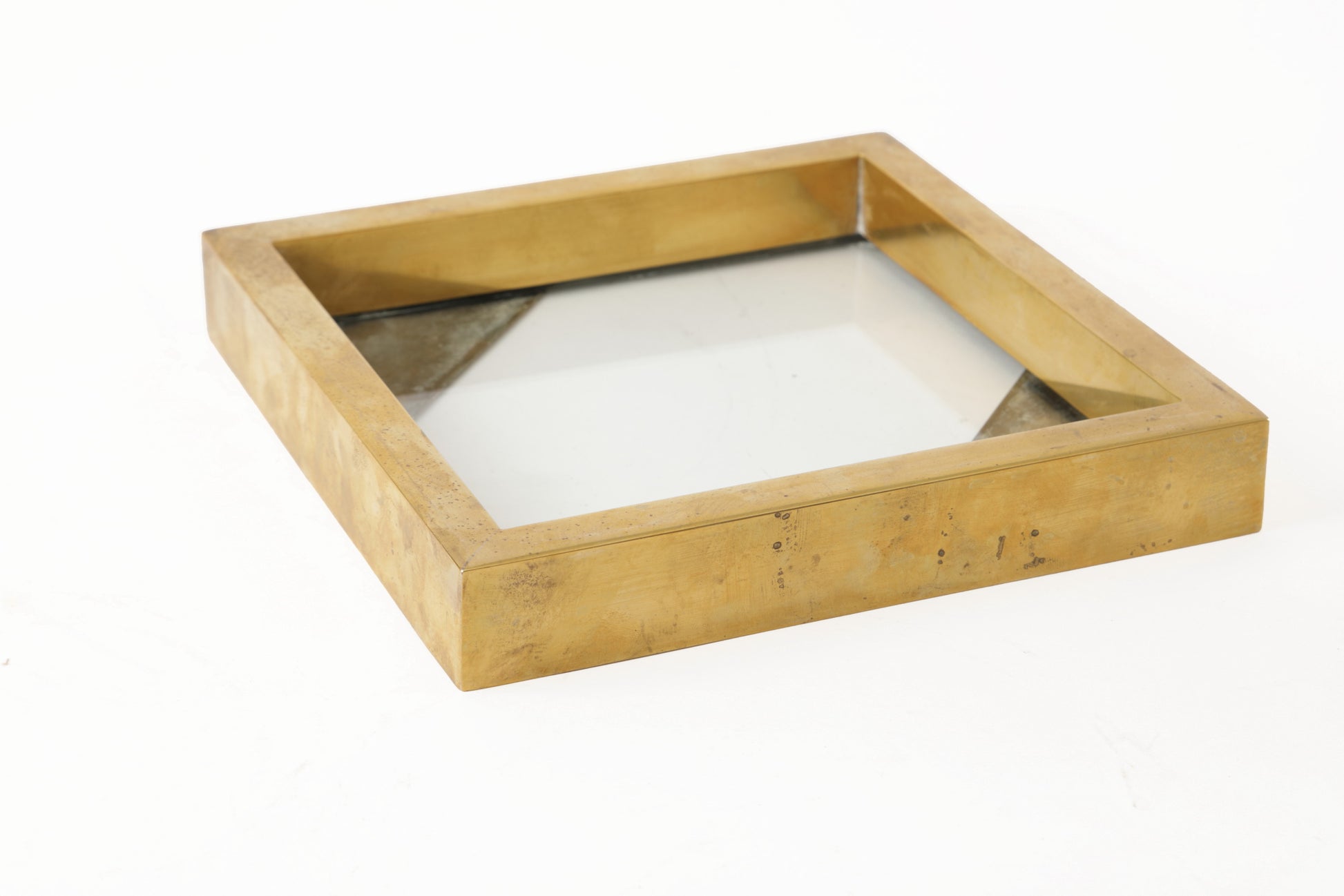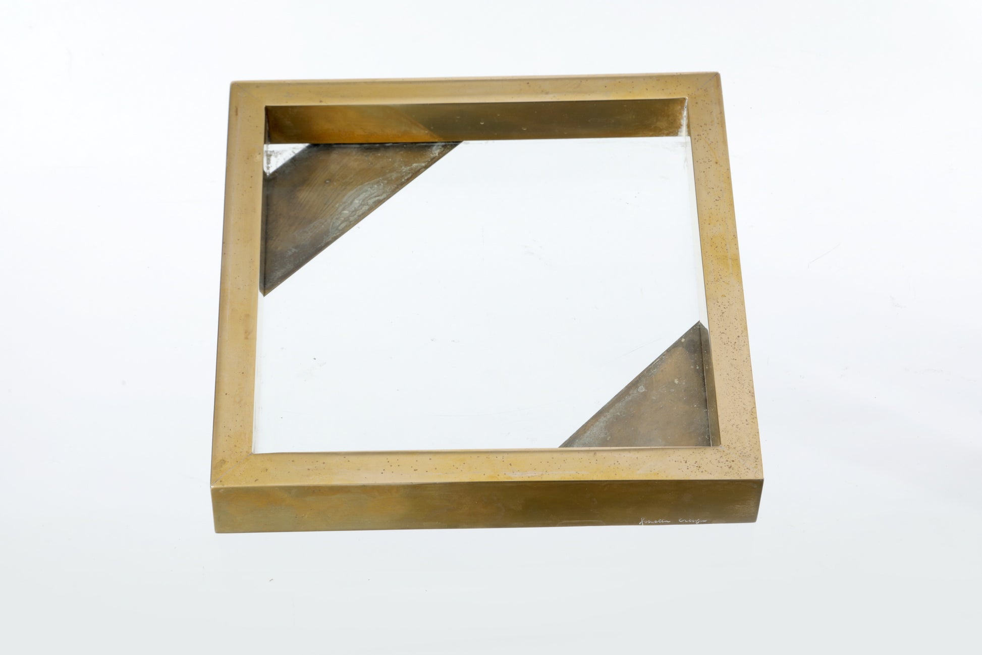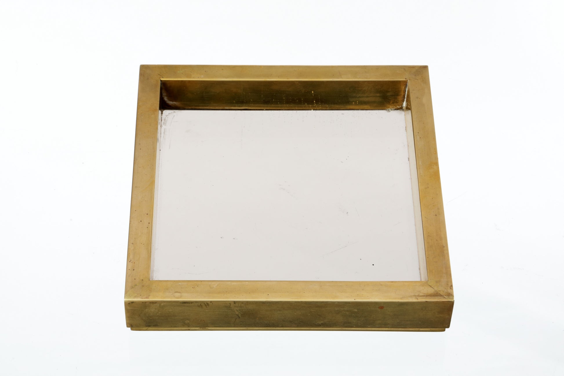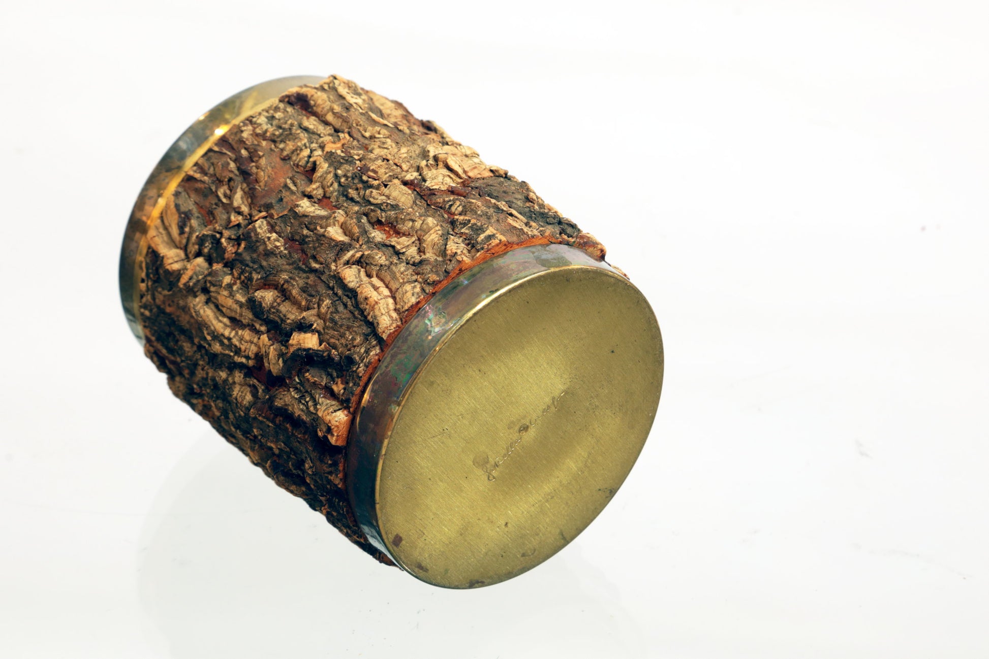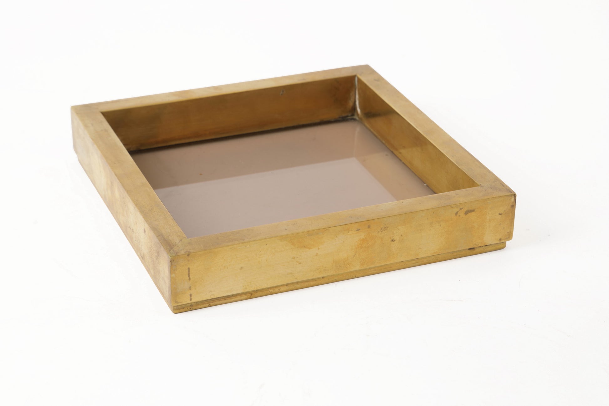 Set scrivania Gabriella Crespi anni 70, composto da due svuota tasche in ottone e vetro e un porta penne in sughero e ottone. Firmati alla base.