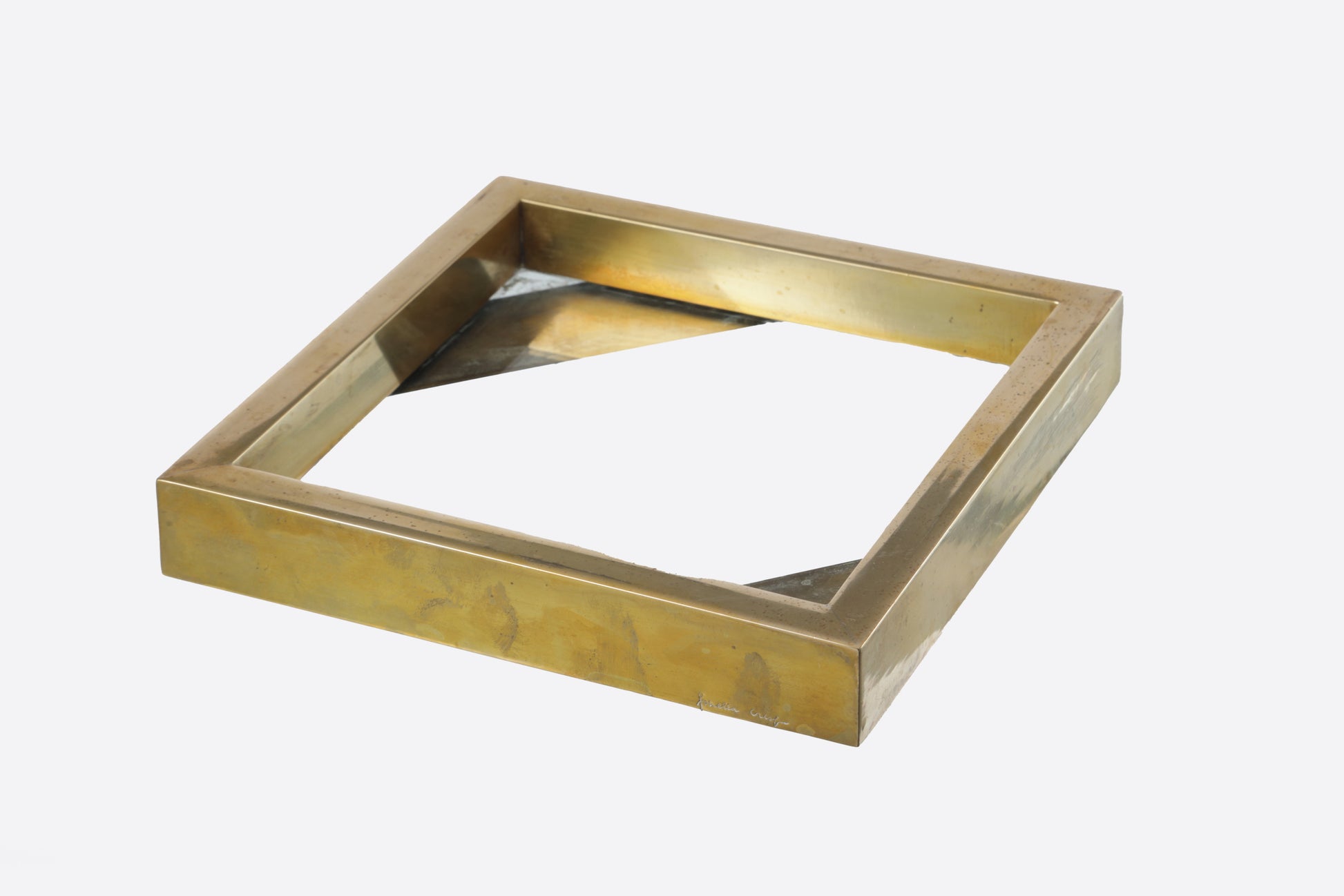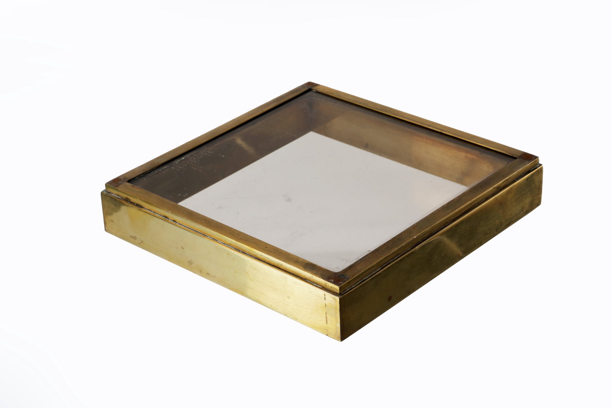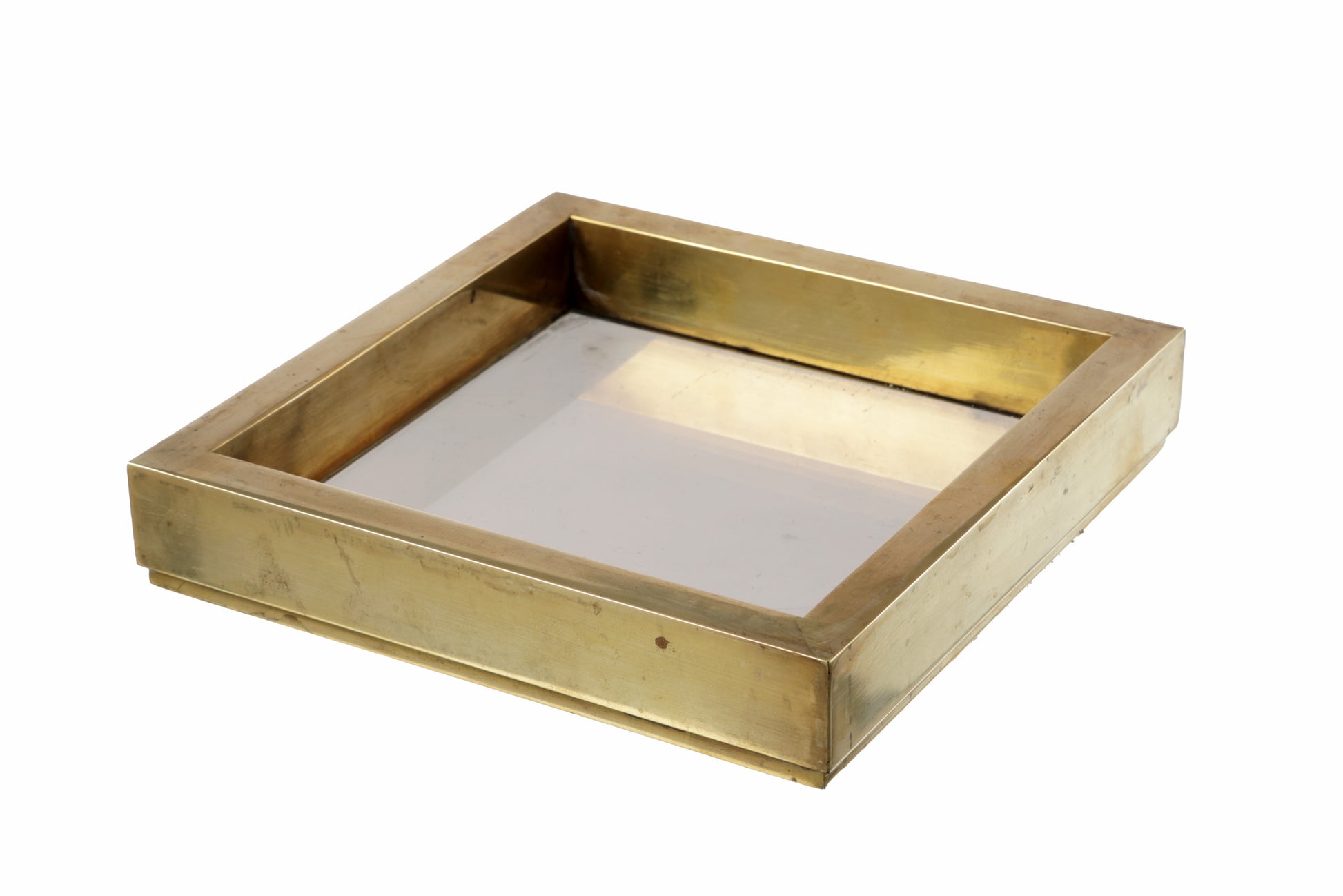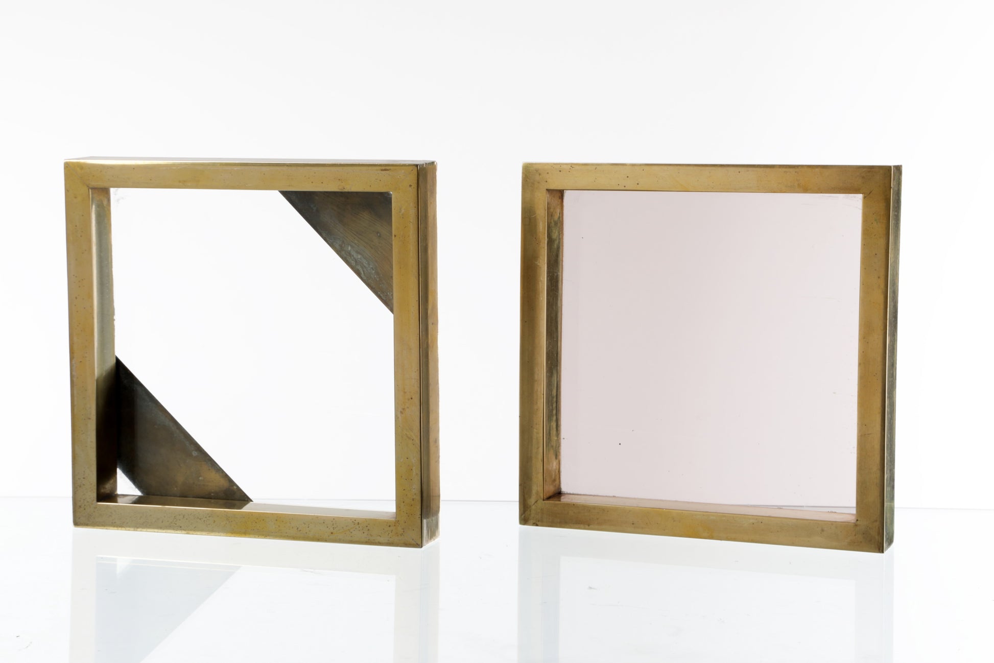 Set scrivania Gabriella Crespi anni 70, composto da due svuota tasche in ottone e vetro e un porta penne in sughero e ottone. Firmati alla base.