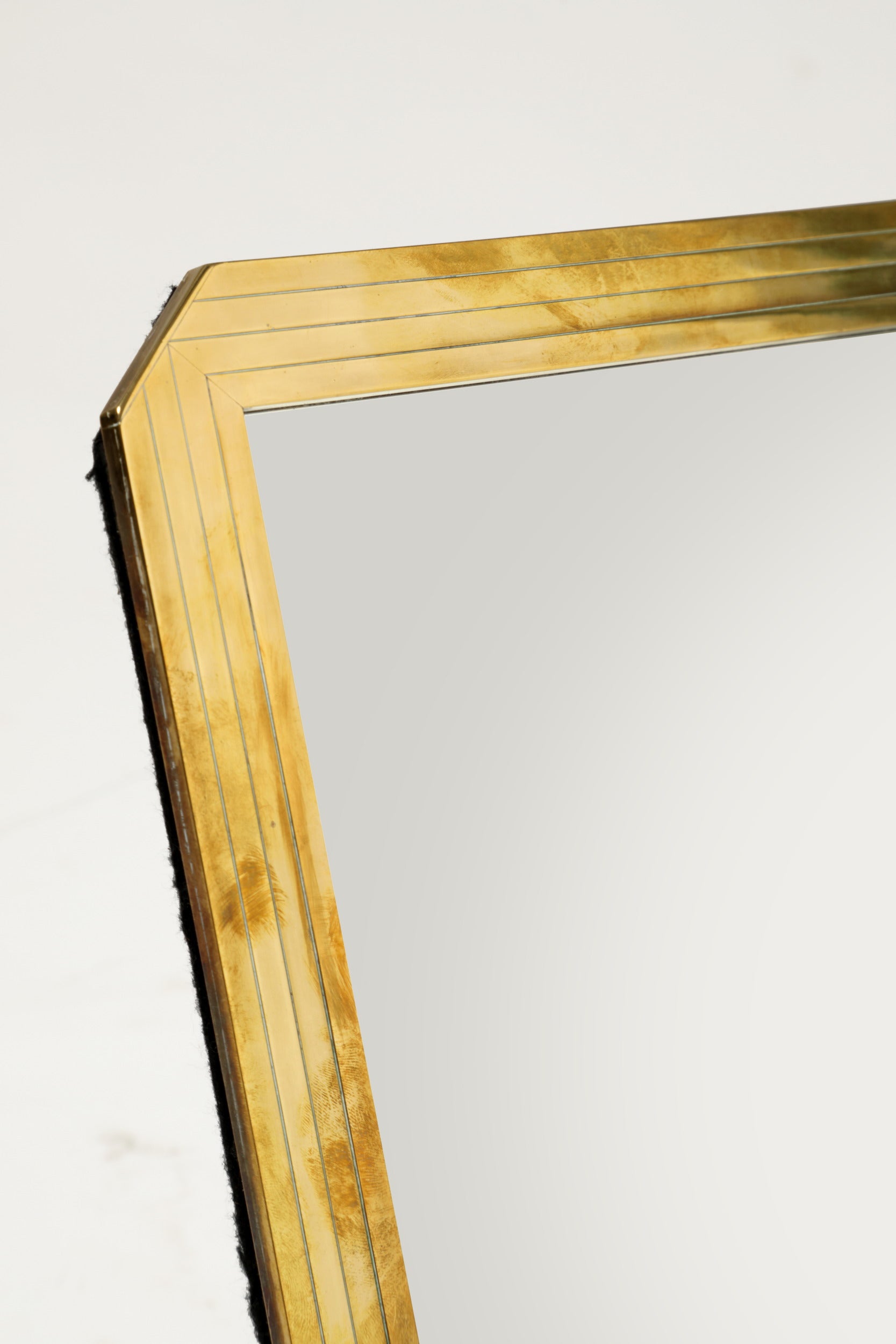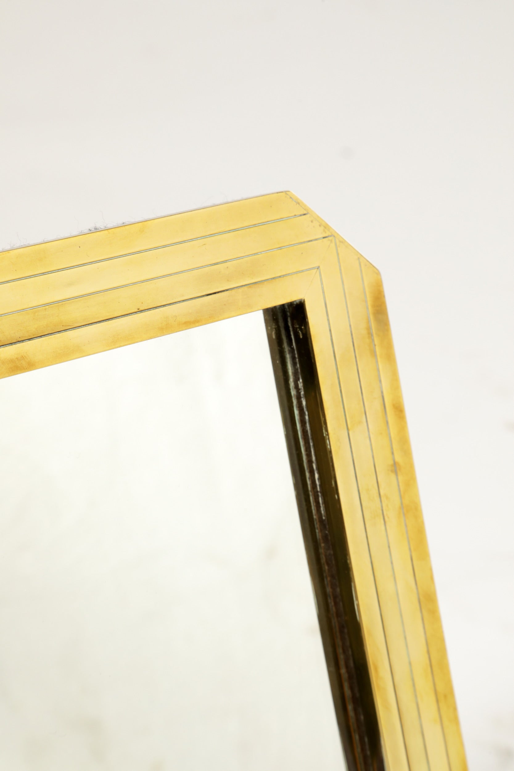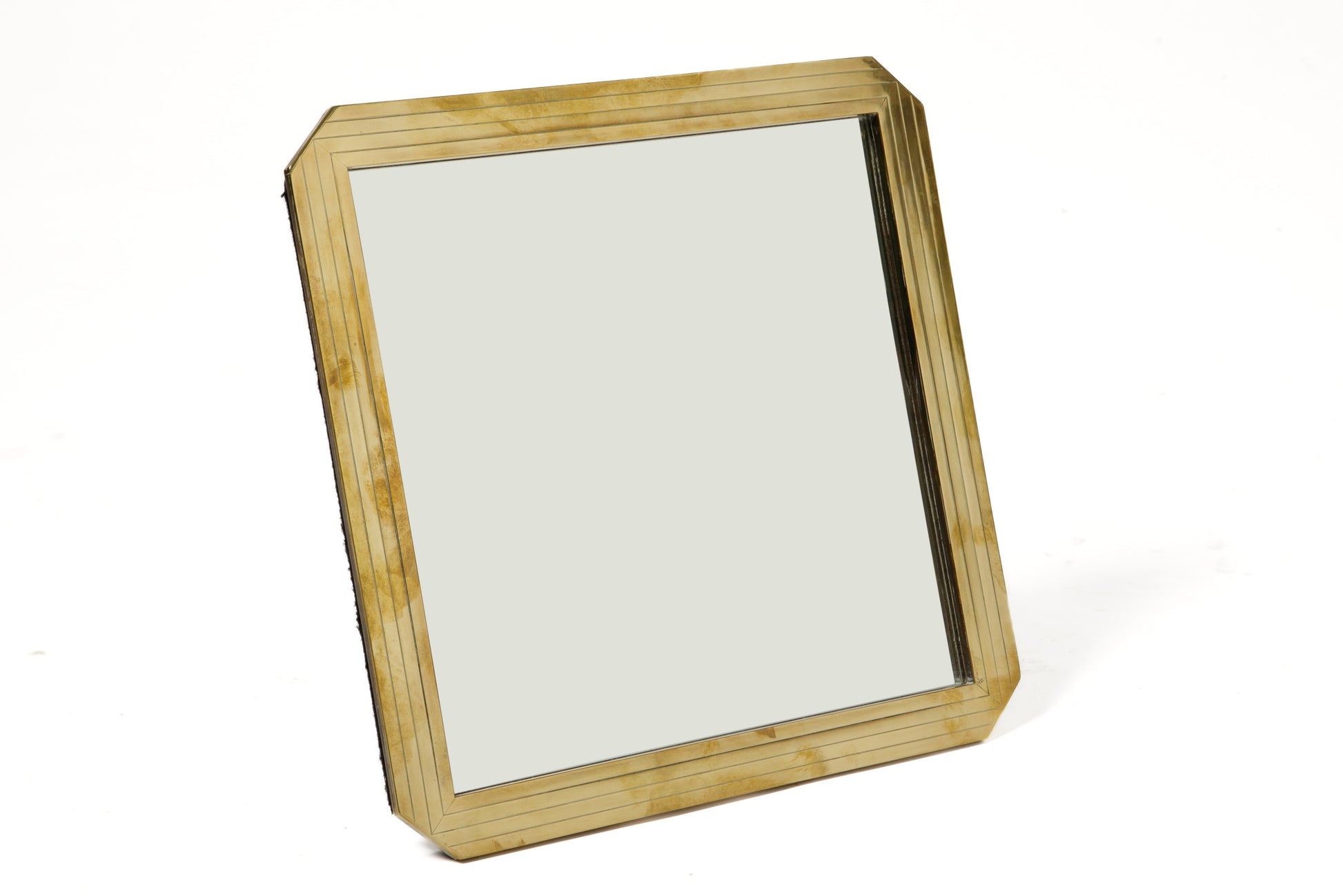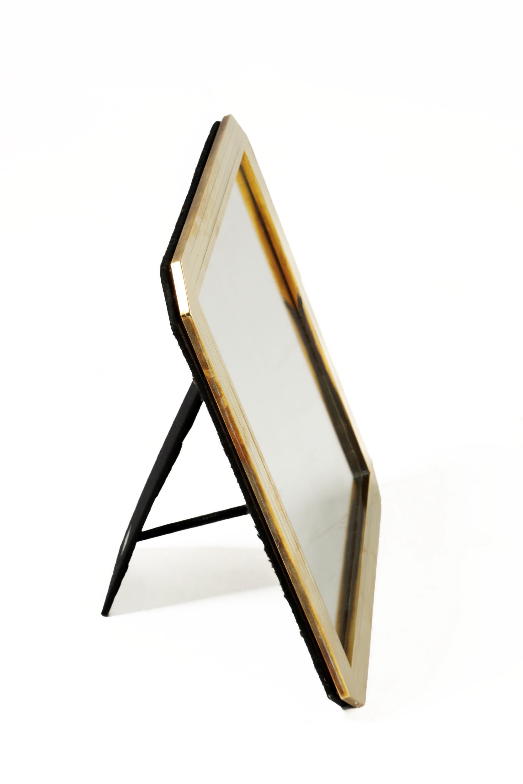 Specchio da tavolo anni 70, cornice quadrata con angoli tagliati in ottone con decoro righe inciso. Produzione Italiana.
