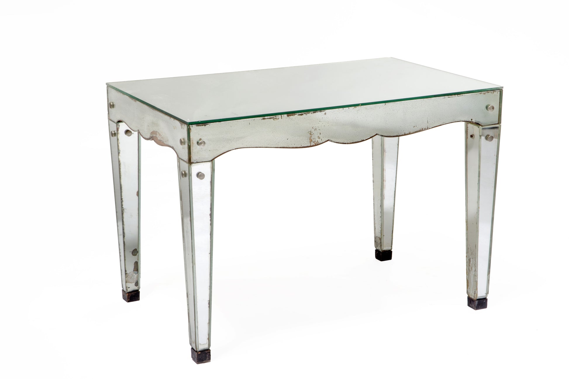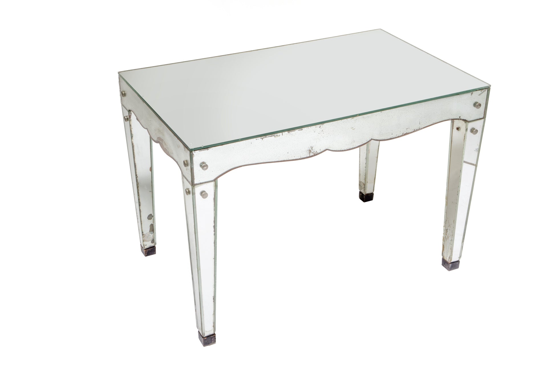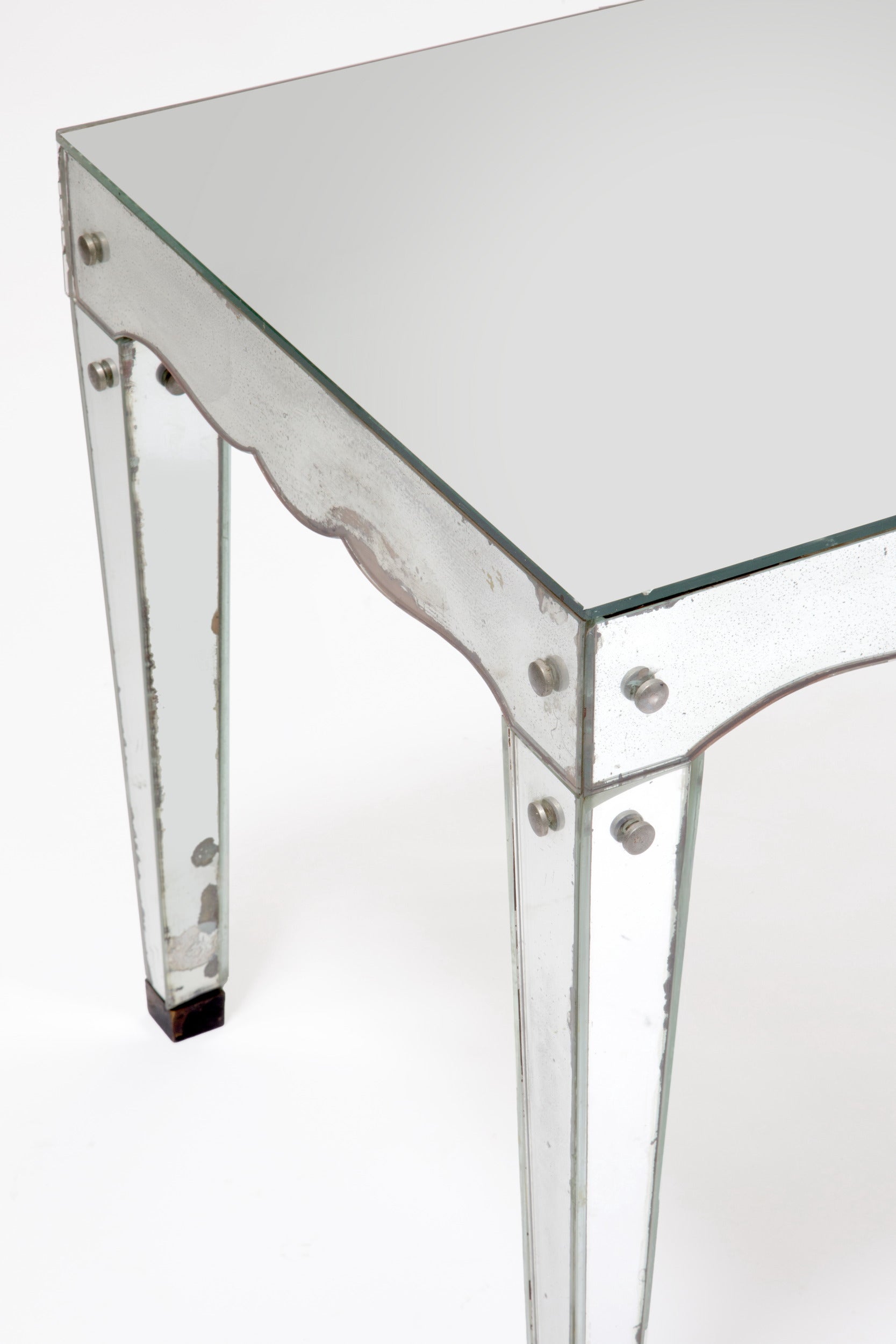 Tavolo salotto anni 40. Anima il legno interamente ricoperto di specchi sagomati, piedi in metallo tinto. Produzione Francese.