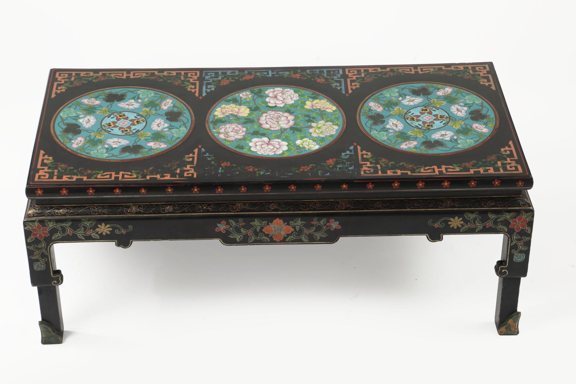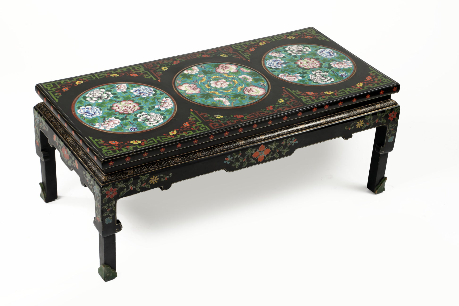 Tavolo basso, inizi sec. XX, in legno laccato, centrati da tre dischi in smalto cloisonnè con decorazioni floreali. Manifattura cinese.