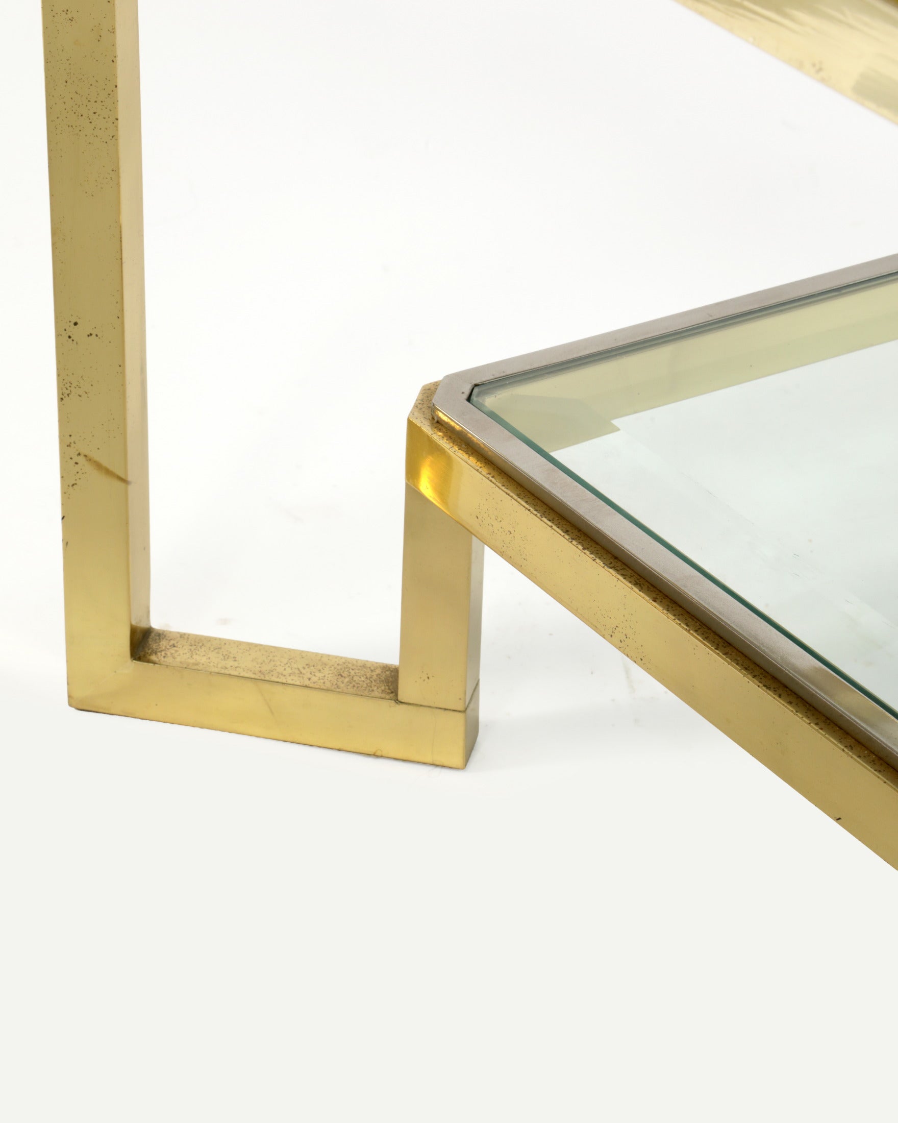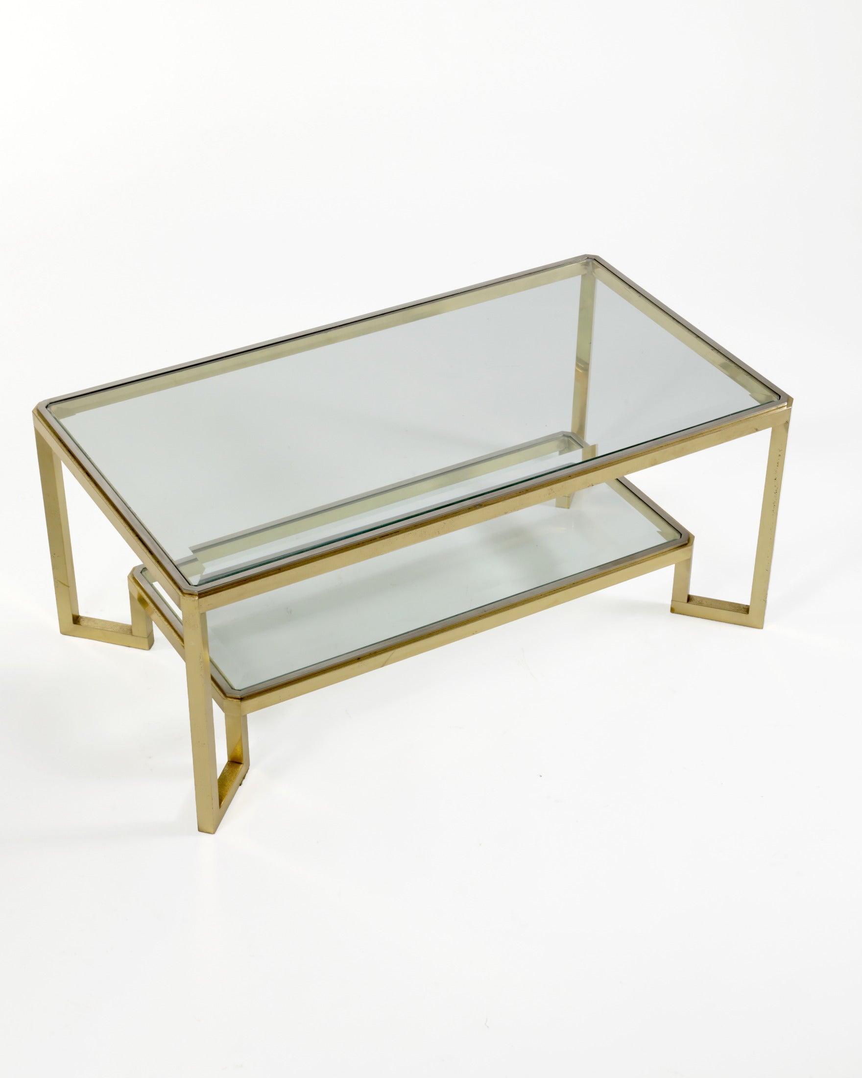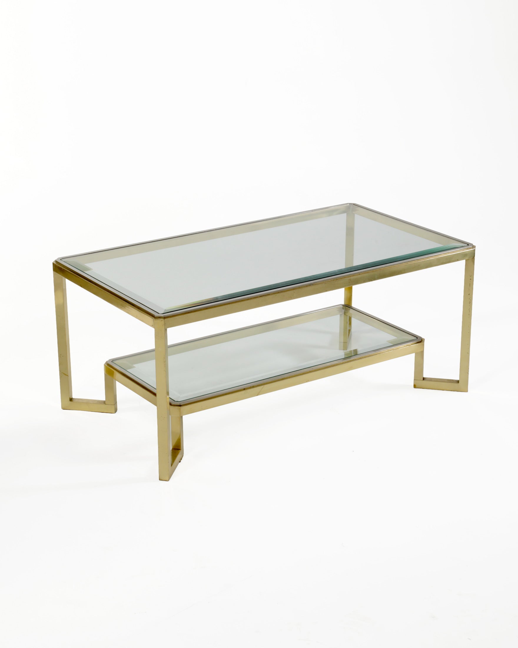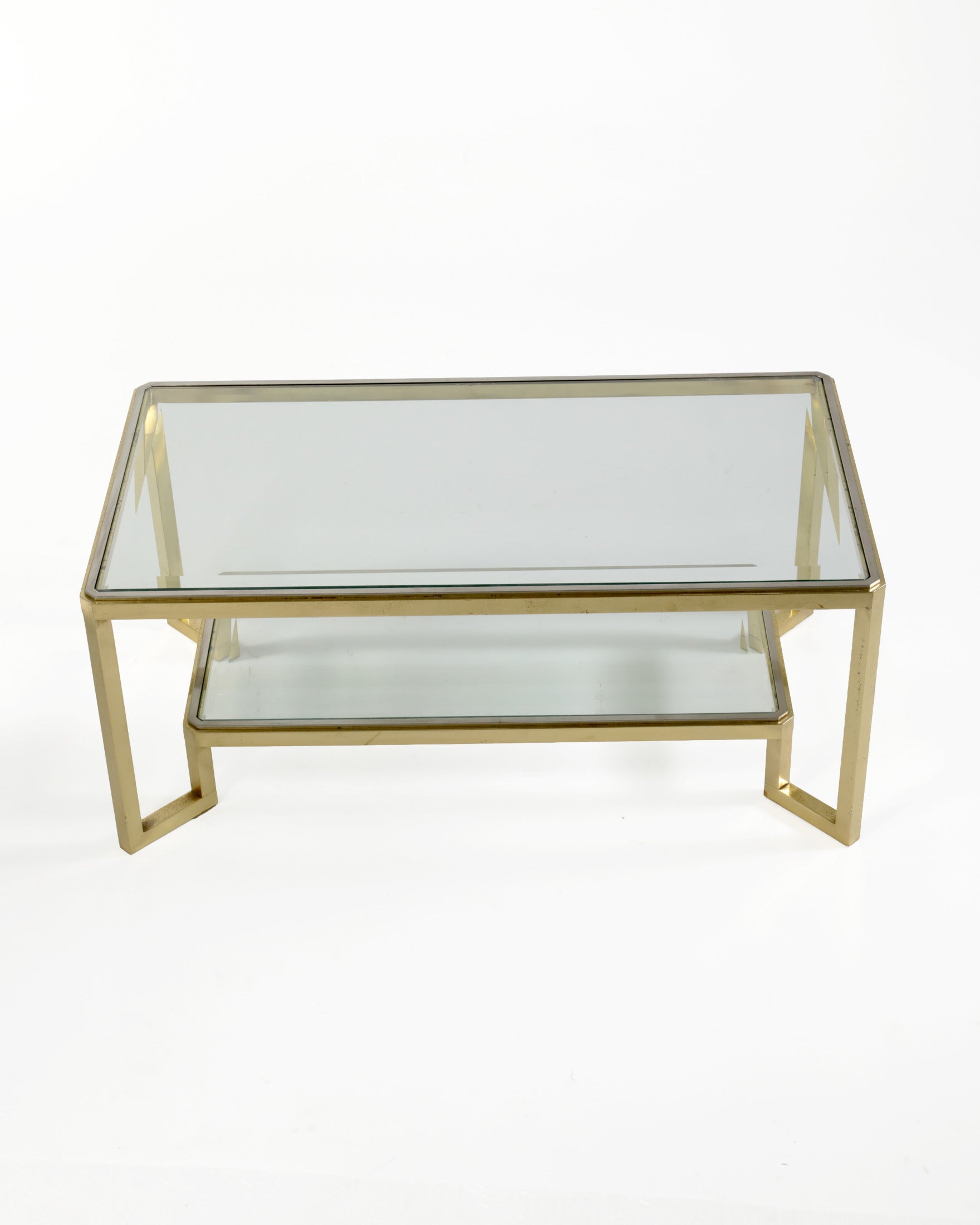Tavolo salotto anni 70, attribuibile a Romeo Rega. Struttura rettangolare in ottone e acciaio, a due ripiani in vetro molato trasparente. Produzione Italiana.