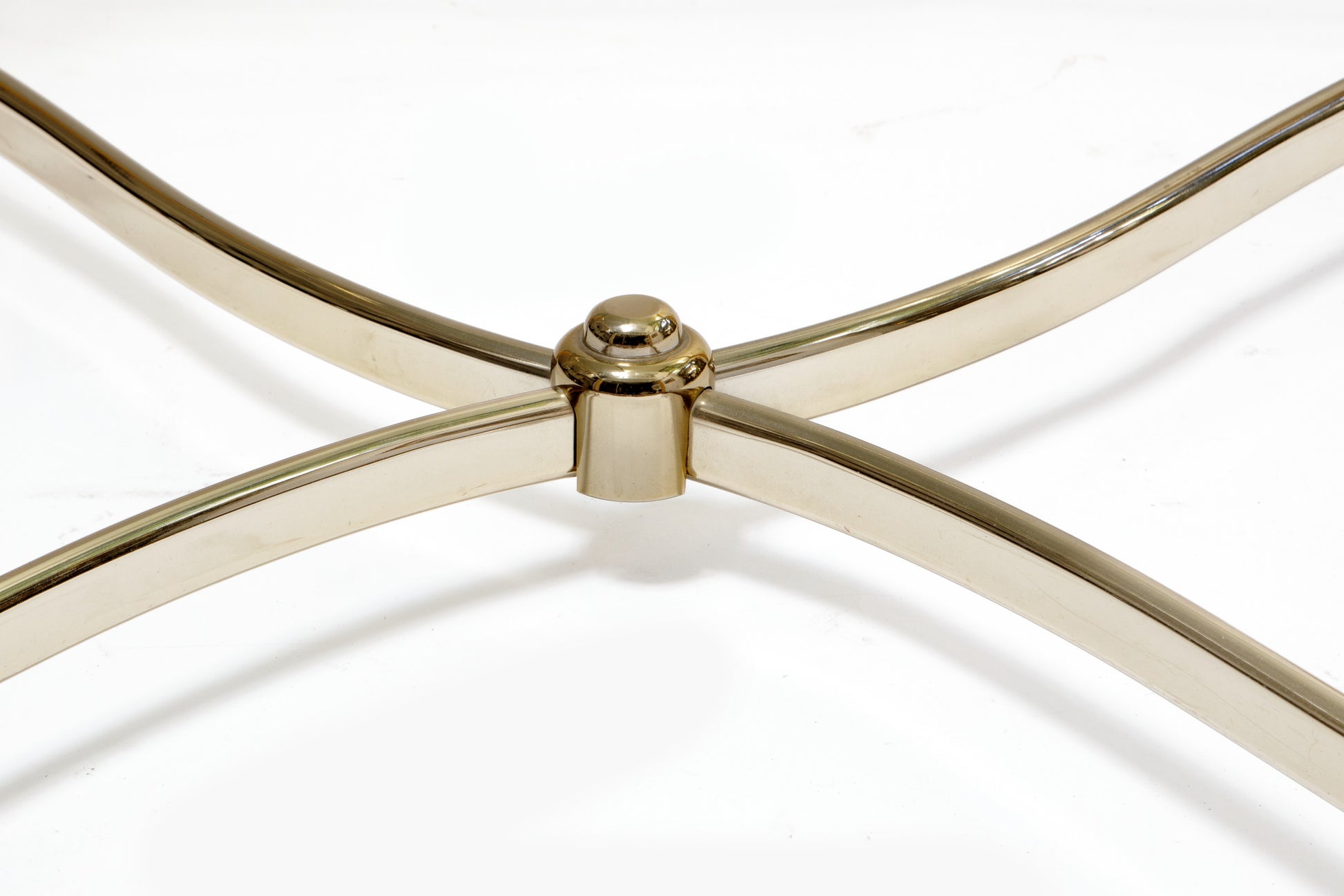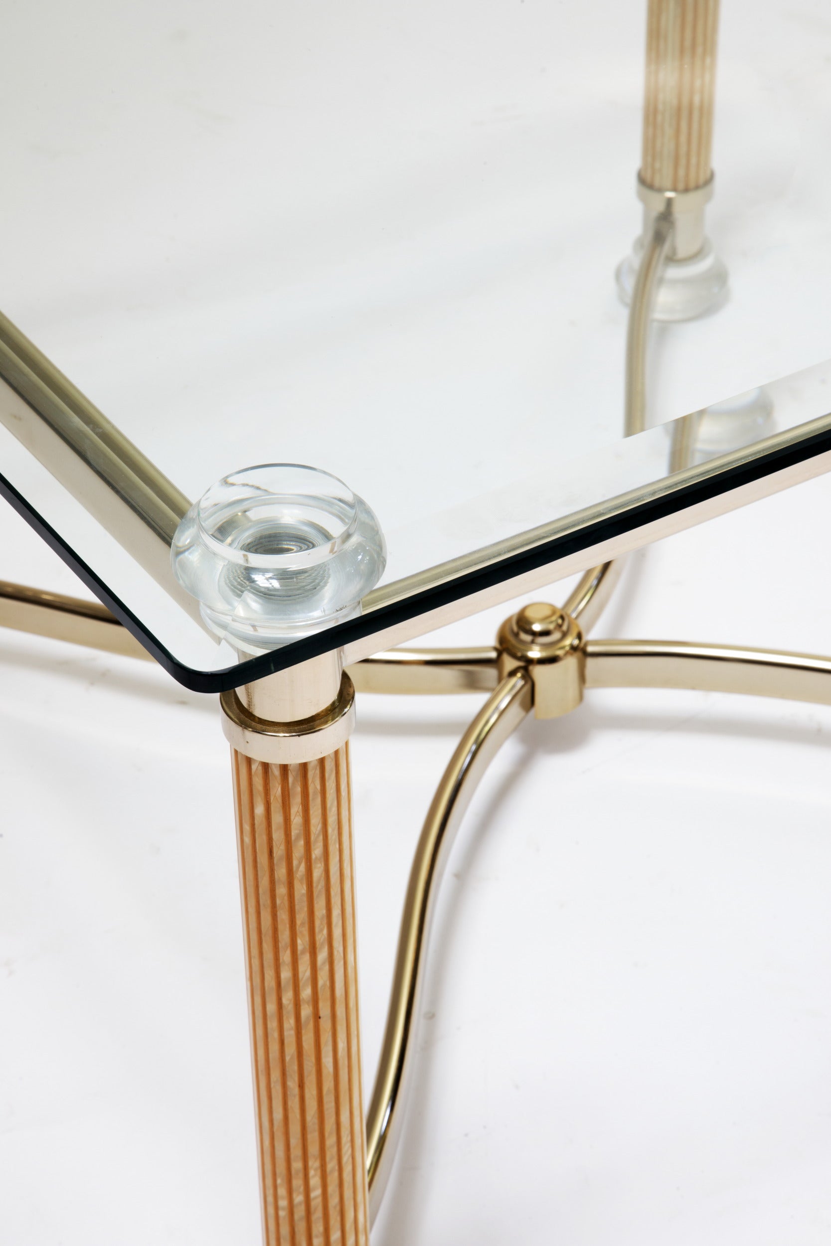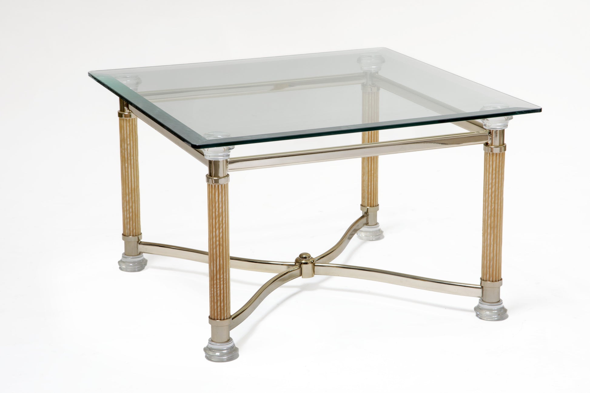 Tavolo anni 70, di Fabrizio Smania per Studio Smania. Struttura in ottone, zampe ricoperte di piccoli listelli in lucite con inserti in madreperla, zampe in Plexiglass. Piano quadrato in cristallo molato. Produzione Italiana.