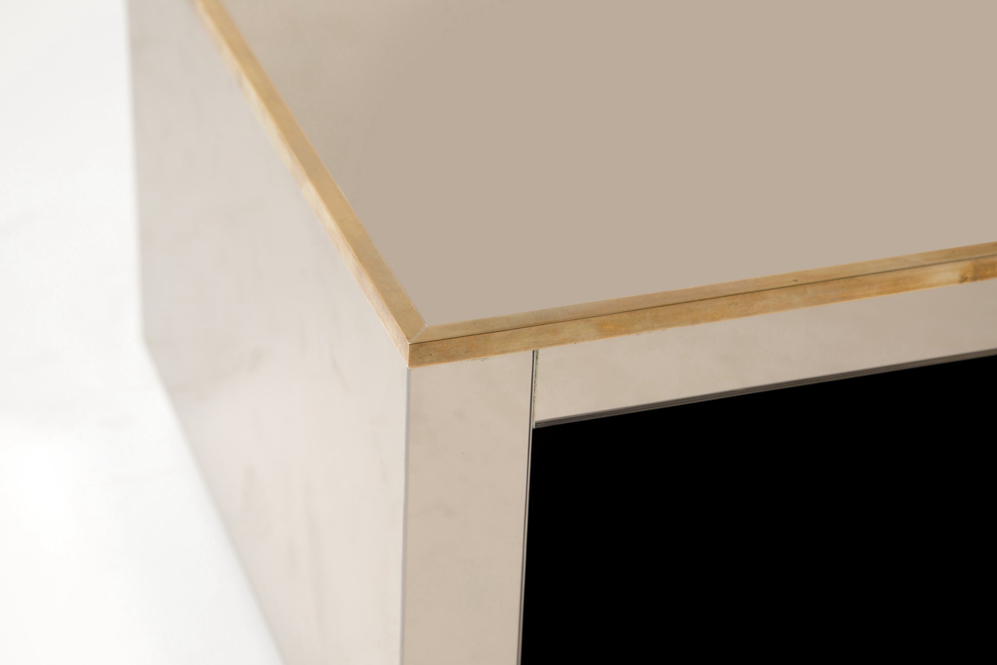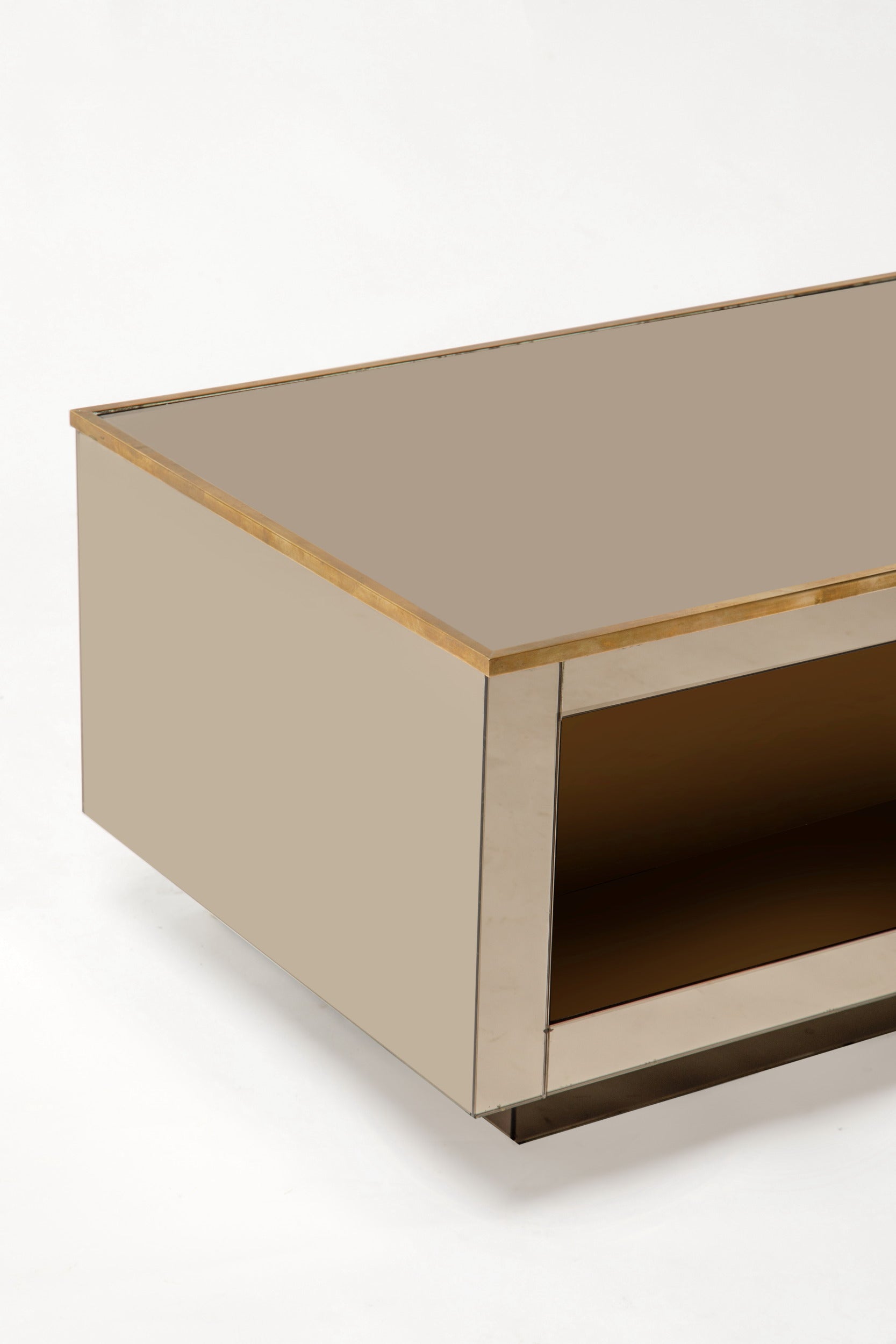 Tavolo salotto anni 70, ricoperto di specchi applicati con profilo in ottone, retro in legno laccato nero opaco. Un ripiano interno. Produzione Italiana.