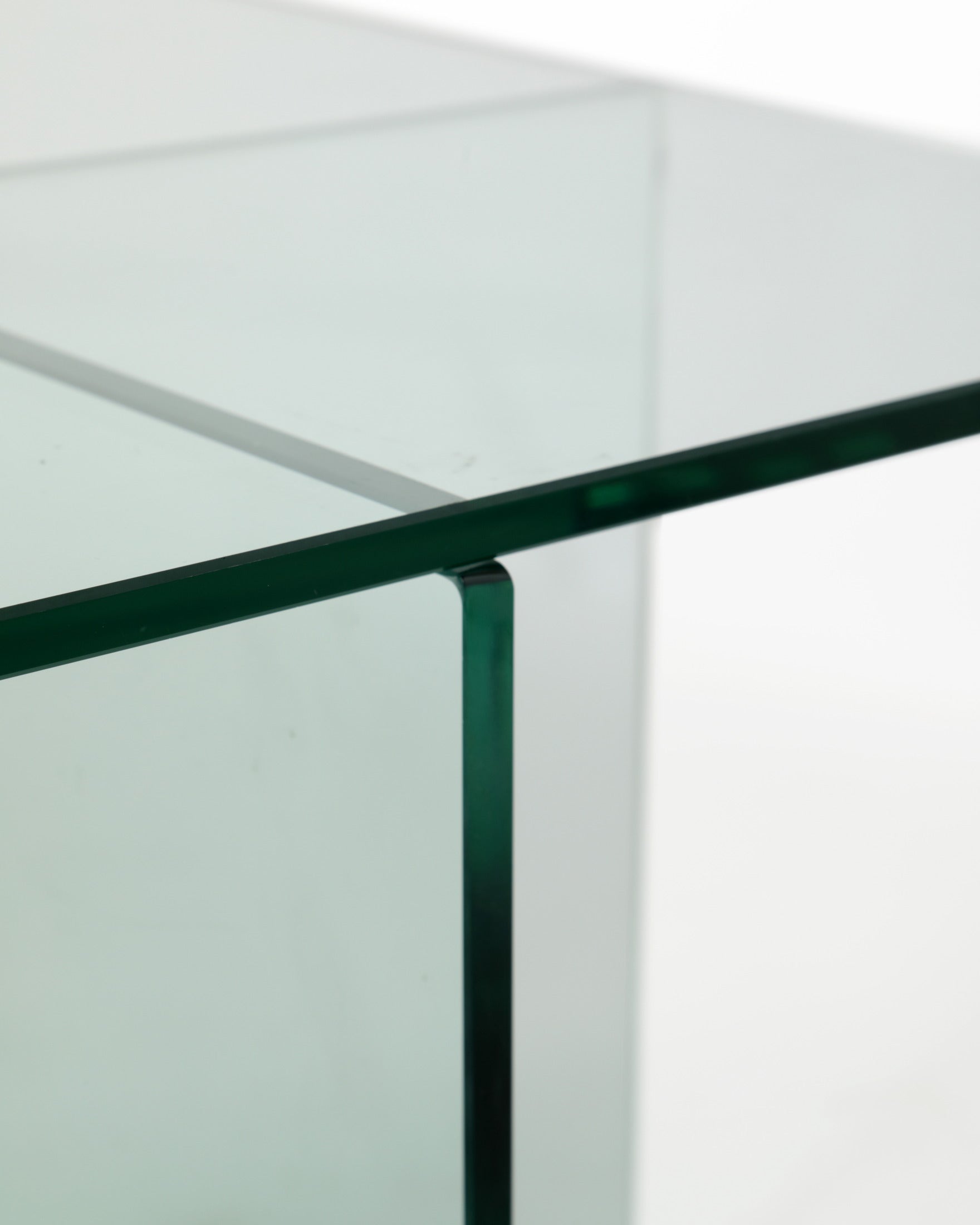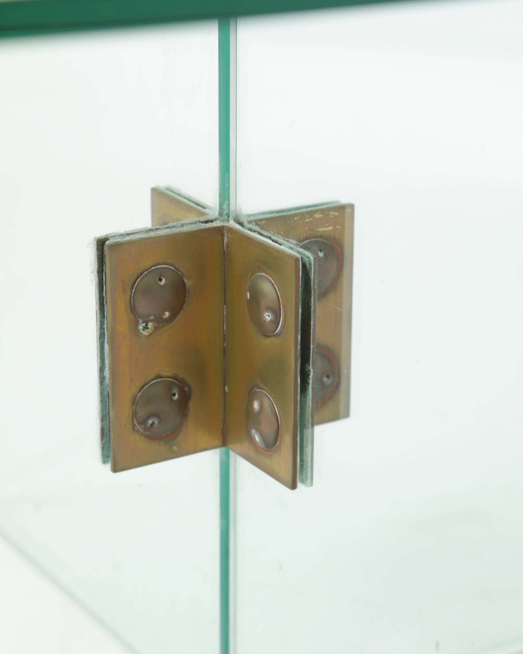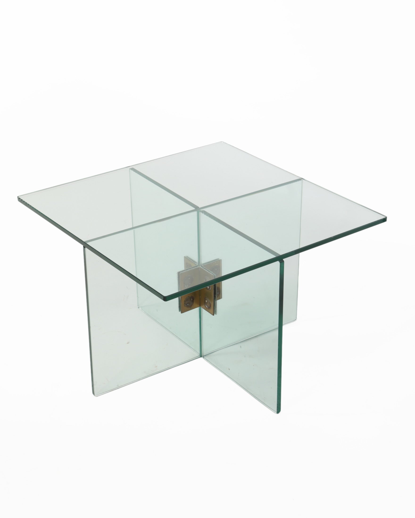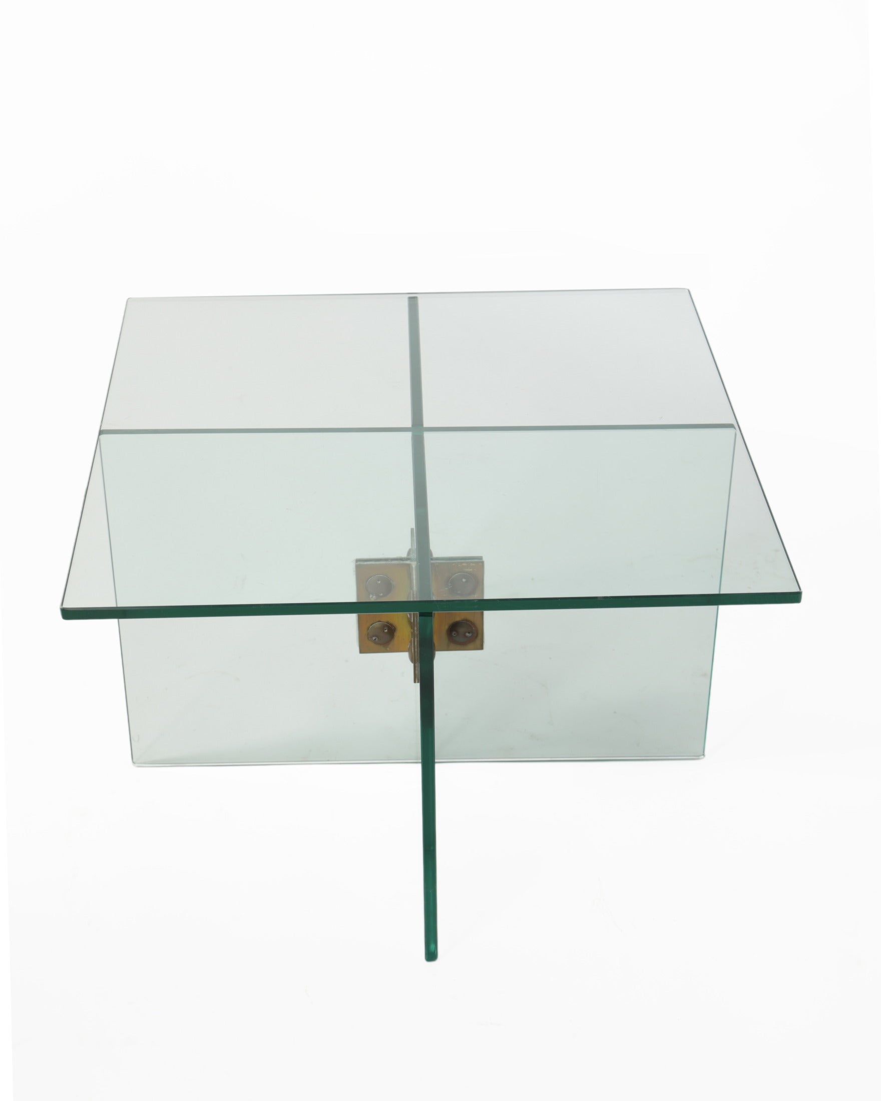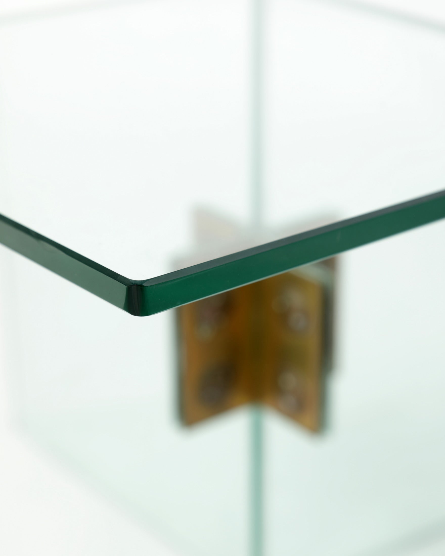 Tavolo salotto anni 70 in vetro verde nilo, staffe in ottone dorato.