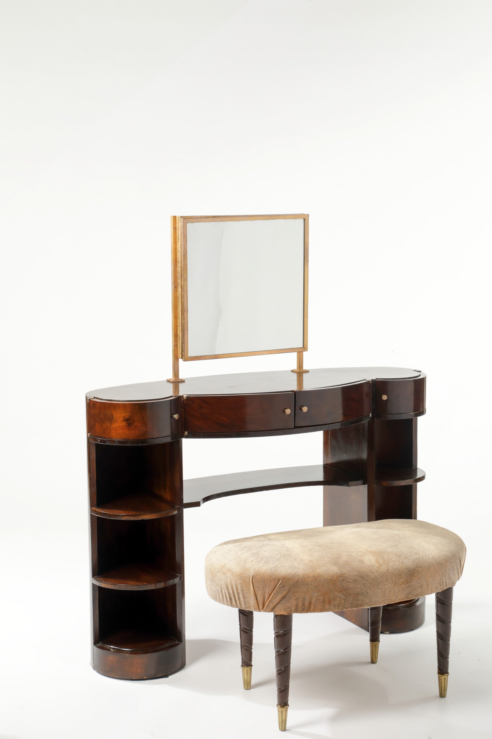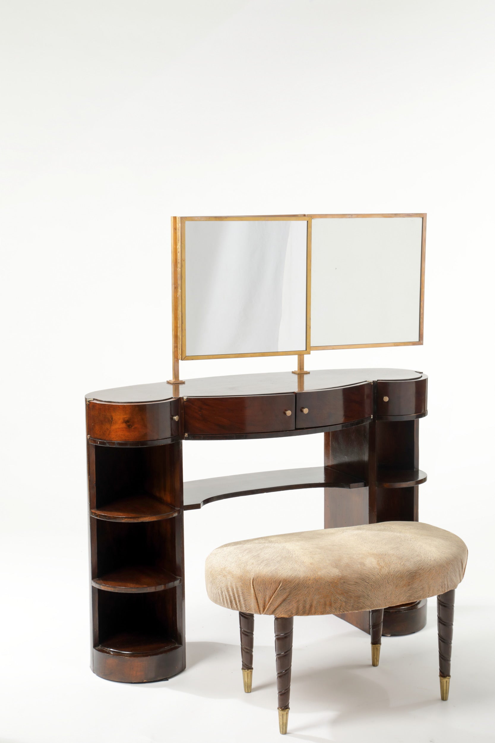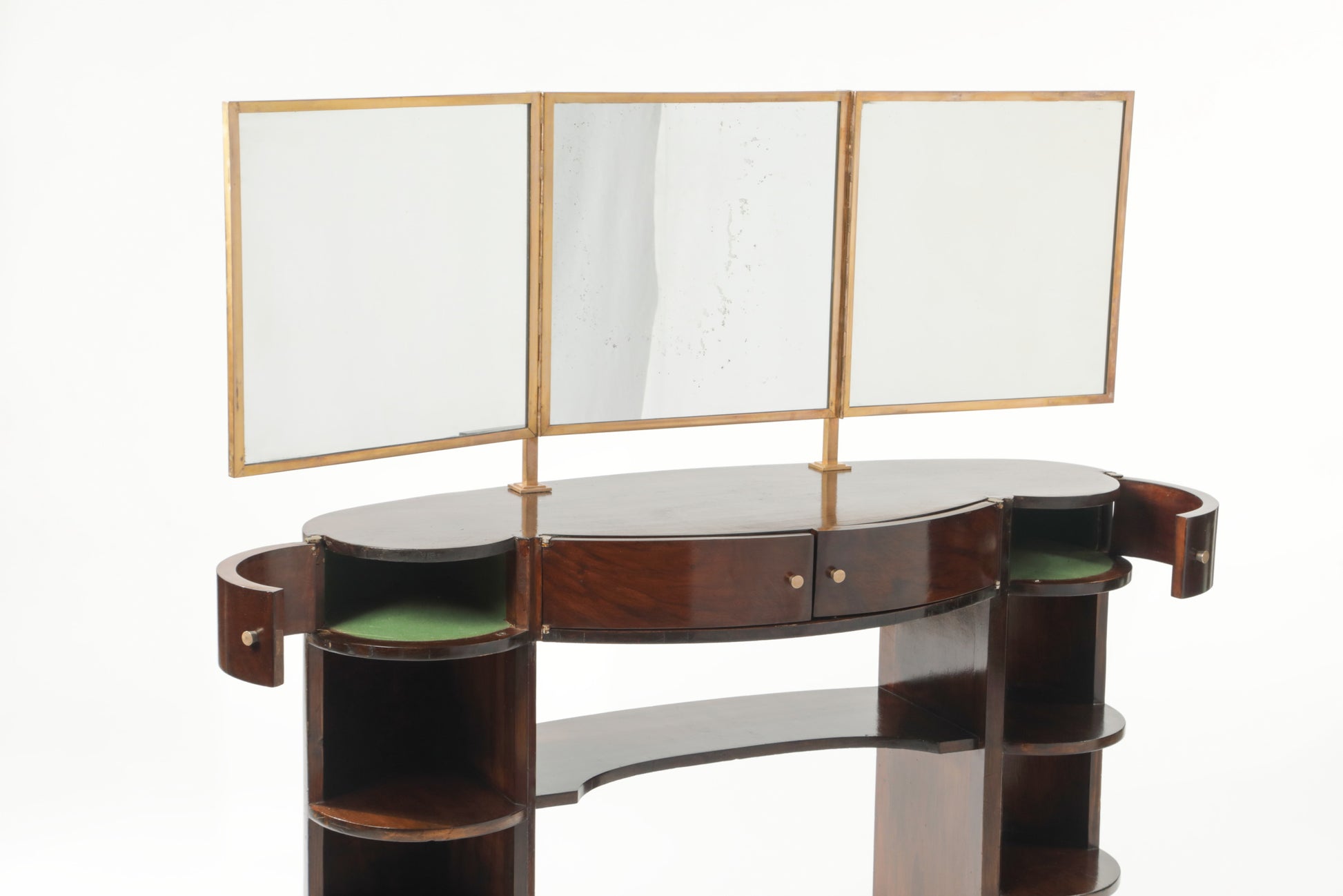 Toletta anni 40, struttura a fagiolo in mogano con due cassetti centrali e due laterali, un ripiano centrale e sei laterali. Specchiera in ottone a tre ante regolabili. Produzione Italiana.