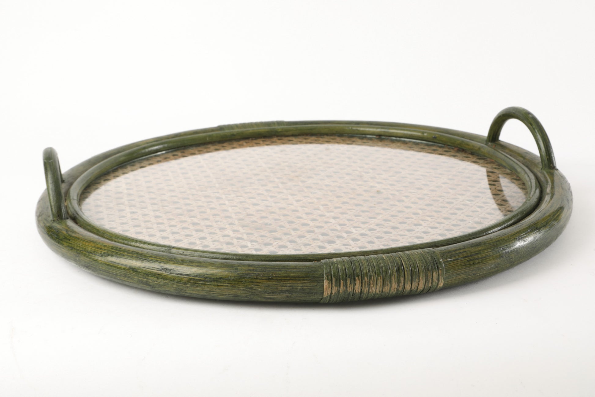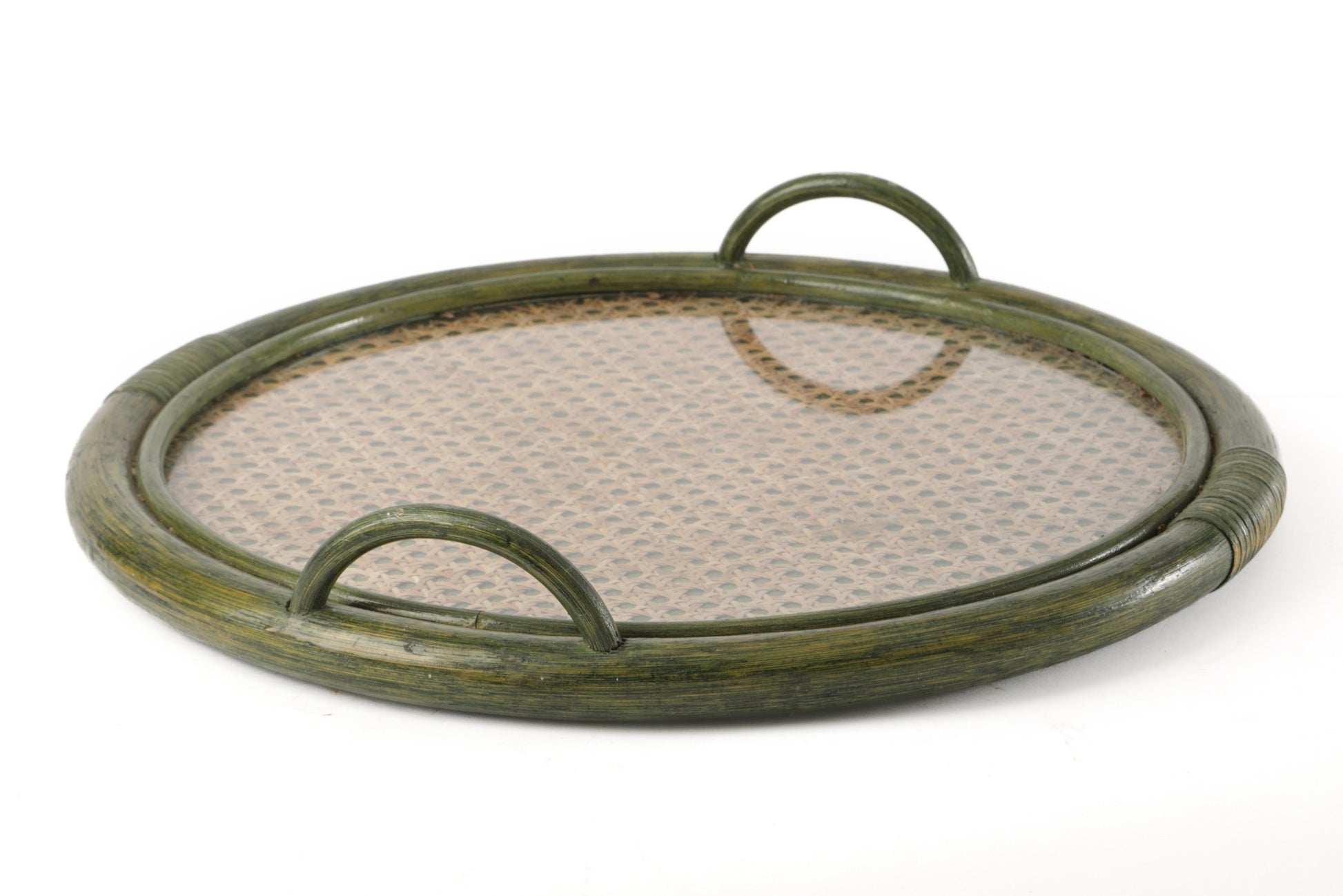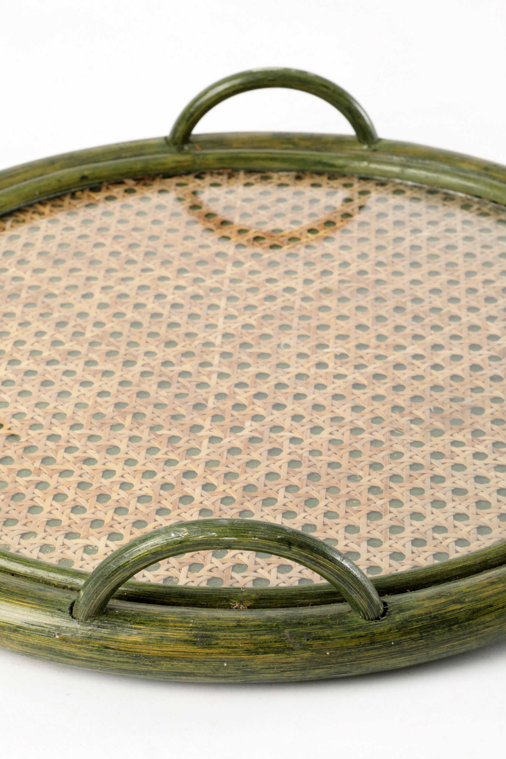 Vassoio tondo anni 70, con cornice e manici in bamboo tinto verde e piano in paglia di Vienna e plexiglass. Produzione Italiana.