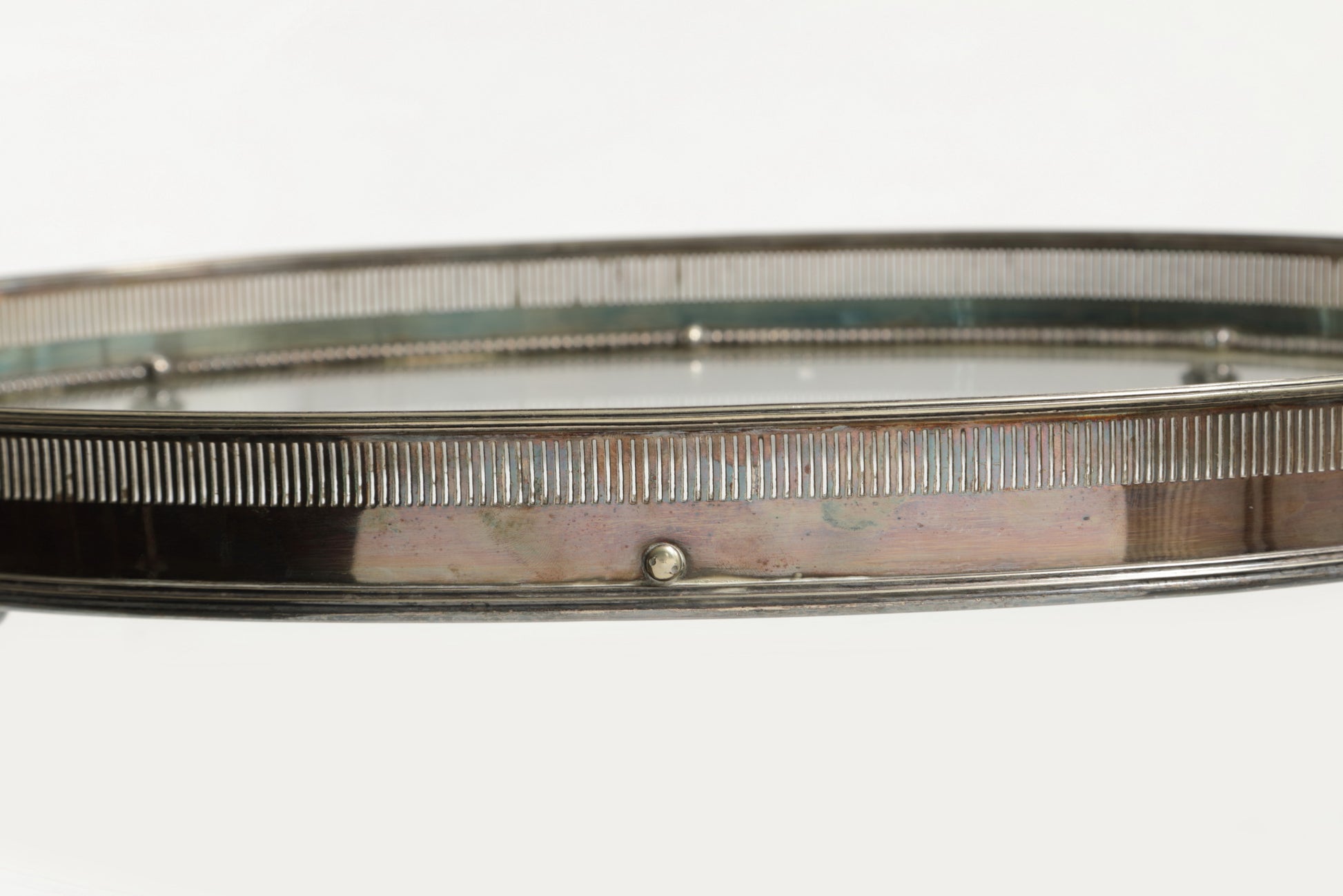 Vassoio anni 60, piano in vetro trasparente, cornice a ringhiera e manici in silver plated. Produzione Inglese.