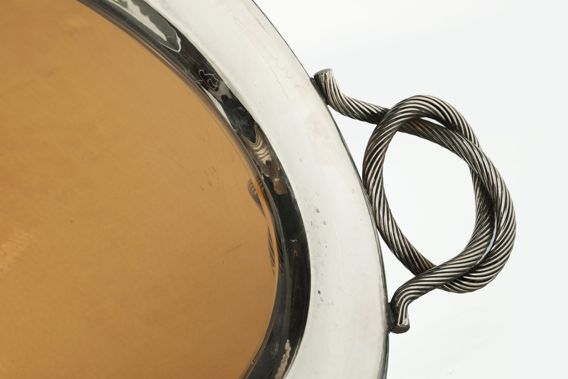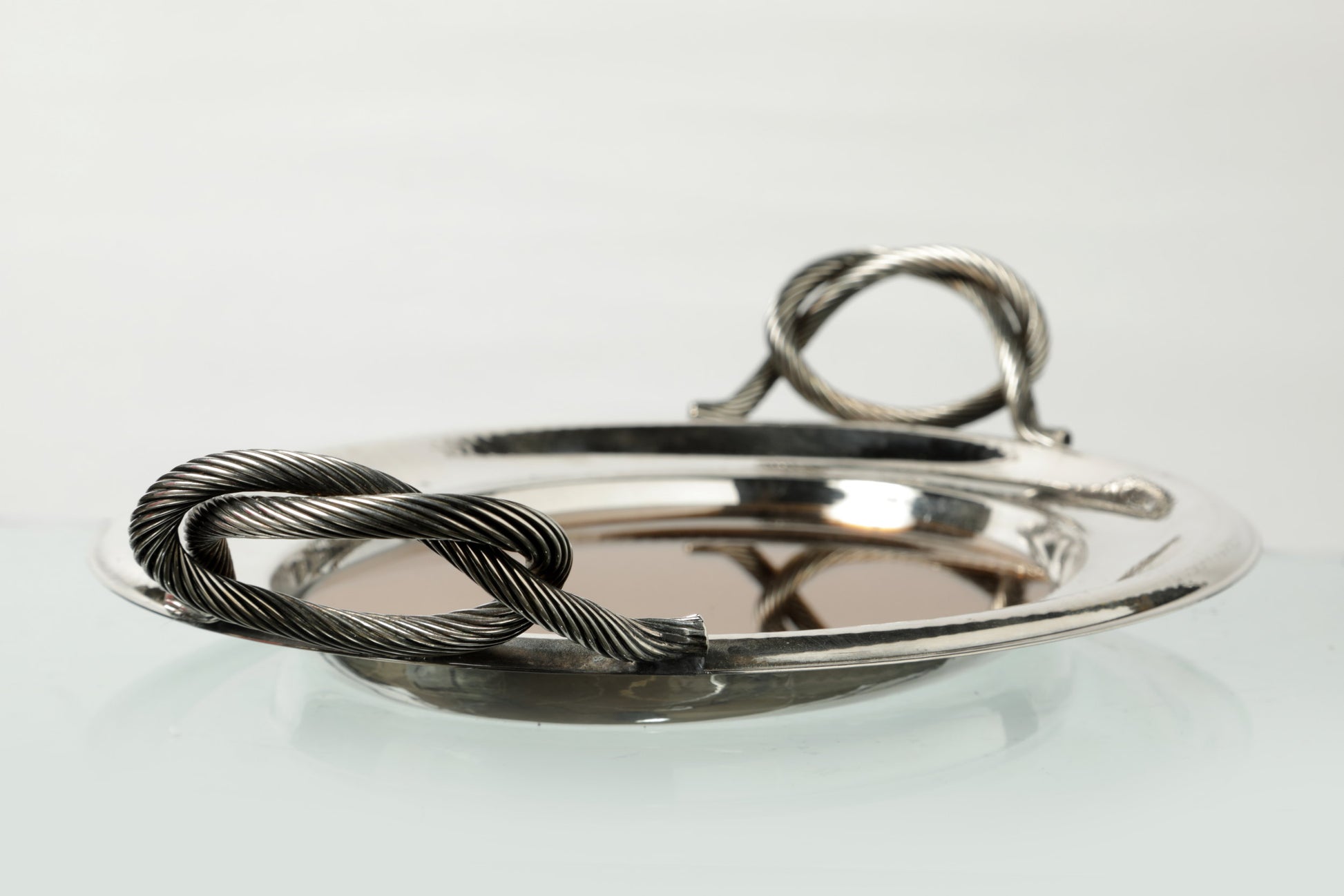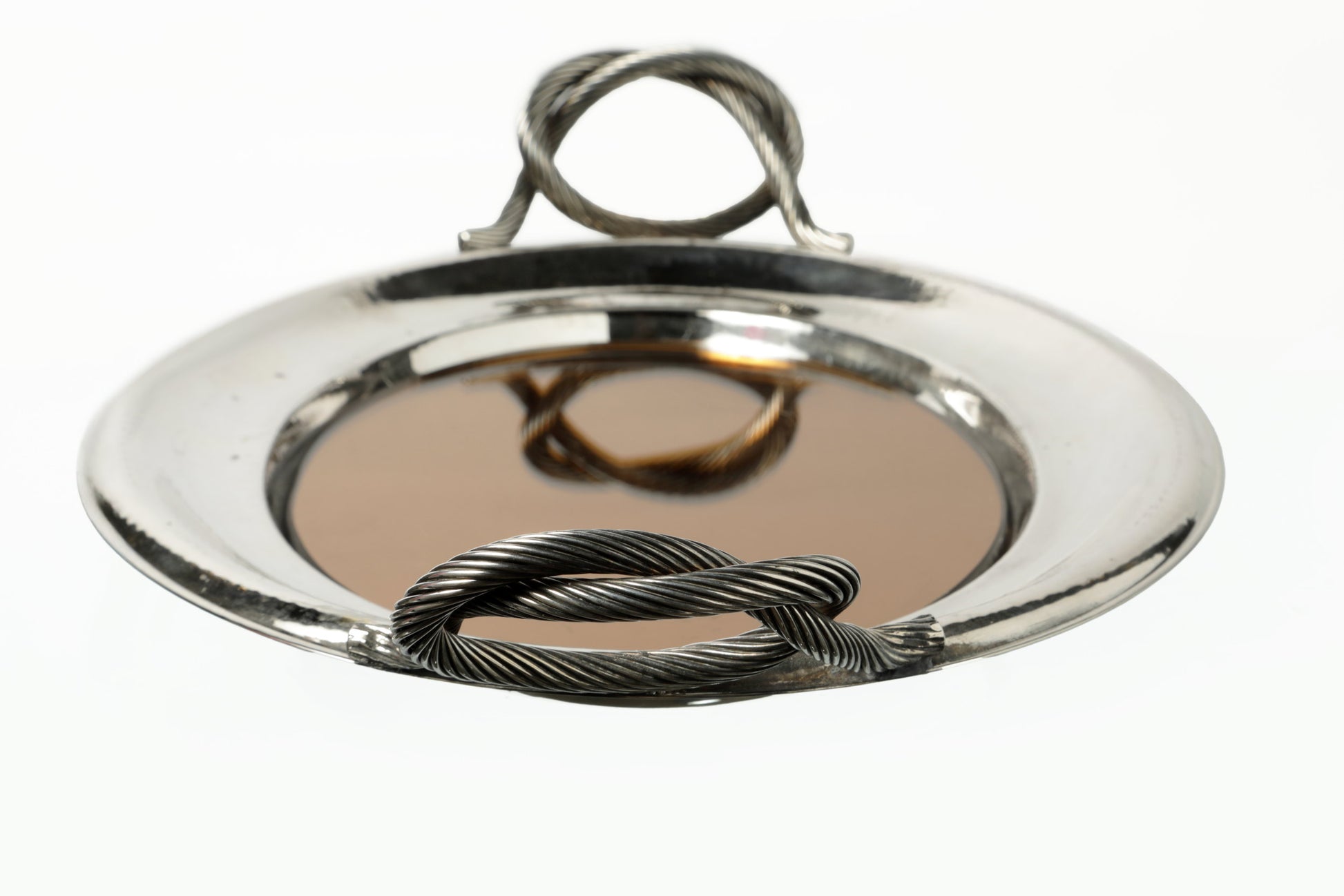 Vassoio ovale anni 70, piano in vetro specchiato bronzato con cornice in metallo argentato e manici a nodo. Produzione Italiana.